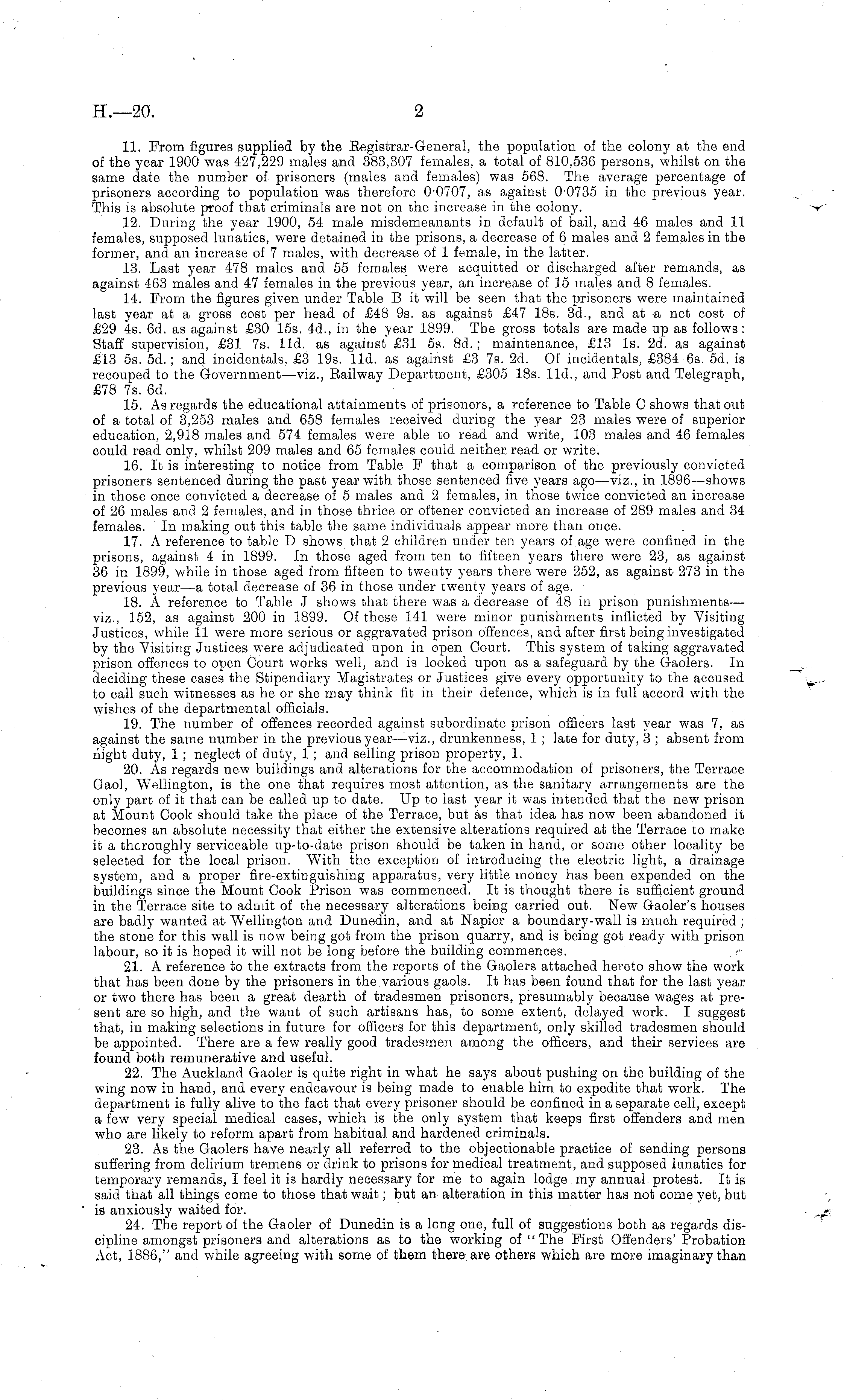 11. From figures supplied by the Registrar-General, the population of the colony at the end of the year 1900 was 427,229 males and 383,307 females, a total of 810,536 persons, whilst on the same date the number of prisoners (males and females) was 568. The average percentage of prisoners according to population was therefore 00707, as against 00735 in the previous year. This is absolute proof that criminals are not on the increase in the colony. 12. During the year 1900, 54 male misdemeanants in default of bail, and 46 males and 11 females, supposed lunatics, were detained in the prisons, a decrease of 6 males and 2 females in the former, and an increase of 7 males, with decrease of 1 female, in the latter. 13. Last year 478 males and 55 females were acquitted or discharged after remands, as against 463 males and 47 females in the previous year, an increase of 15 males and 8 females. 14. From the figures given under Table B it will be seen that the prisoners were maintained last year at a gross cost per head of £48 9s. as against £47 18s. 3d., and at a net cost of £29 4s. 6d. as against £30 15s. 4d., in the year 1899. The gross totals are made up as follows: Staff supervision, £31 7s. lid. as against £31 ss. Bd.; maintenance, £13 Is. 2d. as against £13 ss. 5d.; and incidentals, £3 19s. lid. as against £3 7s. 2d. Of incidentals, £384 6s. sd. is recouped to the Government —viz., Railway Department, £305 18s. lid., and Post and Telegraph, £78 7s. 6d. 15. As regards the educational attainments of prisoners, a reference to Table G shows that out of a total of 3,253 males and 658 females received during the year 23 males were of superior education, 2,918 males and 574 females were able to read and write, 103 males and 46 females could read only, whilst 209 males and 65 females could neither read or write. 16. It is interesting to notice from Table F that a comparison of the previously convicted prisoners sentenced during the past year with those sentenced five years ago—viz., in 1896 —shows in those once convicted a decrease of 5 males and 2 females, in those twice convicted an increase of 26 males and 2 females, and in those thrice or oftener convicted an increase of 289 males and 34 females. In making out this table the same individuals appear more than. once. 17. A reference to table D shows that 2 children under ten years of age were confined in the prisons, against 4 in 1899. In those aged from ten to fifteen years there were 23, as against 36 in 1899, while in those aged from fifteen to twenty years there were 252, as against 273 in the previous year—a total decrease of 36 in those under twenty years of age. 18. A reference to Table J shows that there was a decrease of 48 in prison punishments— viz., 152, as against 200 in 1899. Of these 141 were minor punishments inflicted by Visiting Justices, while 11 were more serious or aggravated prison offences, and after first being investigated by the Visiting Justices were adjudicated upon in open Court. This system of taking aggravated prison offences to open Court works well, and is looked upon as a safeguard by the Gaolers. In deciding these cases the Stipendiary Magistrates or Justices give every opportunity to the accused to call such witnesses as he or she may think fit in their defence, which is in full accord with the wishes of the departmental officials. 19. The number of offences recorded against subordinate prison officers last year was 7, as against the same number in the previous year—viz., drunkenness, 1 ; late for duty, 3 ; absent from night duty, 1 ; neglect of duty, 1 ; and selling prison property, 1. 20. As regards new buildings and alterations for the accommodation of prisoners, the Terrace Gaol, Wellington, is the one that requires most attention, as the sanitary arrangements are the only part of it that can be called up to date. Up to last year it was intended that the new prison at Mount Cook should take the place of the Terrace, but as that idea has now been abandoned it becomes an absolute necessity that either the extensive alterations required at the Terrace to make it a thoroughly serviceable up-to-date prison should be taken in hand, or some other locality be selected for the local prison. With the exception of introducing the electric light, a drainage system, and a proper fire-extinguishmg apparatus, very little money has been expended on the buildings since the Mount Cook Prison was commenced. It is thought there is sufficient ground in the Terrace site to admit of the necessary alterations being carried out. New Gaoler's houses are badly wanted at Wellington and Dunedin, and at Napier a boundary-wall is much required ; the stone for this wall is now being got from the prison quarry, and is being got ready with prison labour, so it is hoped it will not be long before the building commences. 21. A reference to the extracts from the reports of the Gaolers attached hereto show the work that has been done by the prisoners in the various gaols. It has been found that for the last year or two there has been a great dearth of tradesmen prisoners, presumably because wages at present are so high, and the want of such artisans has, to some extent, delayed work. I suggest that, in making selections in future for officers for this department, only skilled tradesmen should be appointed. There are a few really good tradesmen among the officers, and their services are found both remunerative and useful. 22. The Auckland Gaoler is quite right in what he says about pushing on the building of the wing now in hand, and every endeavour is being made to enable him to expedite that work. The department is fully alive to the fact that every prisoner should be confined in a separate cell, except a few very special medical cases, which is the only system that keeps first offenders and men who are likely to reform apart from habitual and hardened criminals. 23. As the Gaolers have nearly all referred to the objecti