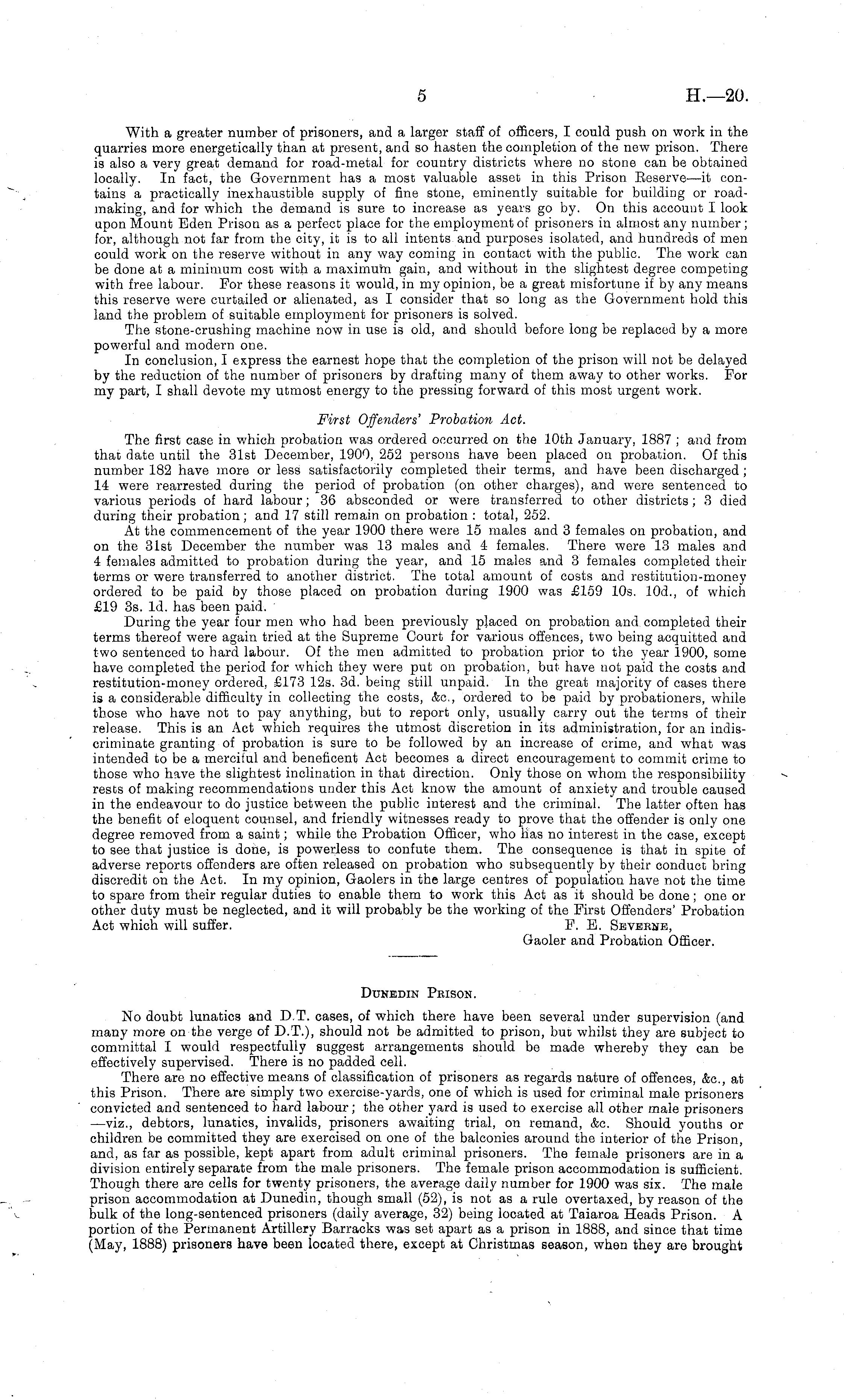With a greater number of prisoners, and a larger staff of officers, I could push on work in the quarries more energetically than at present, and so hasten the completion of the new prison. There is also a very great demand for road-metal for country districts where no stone can be obtained locally. In fact, the Government has a most valuable asset in this Prison Reserve—it contains a practically inexhaustible supply of fine stone, eminently suitable for building or roadmaking, and for which the demand is sure to increase as years go by. On this account I look upon Mount Eden Prison as a perfect place for the employment of prisoners in almost any number; for, although not far from the city, it is to all intents and purposes isolated, and hundreds of men could work on the reserve without in any way coming in contact with the public. The work can be done at a minimum cost with a maximum gain, and without in the slightest degree competing with free labour. For these reasons it would, in my opinion, be a great misfortune if by any means this reserve were curtailed or alienated, as I consider that so long as the Government hold this land the problem of suitable employment for prisoners is solved. The stone-crushing machine now in use is old, and should before long be replaced by a more powerful and modern one. In conclusion, I express the earnest hope that the completion of the prison will not be delayed by the reduction of the number of prisoners by drafting many of them away to other works. For my part, I shall devote my utmost energy to the pressing forward of this most urgent work. First Offenders' Probation Act. The first case in which probation was ordered occurred on the 10th January, 1887 ; and from that date until the 31st December, 1900, 252 persons have been placed on probation. Of this number 182 have more or less satisfactorily completed their terms, and have been discharged ; 14 were rearrested during the period of probation (on other charges), and were sentenced to various periods of hard labour; 36 absconded or were transferred to other districts; 3 died during their probation; and 17 still remain on probation : total, 252. At the commencement of the year 1900 there were 15 males and 3 females on probation, and on the 31st December the number was 13 males and 4 females. There were 13 males and 4 females admitted to probation during the year, and 15 males and 3 females completed their terms or were transferred to another district. The total amount of costs and restitution-money ordered to be paid by those placed on probation during 1900 was £159 10s. 10d., of which £19 3s. Id. has been paid. During the year four men who had been previously placed on probation and completed their terms thereof were again tried at the Supreme Court for various offences, two being acquitted and two sentenced to hard labour. Of the men admitted to probation prior to the year 1900, some have completed the period for which they were put on probation, but have not paid the costs and restitution-money ordered, £173 12s. 3d. being still unpaid. In the great majority of cases there is a considerable difficulty in collecting the costs, &c, ordered to be paid by probationers, while those who have not to pay anything, but to report only, usually carry out the terms of their release. This is an Act which requires the utmost discretion in its administration, for an indiscriminate granting of probation is sure to be followed by an increase of crime, and what was intended to be a merciful and beneficent Act becomes a direct encouragement to commit crime to those who have the slightest inclination in that direction. Only those on whom the responsibility rests of making recommendations under this Act know the amount of anxiety and trouble caused in the endeavour to do justice between the public interest and the criminal. The latter often has the benefit of eloquent counsel, and friendly witnesses ready to prove that the offender is only one degree removed from a saint; while the Probation Officer, who lias no interest in the case, except to see that justice is done, is powerless to confute them. The consequence is that in spite of adverse reports offenders are often released on probation who subsequently by their conduct bring discredit on the Act. In my opinion, Gaolers in the large centres of population have not the time to spare from their regular duties to enable them to work this Act as it should be done; one or other duty must be neglected, and it will probably be the working of the First Offenders' Probation Act which will suffer. F. E. Sevekue, Gaoler and Probation Officer.