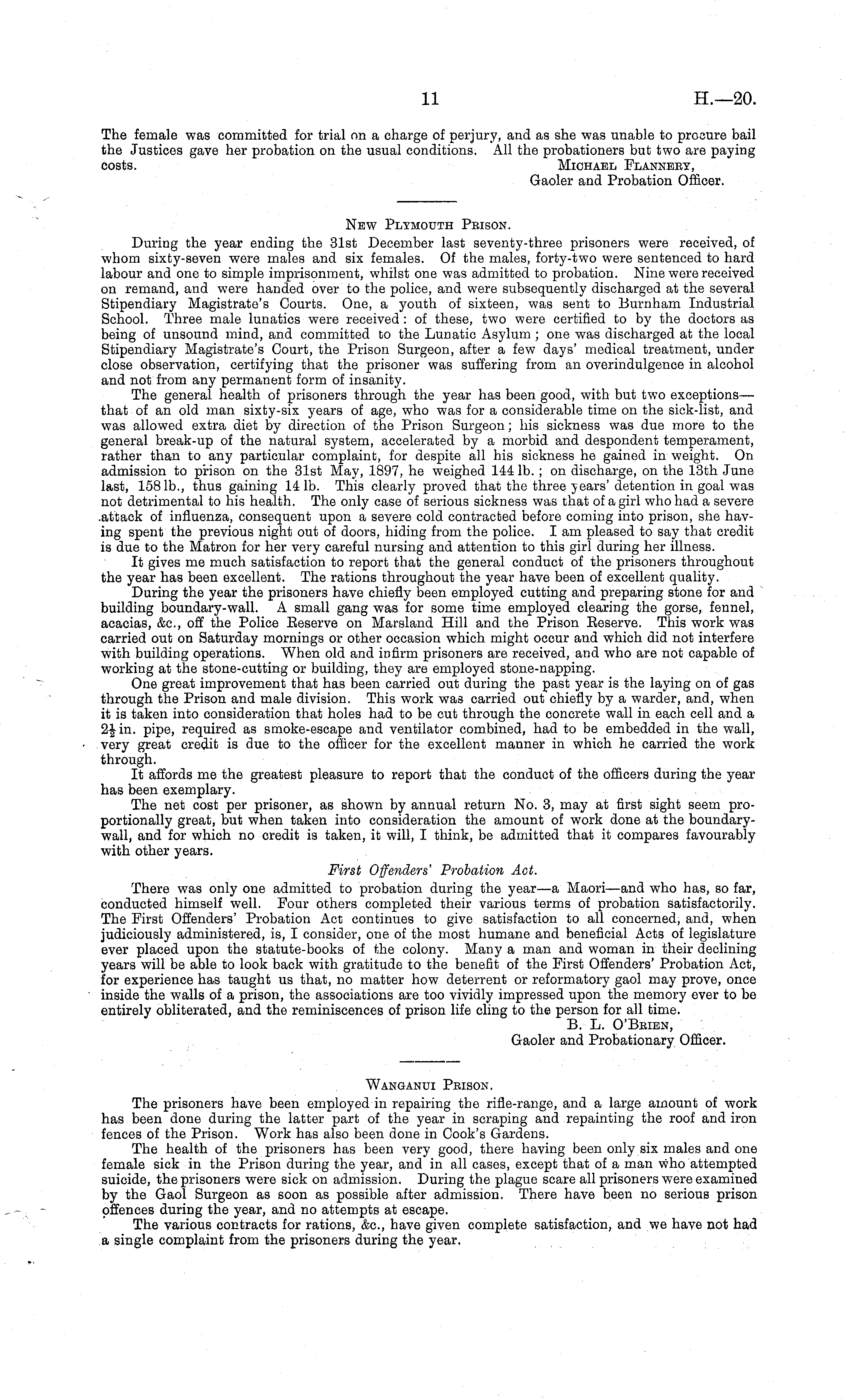 New Plymouth Peison. During the year ending the 31st December last seventy-three prisoners were received, of whom sixty-seven were males and six females. Of the males, forty-two were sentenced to hard labour and one to simple imprisonment, whilst one was admitted to probation. Nine were received on remand, and were handed over to the police, and were subsequently discharged at the several Stipendiary Magistrate's Courts. One, a youth of sixteen, was sent to Burnham Industrial School. Three male lunatics were received: of these, two were certified to by the doctors as being of unsound mind, and committed to the Lunatic Asylum; one was discharged at the local Stipendiary Magistrate's Court, the Prison Surgeon, after a few days' medical treatment, under close observation, certifying that the prisoner was suffering from an overindulgence in alcohol and not from any permanent form of insanity. The general health of prisoners through the year has been good, with but two exceptions— that of an old man sixty-six years of age, who was for a considerable time on the sick-list, and was allowed extra diet by direction of the Prison Surgeon; his sickness was due more to the general break-up of the natural system, accelerated by a morbid and despondent temperament, rather than to any particular complaint, for despite all his sickness he gained in weight. On admission to prison on the 31st May, 1897, he weighed 144 lb. ; on discharge, on the 13th June last, 1581b., thus gaining 141b. This clearly proved that the three years'detention in goal was not detrimental to his health. The only case of serious sickness was that of a girl who had a severe .attack of influenza, consequent upon a severe cold contracted before coming into prison, she having spent the previous night out of doors, hiding from the police. lam pleased to say that credit is due to the Matron for her very careful nursing and attention to this girl during her illness. It gives me much satisfaction to report that the general conduct of the prisoners throughout the year has been excellent. The rations throughout the year have been of excellent quality. During the year the prisoners have chiefly been employed cutting and preparing stone for and building boundary-wall. A small gang was for some time employed clearing the gorse, fennel, acacias, &c, off the Police Eeserve on Marsland Hill and the Prison Eeserve. This work was carried out on Saturday mornings or other occasion which might occur and which did not interfere with building operations. When old and infirm prisoners are received, and who are not capable of working at the stone-cutting or building, they are employed stone-napping. One great improvement that has been carried out during the past year is the laying on of gas through the Prison and male division. This work was carried out chiefly by a warder, and, when it is taken into consideration that holes had to be cut through the concrete wall in each cell and a 2^-in. pipe, required as smoke-escape and ventilator combined, had to be embedded in the wall, very great credit is due to the officer for the excellent manner in which he carried the work through. It affords me the greatest pleasure to report that the conduct of the officers during the year has been exemplary. The net cost per prisoner, as shown by annual return No. 3, may at first sight seem proportionally great, but when taken into consideration the amount of work done at the boundarywall, and for which no credit is taken, it will, I think, be admitted that it compares favourably with other years. First Offenders' Probation Act. There was only one admitted to probation during the year —a Maori—and who has, so far, conducted himself well. Four others completed their various terms of probation satisfactorily. The First Offenders' Probation Act continues to give satisfaction to all concerned, and, when judiciously administered, is, I consider, one of the most humane and beneficial Acts of legislature ever placed upon the statute-books of the colony. Many a man and woman in their declining years will be able to look back with gratitude to the benefit of the First Offenders' Probation Act, for experience has taught us that, no matter how deterrent or reformatory gaol may prove, once inside the walls of a prison, the associations are too vividly impressed upon the memory ever to be entirely obliterated, and the reminiscences of prison life cling to the person for all time. B. L. O'Beien, Gaoler and Probationary Officer.
