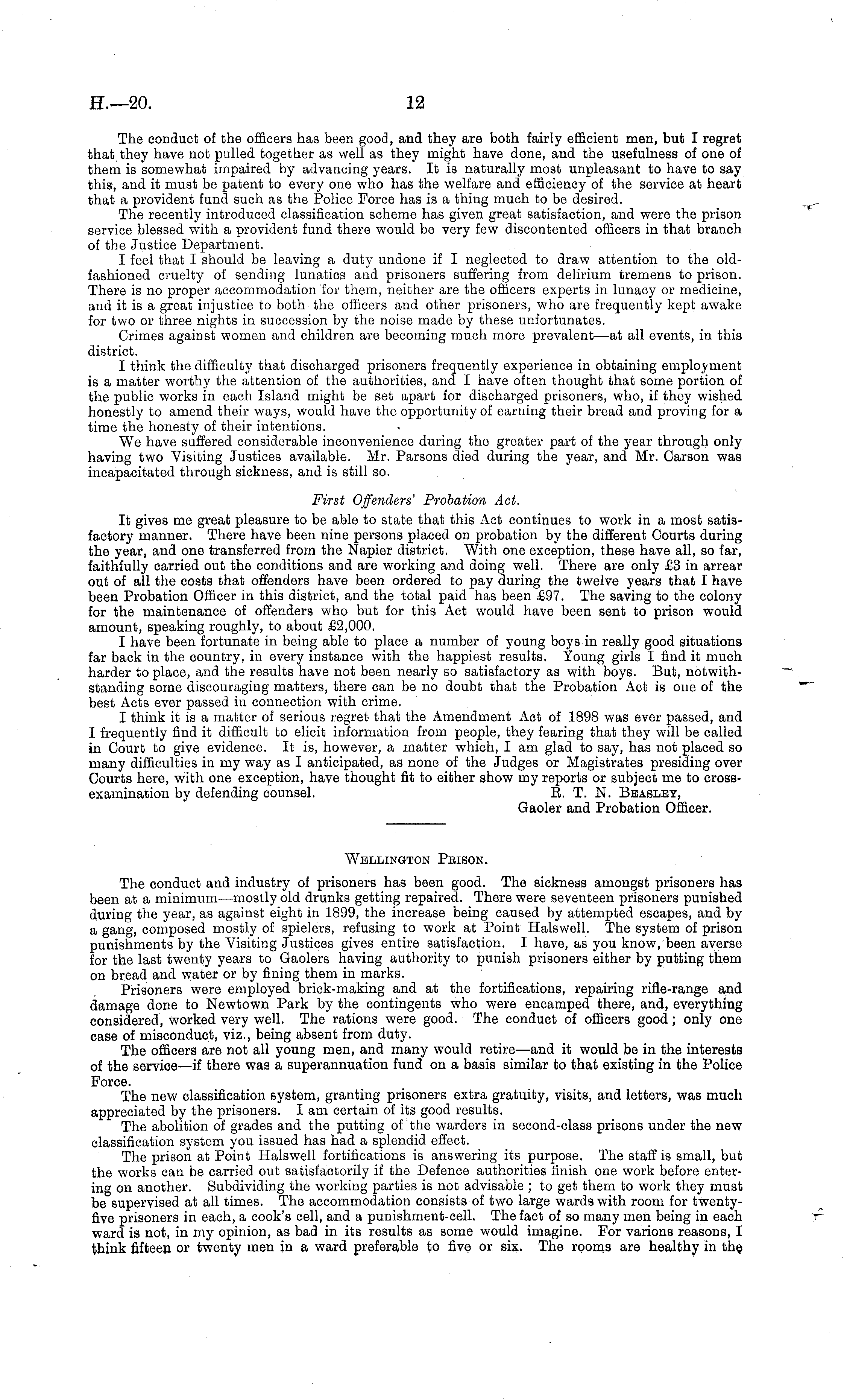 The conduct of the officers has been good, and they are both fairly efficient men, but I regret that they have not pulled together as well as they might have done, and the usefulness of one of them is somewhat impaired by advancing years. It is naturally most unpleasant to have to say this, and it must be patent to every one who has the welfare and efficiency of the service at heart that a provident fund such as the Police Force has is a thing much to be desired. The recently introduced classification scheme has given great satisfaction, and were the prison service blessed with a provident fund there would be very few discontented officers in that branch of the Justice Department. I feel that I should be leaving a duty undone if I neglected to draw attention to the oldfashioned cruelty of sending lunatics and prisoners suffering from delirium tremens to prison. There is no proper accommodation for them, neither are the officers experts in lunacy or medicine, and it is a great injustice to both the officers and other prisoners, who are frequently kept awake for two or three nights in succession by the noise made by these unfortunates. Crimes agaiDst women and children are becoming much more prevalent—at all events, in this district. I think the difficulty that discharged prisoners frequently experience in obtaining employment is a matter worthy the attention of the authorities, and I have often thought that some portion of the public works in each Island might be set apart for discharged prisoners, who, if they wished honestly to amend their ways, would have the opportunity of earning their bread and proving for a time the honesty of their intentions. We have suffered considerable inconvenience during the greater part of the year through only having two Visiting Justices available. Mr. Parsons died during the year, and Mr. Carson was incapacitated through sickness, and is still so. First Offenders' Probation Act. It gives me great pleasure to be able to state that this Act continues to work in a most satisfactory manner. There have been nine persons placed on probation by the different Courts during the year, and one transferred from the Napier district. With one exception, these have all, so far, faithfully carried out the conditions and are working and doing well. There are only £3 in arrear out of all the costs that offenders have been ordered to pay during the twelve years that I have been Probation Officer in this district, and the total paid has been £97. The saving to the colony for the maintenance of offenders who but for this Act would have been sent to prison would amount, speaking roughly, to about £2,000. I have been fortunate in being able to place a number of young boys in really good situations far back in the country, in every instance with the happiest results. Young girls I find it much harder to place, and the results have not been nearly so satisfactory as with boys. But, notwithstanding some discouraging matters, there can be no doubt that the Probation Act is one of the best Acts ever passed in connection with crime. I think it is a matter of serious regret that the Amendment Act of 1898 was ever passed, and I frequently find it difficult to elicit information from people, they fearing that they will be called in Court to give evidence. It is, however, a matter which, I am glad to say, has not placed so many difficulties in my way as I anticipated, as none of the Judges or Magistrates presiding over Courts here, with one exception, have thought fit to either show my reports or subject me to crossexamination by defending counsel. E. T. N. Bbasley, Gaoler and Probation Officer.