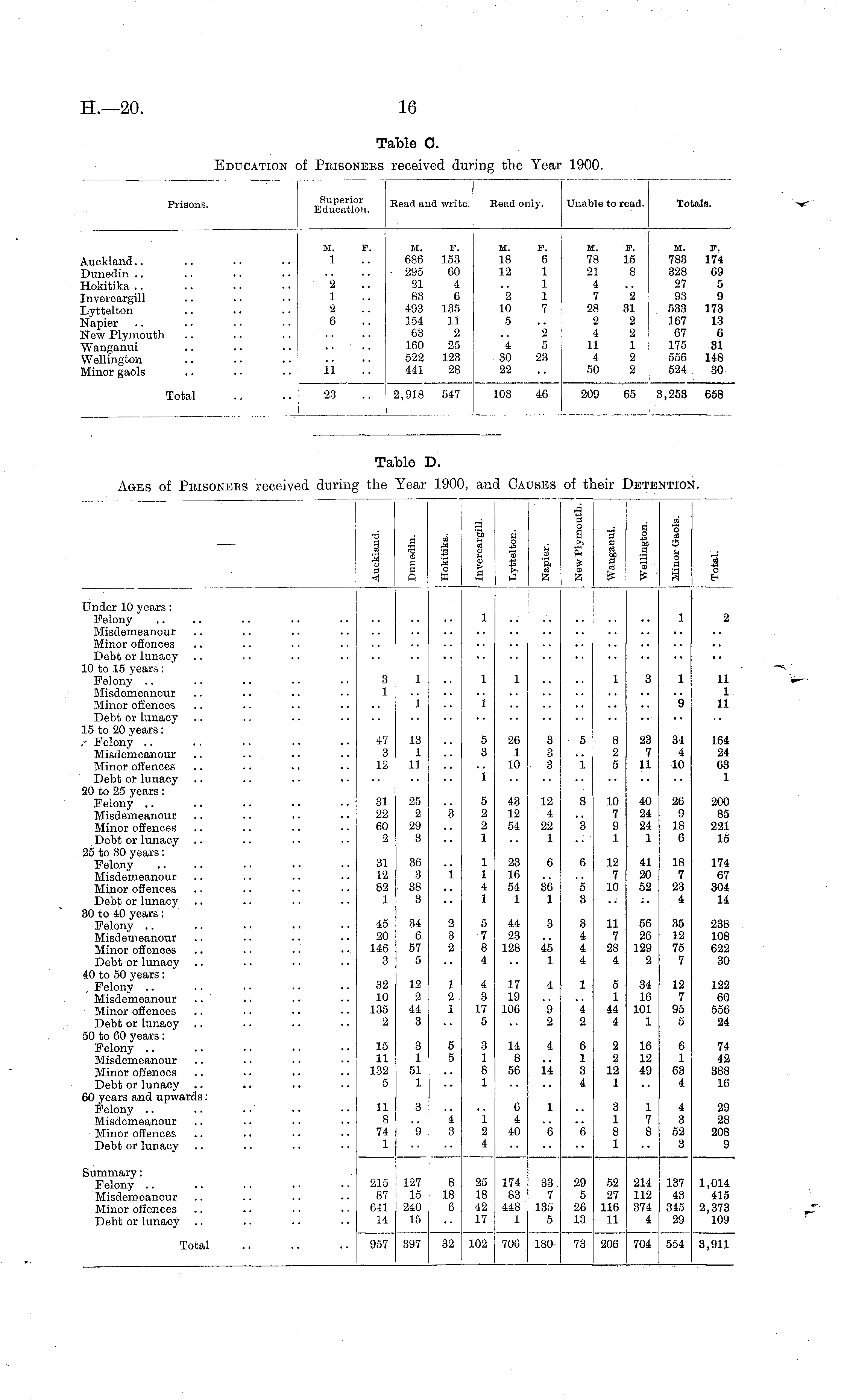 Prisons. Superior Education. Read and write. Read only. Unable to read. Totals. Auckland.. Dunedin .. Hokitika .. invercargill jyttelton Napier Slew Plymouth Vanganui Wellington Minor gaols L M. 1 p. M. 686 • 295 21 83 493 154 63 160 522 441 F. 153 60 4 6 135 11 2 25 123 28 M. 18 12 is 10 5 "i 30 22 F. 6 1 1 1 7 •2 5 23 M. 78 21 4 7 28 2 4 11 4 50 F. 15 8 2 31 2 2 1 2 2 M. 783 328 27 93 533 167 67 175 556 524 F. 174 69 5 9 173 13 6 31 148 30 2 1 2 6 11 Total 23 2,918 547 103 46 209 65 3,253 658