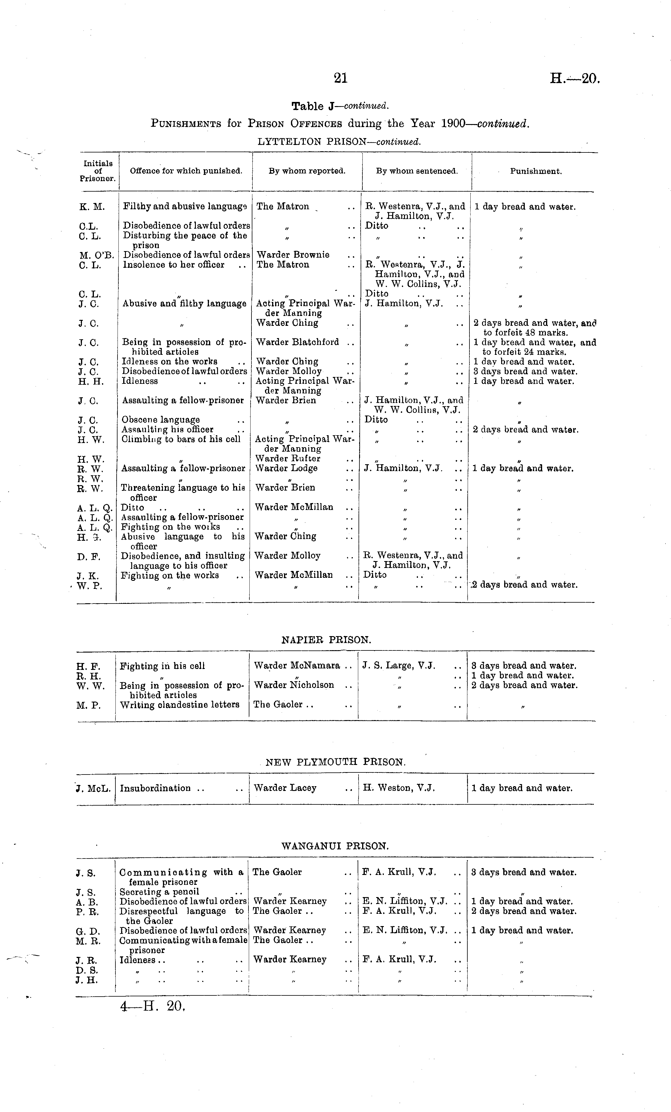 Initials of Prisoner. Offence for which punished. By whom reported. I By whom sentenced. Punishment. K. M. Filthy and abusive language The Matron R. Westenra, V.J., and J. Hamilton, V.J. Ditto I 1 day bread and water. C.L. C.L. Disobedience of lawful orders Disturbing the peace of the prison Disobedience of lawful orders Insolence to her officer M. O'B. C.L. Warder Brownie The Matron R.'westenra, V.J., j. Hamilton, V.J., and W. W. Collins, V.J. Ditto J. Hamilton, V.J. 0. L. J. C. Abusive and filthy language Aoting Principal Warder Manning Warder Ching J. C. 2 days bread and water, am to forfeit 48 marks. 1 day bread and water, am to forfeit 24 marks. 1 day bread and water. 3 days bread and water. 1 day bread and water. J. C. Being in possession of prohibited artioles Idleness on the works Disobedience of lawful orders Idleness Warder Blatchford .. J. C. J. C. H. H. Warder Ching Warder Molloy Acting Principal Warder Manning Warder Brien J, C. Assaulting a fellow-prisoner J. Hamilton, V.J., and W. W. Collins, V.J. Ditto J. c. J. c. H. W. Obscene language Assaulting his officer Climbing to bars of his cell j Acting Principal Warder Manning Warder Rufter Warder Lodge 2 days bread and water. H. W. R. W. R. W. R. W. Assaulting a fellow-prisoner J. Hamilton, V.J. 1 day bread and water. Threatening language to his officer Ditto Assaulting a fellow-prisoner Fighting on the woiks Abusive language to his officer Disobedience, and insulting language to his officer Fighting on the works Warder Brien A. L. Q. A. L. Q. A. L. Q. H. 5. Warder McMillan .. Warder Ching D. F. Warder Molloy R. Westenra, V.J., and J. Hamilton, V.J. Ditto J. K. W.P. Warder McMillan .. .2 days bread and water. NAPIER PRISON. [. F. ,. H. J. W. [. P. Fighting in his cell Warder McNamara .. J.'S. Large, V.J. Being in possession of pro- Warder Nicholson ,. hibited artioles Writing clandestine letters The Gaoler .. ... _J I .. 3 days bread and water. 1 day bread and water. .. 2 days bread and water. NEW PLYMOUTH PRISON. . McL. Insubordination .. .. Warder Lacey H. Weston, V.J. 1 day bread and water. WANGANUI PRISON. r. S. Communioating with a female prisoner Secreting a pencil Disobedience of lawful orders Disrespectful language to the GaolerDisobedience of lawful orders Communicating with a female prisoner Idleness .. The Gaoler F. A. Krull, V.J. 3 days bread and water. r. S. LB. ?. R. Warder Kearney The Gaoler .. E.N. Liffiton, V.J. !'! F. A. Krull, V.J. 1 day bread and water. 2 days bread and water. 3-. D. «£. R. Warder Kearney The Gaoler .. E. N. Liffiton, V.J. .. 1 day bread and water. '. R. ). S. . H. Warder Kearney F. A. Krull, V.J.