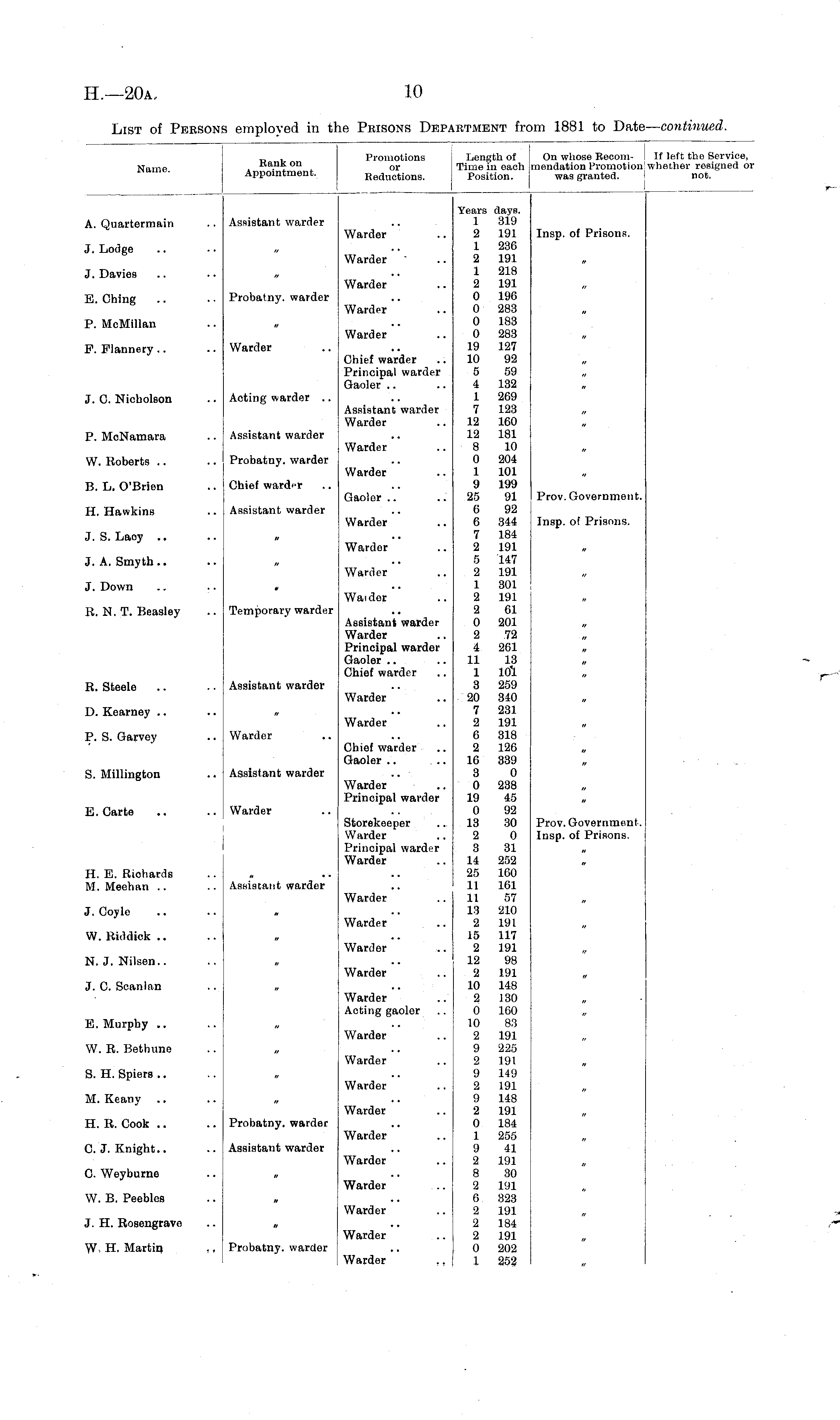 Name. Bank on Appointment. Promotions or Reductions. Length of Time in each Position. On whose Recoin[endation Promotion was granted. If left the Service, whether resigned or not. k. Quartermain J. Lodge J. Davies B. Ohing .. P. McMillan P. Plannery.. J. C. Nicholson P. MoNamara W. Roberts .. B. L. O'Brien H. Hawkins J. S. Laoy .. J. A. Smyth.. J. Down R. N. T. Beasley R. Steele D. Kearney .. P. S. Garvey Assistant warder Probatny. warder Warder Acting warder .. Assistant warder Probatny. warder Chief ward<r Assistant warder n Temporary warder Assistant warder Warder Warder Warder Warder Warder Warder Chief warder Principal warder Gaoler Assistant warder Warder Warder Warder Gaoler Warder Warder Warder Wai dor Assistant warder Warder Principal warder Gaoler Chief warder Warder Warder Chief warder Gaoler Years flays. 1 3i9 2 191 1 236 2 191 1 218 2 191 0 196 0 283 0 183 0 283 19 127 10 92 5 59 4 132 1 269 7 123 12 160 12 181 8 10 0 204 1 101 9 199 25 91 6 92 6 344 7 184 2 191 5 147 2 191 1 301 2 191 2 61 0 201 2 72 4 261 11 13 1 101 3 259 20 340 7 231 2 191 6 318 2 126 16 339 3 0 0 238 19 45 0 92 13 30 2 0 3 31 14 252 25 160 11 161 11 57 13 210 2 191 15 117 2 191 12 98 2 191 10 148 2 130 0 160 10 83 2 191 9 225 2 191 9 149 2 191 9 148 2 191 0 184 1 255 9 41 2 191 8 30 2 191 6 323 2 191 2 184 2 191 0 202 1 252 Insp. of Prisons. Prov. Government. Insp. of Prisons. S. Millington Assistant warder Warder Warder Principal warder E. Carte Storekeeper Warder Principal warder Warder Prov. Government. Iasp. of Prisons. H. E. Riohards M. Meehan .. Assistant warder J. Coyle Warder W. Riddick .. Warder n N. J. Nilsen.. Warder ■> J. 0. Scanlan Warder Warder Acting gaoler B. Murphy .. a Warder W. R. Bethune 8. H. Spiers .. Warder Warder M. Keany Probatny. warder Warder H. R. Cook .. D.J. Knight.. Assistant warder Warder Warder 0. Weyburne Warder W. B. Peebles J. H. Rosengrave Warder a W, H. Martin Probatny. warder Warder Warder ,, if