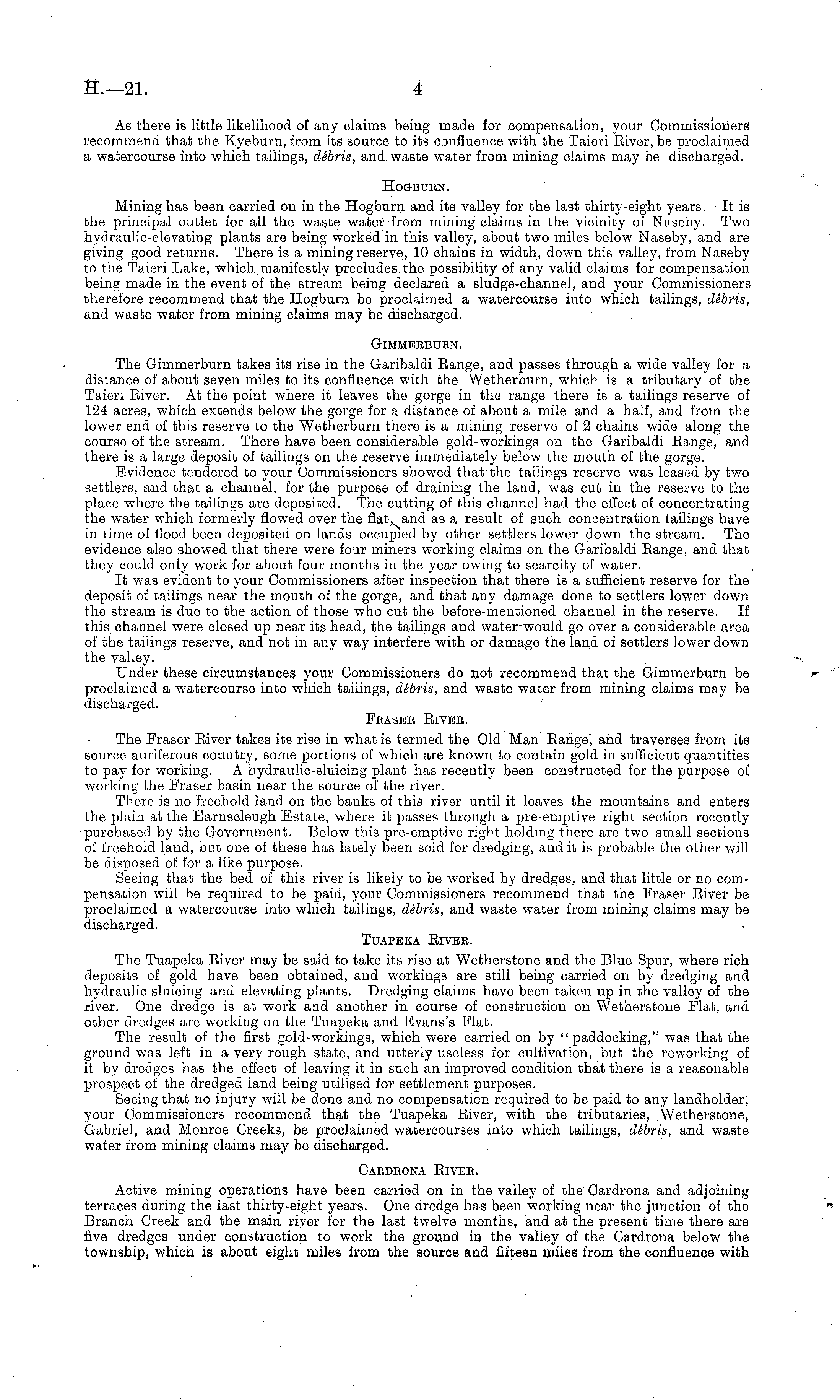 As there is little likelihood of any claims being made for compensation, your Commissioners recommend that the Kyeburn, from its source to its confluence with the Taieri Eiver, be proclaimed a watercourse into which tailings, debris, and waste water from mining claims may be discharged. Hogbubn. Mining has been carried on in the Hogburn and its valley for the last thirty-eight years. It is the principal outlet for all the waste water from mining claims in the vicinity of Naseby. Two hydraulic-elevating plants are being worked in this valley, about two miles below Naseby, and are giving good returns. There is a mining reserve,, 10 chains in width, down this valley, from Naseby to the Taieri Lake, which manifestly precludes the possibility of any valid claims for compensation being made in the event of the stream being declared a sludge-channel, and your Commissioners therefore recommend that the Hogburn be proclaimed a watercourse into which tailings, debris, and waste water from mining claims may be discharged. GIMMBBBUBN. The Gimmerburn takes its rise in the Garibaldi Eange, and passes through a wide valley for a distance of about seven miles to its confluence with the Wetherburn, which is a tributary of the Taieri Eiver. At the point where it leaves the gorge in the range there is a tailings reserve of 124 acres, which extends below the gorge for a distance of about a mile and a half, and from the lower end of this reserve to the Wetherburn there is a mining reserve of 2 chains wide along the course of the stream. There have been considerable gold-workings on the Garibaldi Eange, and there is a large deposit of tailings on the reserve immediately below the mouth of the gorge. Evidence tendered to your Commissioners showed that the tailings reserve was leased by two settlers, and that a channel, for the purpose of draining the land, was cut in the reserve to the place where the tailings are deposited. The cutting of this channel had the effect of concentrating the water which formerly flowed over the flat,, and as a result of such concentration tailings have in time of flood been deposited on lands occupied by other settlers lower down the stream. The evidence also showed that there were four miners working claims on the Garibaldi Eange, and that they could only work for about four months in the year owing to scarcity of water. It was evident to your Commissioners after inspection that there is a sufficient reserve for the deposit of tailings near the mouth of the gorge, and that any damage done to settlers lower down the stream is due to the action of those who cut the before-mentioned channel in the reserve. If this channel were closed up near its head, the tailings and water would go over a considerable area of the tailings reserve, and not in any way interfere with or damage the land of settlers lower down the valley. Under these circumstances your Commissioners do not recommend that the Gimmerburn be proclaimed a watercourse into which tailings, debris, and waste water from mining claims may be discharged. Fbasbb Eivbb. The Fraser Eiver takes its rise in what is termed the Old Man Eange, and traverses from its source auriferous country, some portions of which are known to contain gold in sufficient quantities to pay for working. A hydraulic-sluicing plant has recently been constructed for the purpose of working the Fraser basin near the source of the river. There is no freehold land on the banks of this river until it leaves the mountains and enters the plain at the Earnscleugh Estate, where it passes through a pre-emptive right section recently purchased by the Government. Below this pre-emptive right holding there are two small sections of freehold land, but one of these has lately been sold for dredging, and it is probable the other will be disposed of for a like purpose. Seeing that the bed of this river is likely to be worked by dredges, and that little or no compensation will be required to be paid, your Commissioners recommend that the Fraser Eiver be proclaimed a watercourse into which tailings, debris, and waste water from mining claims may be discharged. Tuapbka Eivbb. The Tuapeka Eiver may be said to take its rise at Wetherstone and the Blue Spur, where rich deposits of gold have been obtained, and workings are still being carried on by dredging and hydraulic sluicing and elevating plants. Dredging claims have been taken up in the valley of the river. One dredge is at work and another in course of construction on Wetherstone Flat, and other dredges are working on the Tuapeka and Evans's Flat. The result of the first gold-workings, which were carried on by " pad docking," was that the ground was left in a very rough state, and utterly useless for cultivation, but the reworking of it by dredges has the effect of leaving it in such an improved condition that there is a reasonable prospect of the dredged land being utilised for settlement purposes. Seeing that no injury will be done and no compensation required to be paid to any landholder, your Commissioners recommend that the Tuapeka Eiver, with the tributaries, Wetherstone, Gabriel, and Monroe Creeks, be proclaimed watercourses into which tailings, debris, and waste water from mining claims may be discharged. Cabdeona Eivbb. Active mining operations have been carried on in the valley of the Cardrona and adjoining terraces during the last thirty-eight years. One dredge has been working near the junction of the Branch Creek and the main river for the last twelve months, and at the present time there are five dredges under construction to work the ground in the valley of the Cardrona below the township, which is about eight miles from the source and fifteen miles from the confluence with