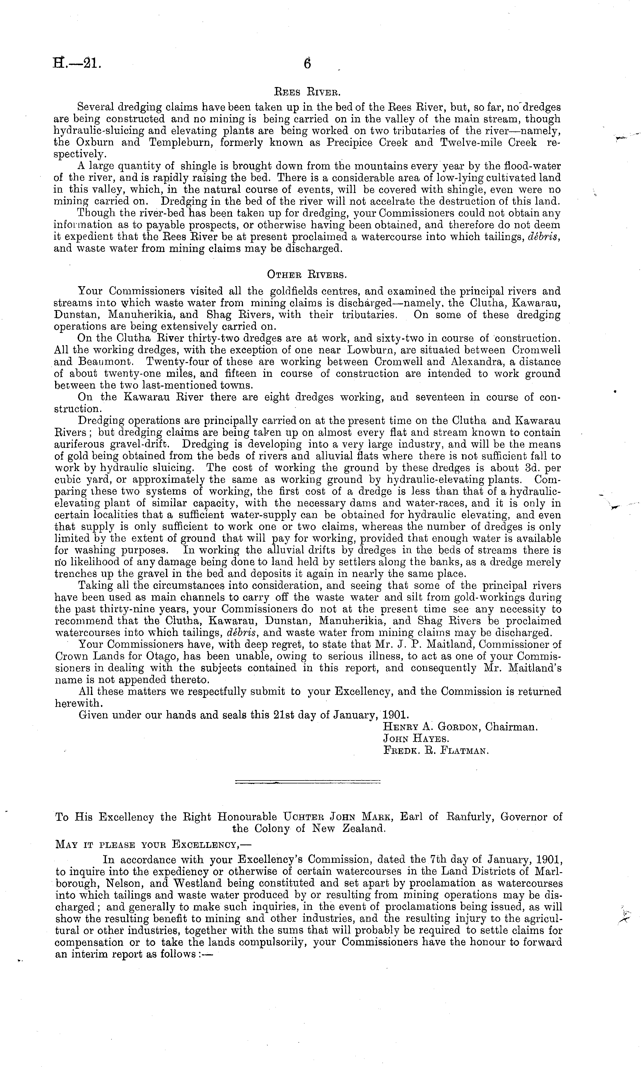 To His Excellency the Eight Honourable Uchter John Mark, Earl of Eanfurly, Governor of the Colony of New Zealand. May it please your Excellency,— In accordance with your Excellency's Commission, dated the 7th day of January, 1901, to inquire into the expediency or otherwise of certain watercourses in the Land Districts of Marlborough, Nelson, and Westland being constituted and set apart by proclamation as watercourses into which tailings and waste water produced by or resulting from mining operations may be discharged ; and generally to make such inquiries, in the event of proclamations being issued, as will show the resulting benefit to mining and other industries, and the resulting injury to the agricultural or other industries, together with the sums that will probably be required to settle claims for compensation or to take the lands compulsorily, your Commissioners have the honour to forward an interim report as follows : —