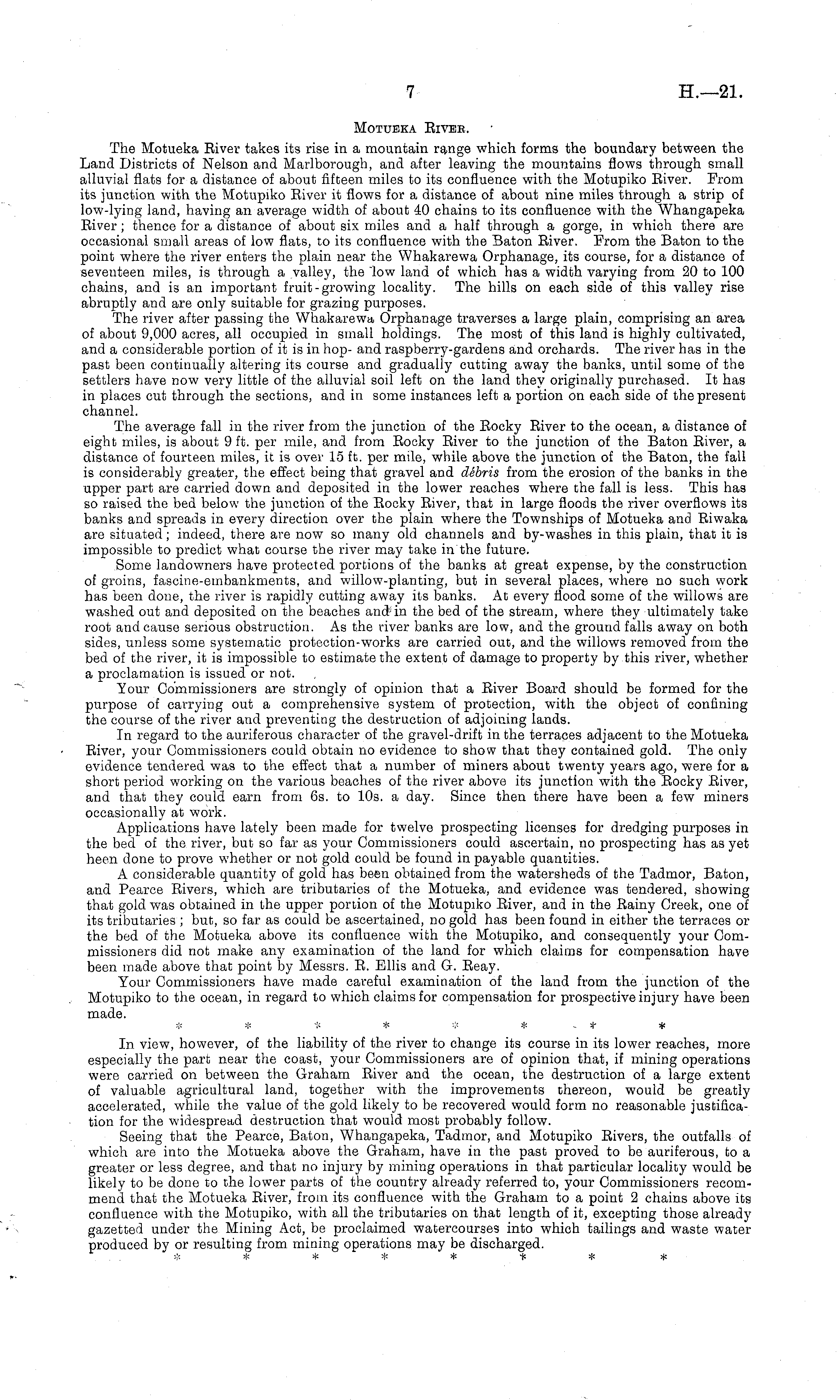 MOTUEKA EIVBE. The Motueka Eiver takes its rise in a mountain range which forms the boundary between the Land Districts of Nelson and Marlborough, and after leaving the mountains flows through small alluvial flats for a distance of about fifteen miles to its confluence with the Motupiko Eiver. From its junction with the Motupiko Eiver it flows for a distance of about nine miles through a strip of low-lying land, having an average width of about 40 chains to its confluence with the Whangapeka Eiver; thence for a distance of about six miles and a half through a gorge, in which there are occasional small areas of low flats, to its confluence with the Baton Eiver. From the Baton to the point where the river enters the plain near the Whakarewa Orphanage, its course, for a distance of seveuteen miles, is through a valley, the low land of which has a width varying from 20 to 100 chains, and is an important fruit-growing locality. The hills on each side of this valley rise abruptly and are only suitable for grazing purposes. The river after passing the Whakarewa, Orphanage traverses a large plain, comprising an area of about 9,000 acres, all occupied in small holdings. The most of this land is highly cultivated, and a considerable portion of it is in hop- and raspberry-gardens and orchards. The river has in the past been continually altering its course and gradually cutting away the banks, until some of the settlers have now very little of the alluvial soil left on the land they originally purchased. It has in places cut through the sections, and in some instances left a portion on each side of the present channel. The average fall in the river from the junction of the Eocky Eiver to the ocean, a distance of eight miles, is about 9 ft. per mile, and from Eocky Eiver to the junction of the Baton Eiver, a distance of fourteen miles, it is over 15 ft. per mile, while above the junction of the Baton, the fall is considerably greater, the effect being that gravel and debris from the erosion of the banks in the upper part are carried down and deposited in the lower reaches where the fall is less. This has so raised the bed below the junction of the Eocky Eiver, that in large floods the river overflows its banks and spreads in every direction over the plain where the Townships of Motueka and Eiwaka are situated; indeed, there are now so many old channels and by-washes in this plain, that it is impossible to predict what course the river may take in the future. Some landowners have protected portions of the banks at great expense, by the construction of groins, fascine-embankments, and willow-planting, but in several places, where no such work has been done, the river is rapidly cutting away its banks. At every flood some of the willows are washed out and deposited on the beaches and in the bed of the stream, where they ultimately take root and cause serious obstruction. As the river banks are low, and the ground falls away on both sides, unless some systematic protection-works are carried out, and the willows removed from the bed of the river, it is impossible to estimate the extent of damage to property by this river, whether a proclamation is issued or not. Your Commissioners are strongly of opinion that a Eiver Board should be formed for the purpose of carrying out a comprehensive system of protection, with the object of confining the course of the river and preventing the destruction of adjoining lands. In regard to the auriferous character of the gravel-drift in the terraces adjacent to the Motueka Eiver, your Commissioners could obtain no evidence to show that they contained gold. The only evidence tendered was to the effect that a number of miners about twenty years ago, were for a short period working on the various beaches of the river above its junction with the Eocky Eiver, and that they could earn from 6s. to 10s. a day. Since then there have been a few miners occasionally at work. Applications have lately been made for twelve prospecting licenses for dredging purposes in the bed of the river, but so far as your Commissioners could ascertain, no prospecting has as yet heen done to prove whether or not gold could be found in payable quantities. A considerable quantity of gold has been obtained from the watersheds of the Tadmor, Baton, and Pearce Eivers, which are tributaries of the Motueka, and evidence was tendered, showing that gold was obtained in the upper portion of the Motupiko Eiver, and in the Eainy Creek, one of its tributaries ; but, so far as could be ascertained, no gold has been found in either the terraces or the bed of the Motueka above its confluence with the Motupiko, and consequently your Commissioners did not make any examination of the land for which claims for compensation have been made above that point by Messrs. E. Ellis and G. Eeay. Your Commissioners have made careful examination of the land from the junction of the Motupiko to the ocean, in regard to which claims for compensation for prospective injury have been made. :|: * t * ■>'• * - * * In view, however, of the liability of the river to change its course in its lower reaches, more especially the part near the coast, your Commissioners are of opinion that, if mining operations were carried on between the Graham Eiver and the ocean, the destruction of a large extent of valuable agricultural land, together with the improvements thereon, would be greatly accelerated, while the value of the gold likely to be recovered would form no reasonable justification for the widespread destruction that would most probably follow. Seeing that the Pearce, Baton, Whangapeka, Tadmor, and Motupiko Eivers, the outfalls of which are into the Motueka above the Graham, have in the past proved to be auriferous, to a greater or less degree, and that no injury by mining operations in that particular locality would be likely to be done to the lower parts of the country already referred to, your Commissioners recommend that the Motueka 