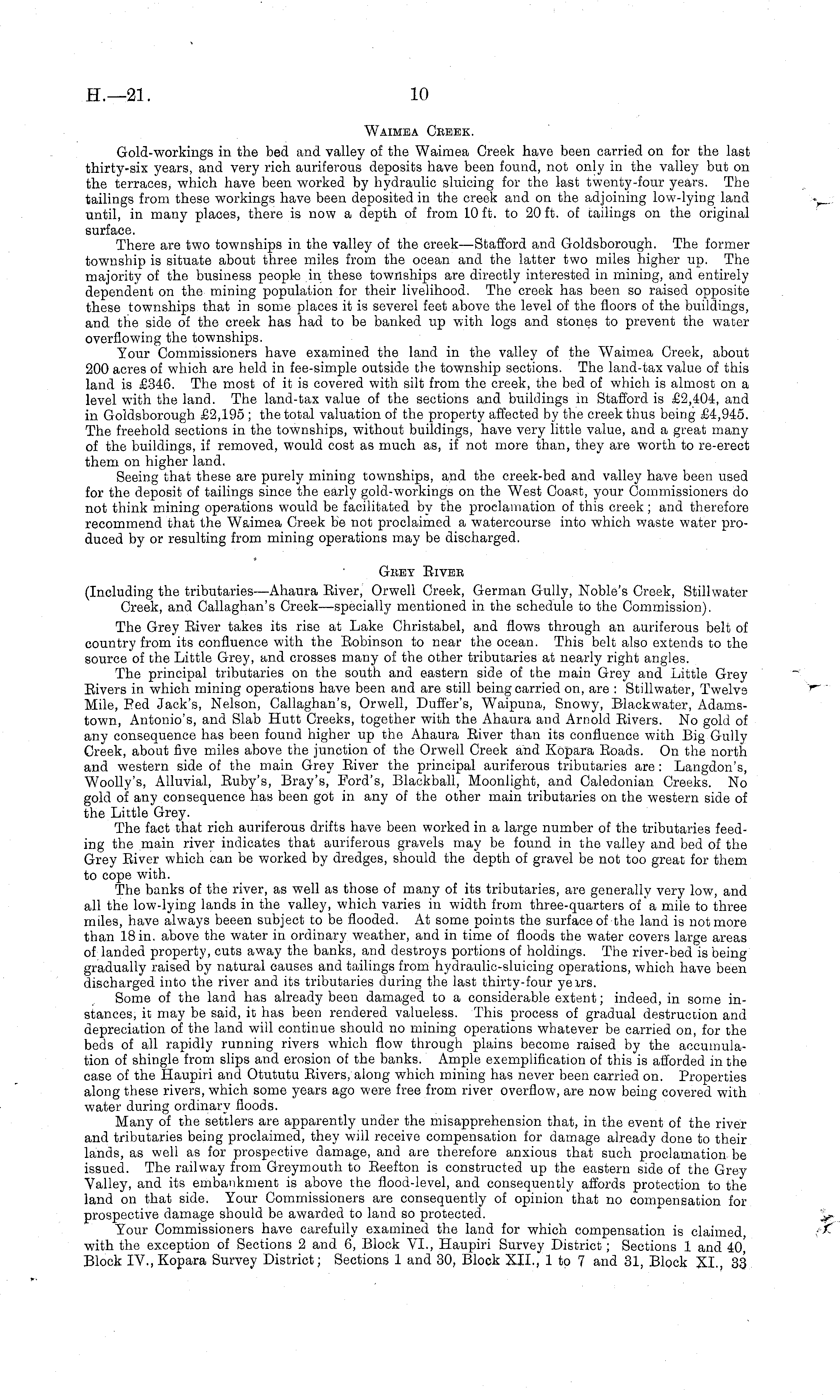Waimba Cbeek. Gold-workings in the bed and valley of the Waimea Greek have been carried on for the last thirty-six years, and very rich auriferous deposits have been found, not only in the valley but on the terraces, which have been worked by hydraulic sluicing for the last twenty-four years. The tailings from these workings have been deposited in the creek and on the adjoining low-lying land until, in many places, there is now a depth of from 10 ft. to 20 ft. of tailings on the original surface. There are two townships in the valley of the creek—Stafford and Goldsborough. The former township is situate about three miles from the ocean and the latter two miles higher up. The majority of the business people in these townships are directly interested in mining, and entirely dependent on the mining population for their livelihood. The creek has been so raised opposite these townships that in some places it is severel feet above the level of the floors of the buildings, and the side of the creek has had to be banked up with logs and stones to prevent the water overflowing the townships. Your Commissioners have examined the land in the valley of the Waimea Creek, about 200 acres of which are held in fee-simple outside the township sections. The land-tax value of this land is £346. The most of it is covered with silt from the creek, the bed of which is almost on a level with the land. The land-tax value of the sections and buildings in Stafford is £2,404, and in Goldsborough £2,195 ; the total valuation of the property affected by the creek thus being £4,945. The freehold sections in the townships, without buildings, have very little value, and a great many of the buildings, if removed, would cost as much as, if not more than, they are worth to re-erect them on higher land. Seeing that these are purely mining townships, and the creek-bed and valley have been used for the deposit of tailings since the early gold-workings on the West Coast, your Commissioners do not think mining operations would be facilitated by the proclamation of this creek; and therefore recommend that the Waimea Creek be not proclaimed a watercourse into which waste water produced by or resulting from mining operations may be discharged. Gbey Eivbb (Including the tributaries—Ahaura Eiver, Orwell Creek, German Gully, Noble's Creek, Stillwater Creek, and Callaghan's Creek—-specially mentioned in the schedule to the Commission). The Grey Biver takes its rise at Lake Christabel, and flows through an auriferous belt of country from its confluence with the Eobinson to near the ocean. This belt also extends to the source of the Little Grey, and crosses many of the other tributaries at nearly right angles. The principal tributaries on the south and eastern side of the main Grey and Little Grey Eivers in which mining operations have been and are still being carried on, are : Stillwater, Twelve Mile, Bed Jack's, Nelson, Callaghan's, Orwell, Duffer's, Waipuna, Snowy, Blackwater, Adamstown, Antonio's, and Slab Hutt Creeks, together with the Ahaura and Arnold Eivers. No gold of any consequence has been found higher up the Ahaura Eiver than its confluence with Big Gully Creek, about five miles above the junction of the Orwell Creek and Kopara Eoads. On the north and western side of the main Grey Eiver the principal auriferous tributaries are : Langdon's, Woolly's, Alluvial, Euby's, Bray's, Ford's, Blackball, Moonlight, and Caledonian Creeks. No gold of any consequence has been got in any of the other main tributaries on the western side of the Little Grey. The fact that rich auriferous drifts have been worked in a large number of the tributaries feeding the main river indicates that auriferous gravels may be found in the valley and bed of the Grey Eiver which can be worked by dredges, should the depth of gravel be not too great for them to cope with. The banks of the river, as well as those of many of its tributaries, are generally very low, and all the low-lying lands in the valley, which varies in width from three-quarters of a mile to three miles, have always beeen subject to be flooded. At some points the surface of the land is not more than 18 in. above the water in ordinary weather, and in time of floods the water covers large areas of landed property, cuts away the banks, and destroys portions of holdings. The river-bed is being gradually raised by natural causes and tailings from hydraulic-sluicing operations, which have been discharged into the river and its tributaries during the last thirty-four yexrs. Some of the land has already been damaged to a considerable extent; indeed, in some instances, it may be said, it has been rendered valueless. This process of gradual destruction and depreciation of the land will continue should no mining operations whatever be carried on, for the beds of all rapidly running rivers which flow through plains become raised by the accumulation of shingle from slips and erosion of the banks. Ample exemplification of this is afforded in the case of the Haupiri and Otututu Eivers, along which mining has never been carried on. Properties along these rivers, which some years ago were free from river overflow, are now being covered with water during ordinary floods. Many of the settlers are apparently under the misapprehension that, in the event of the river and tributaries being proclaimed, they will receive compensation for damage already done to their lands, as well as for prospective damage, and are therefore anxious that such proclamation be issued. The railway from Greymouth to Eeefton is constructed up the eastern side of the Grey Valley, and its embankment is above the flood-level, and consequently affords protection to the land on that side. Your Commissioners are consequently of opinion that no compensation for prospective damage should be awarded to land so protected. Your Commissioners have carefully examined the land for which compensation is claimed, with the exception of Sections