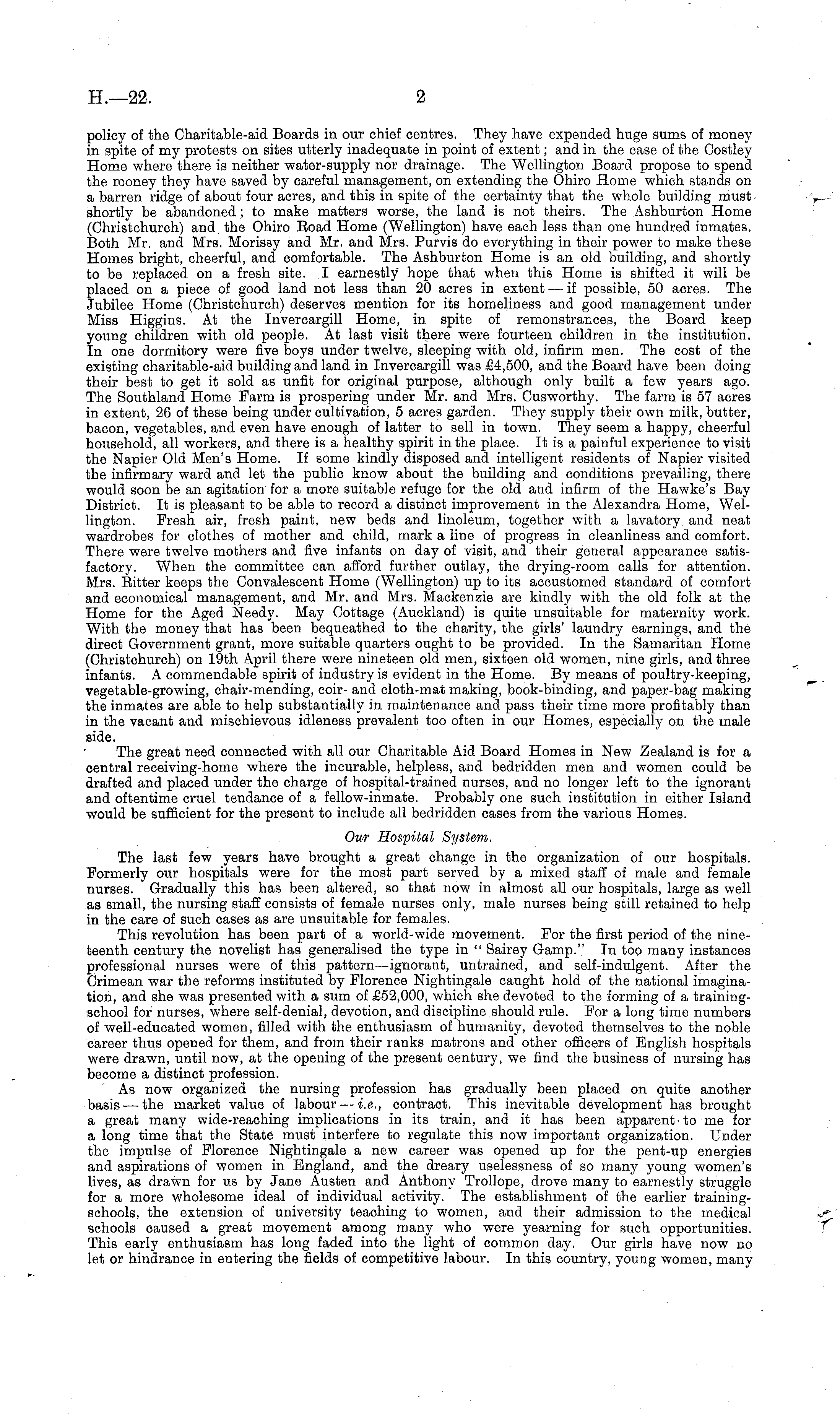 policy of the Charitable-aid Boards in our chief centres. They have expended huge sums of money in spite of my protests on sites utterly inadequate in point of extent; and in the case of the Costley Home where there is neither water-supply nor drainage. The Wellington Board propose to spend the money they have saved by careful management, on extending the Ohiro Home which stands on a barren ridge of about four acres, and this in spite of the certainty that the whole building must shortly be abandoned; to make matters worse, the land is not theirs. The Ashburton Home (Christchurch) and the Ohiro Eoad Home (Wellington) have each, less than one hundred inmates. Both Mr. and Mrs. Morissy and Mr. and Mrs. Purvis do everything in their power to make these Homes bright, cheerful, and comfortable. The Ashburton Home is an old building, and shortly to be replaced on a fresh site. I earnestly hope that when this Home is shifted it will be placed on a piece of good land not less than 20 acres in extent —if possible, 50 acres. The Jubilee Home (Christchurch) deserves mention for its homeliness and good management under Miss Higgins. At the Invercargill Home, in spite of remonstrances, the Board keep young children with old people. At last visit there were fourteen children in the institution. In one dormitory were five boys under twelve, sleeping with old, infirm men. The cost of the existing charitable-aid building and land in Invercargill was £4,500, and the Board have been doing their best to get it sold as unfit for original purpose, although only built a few years ago. The Southland Home Farm is prospering under Mr. and Mrs. Cusworthy. The farm is 57 acres in extent, 26 of these being under cultivation, 5 acres garden. They supply their own milk, butter, bacon, vegetables, and even have enough of latter to sell in town. They seem a happy, cheerful household, all workers, and there is a healthy spirit in the place. It is a painful experience to visit the Napier Old Men's Home. If some kindly disposed and intelligent residents of Napier visited the infirmary ward and let the public know about the building and conditions prevailing, there would soon be an agitation for a more suitable refuge for the old and infirm of the Hawke's Bay District. It is pleasant to be able to record a distinct improvement in the Alexandra Home, Wellington. Fresh air, fresh paint, new beds and linoleum, together with a lavatory and neat wardrobes for clothes of mother and child, mark a line of progress in cleanliness and comfort. There were twelve mothers and five infants on day of visit, and their general appearance satisfactory. When the committee can afford further outlay, the drying-room calls for attention. Mrs. Bitter keeps the Convalescent Home (Wellington) up to its accustomed standard of comfort and economical management, and Mr. and Mrs. Mackenzie are kindly with the old folk at the Home for the Aged Needy. May Cottage (Auckland) is quite unsuitable for maternity work. With the money that has been bequeathed to the charity, the girls' laundry earnings, and the direct Government grant, more suitable quarters ought to be provided. In the Samaritan Home (Christchurch) on 19th April there were nineteen old men, sixteen old women, nine girls, and three infants. A commendable spirit of industry is evident in the Home. By means of poultry-keeping, vegetable-growing, chair-mending, coir- and cloth-mat making, book-binding, and paper-bag making the inmates are able to help substantially in maintenance and pass their time more profitably than in the vacant and mischievous idleness prevalent too often in our Homes, especially on the male side. The great need connected with all our Charitable Aid Board Homes in New Zealand is for a central receiving-home where the incurable, helpless, and bedridden men and women could be drafted and placed under the charge of hospital-trained nurses, and no longer left to the ignorant and oftentime cruel tendance of a fellow-inmate. Probably one such institution in either Island would be sufficient for the present to include all bedridden cases from the various Homes. Our Hospital System. The last few years have brought a great change in the organization of our hospitals. Formerly our hospitals were for the most part served by a mixed staff of male and female nurses. Gradually this has been altered, so that now in almost all our hospitals, large as well as small, the nursing staff consists of female nurses only, male nurses being still retained to help in the care of such cases as are unsuitable for females. This revolution has been part of a world-wide movement. For the first period of the nineteenth century the novelist has generalised the type in " Sairey Gamp." In too many instances professional nurses were of this pattern—ignorant, untrained, and self-indulgent. After the Crimean war the reforms instituted by Florence Nightingale caught hold of the national imagination, and she was presented with a sum of £52,000, which she devoted to the forming of a trainingschool for nurses, where self-denial, devotion, and discipline should rule. For a long time numbers of well-educated women, filled with the enthusiasm of humanity, devoted themselves to the noble career thus opened for them, and from their ranks matrons and other officers of English hospitals were drawn, until now, at the opening of the present century, we find the business of nursing has become a distinct profession. As now organized the nursing profession has gradually been placed on quite another basis — the market value of labour — i.e., contract. This inevitable development has brought a great many wide-reaching implications in its train, and it has been apparent ■to me for a long time that the State must interfere to regulate this now important organization. Under the impulse of Florence Nightingale a new career was opened up for the pent-up energies and aspirations of women in England, and the dreary uselessne