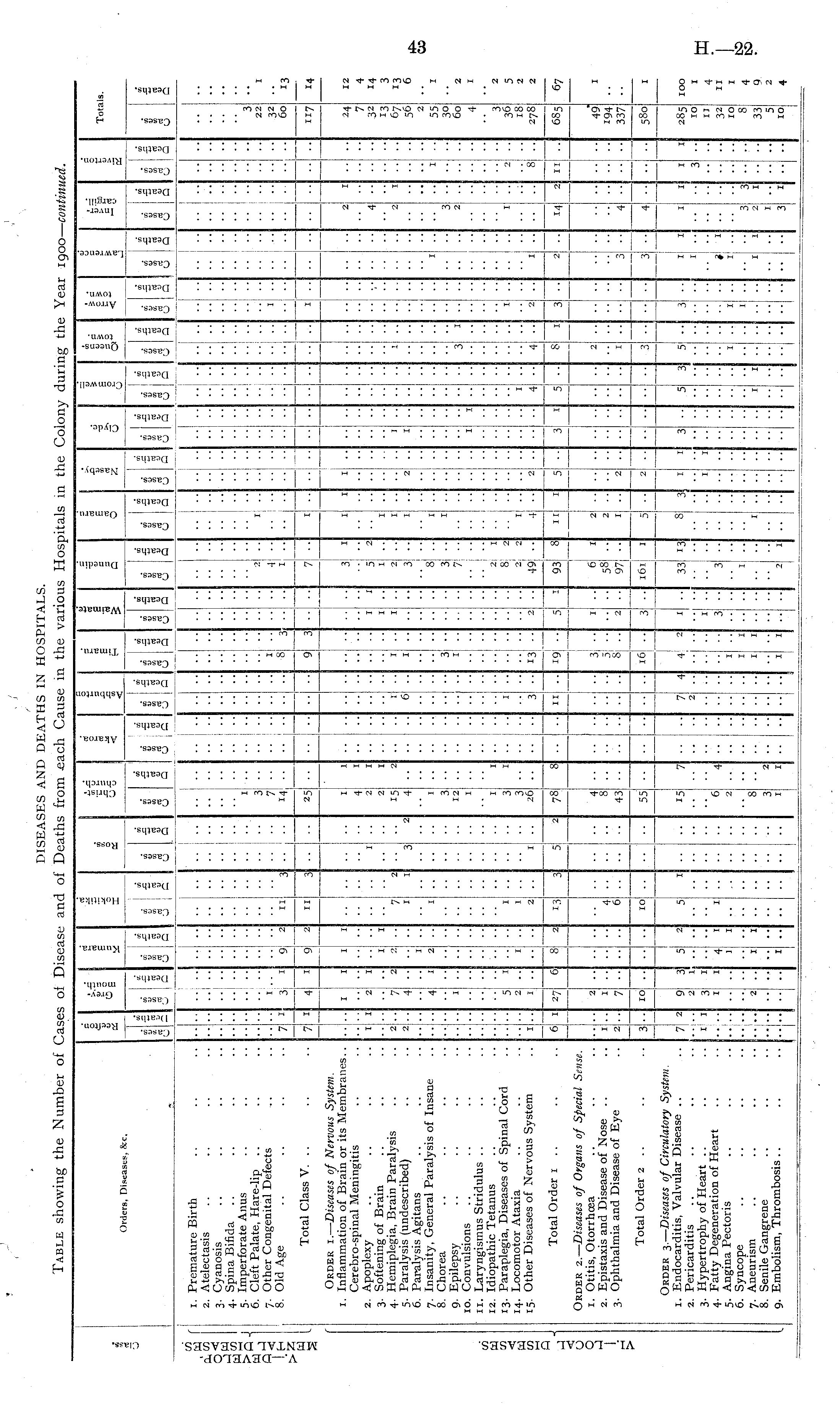 DISEASES AND DEATHS IN HOSPITALS. Table showing the Number of Cases of Disease and of Deaths from each Cause in the various Hospitals in the Colony during the Year 1900— continued.