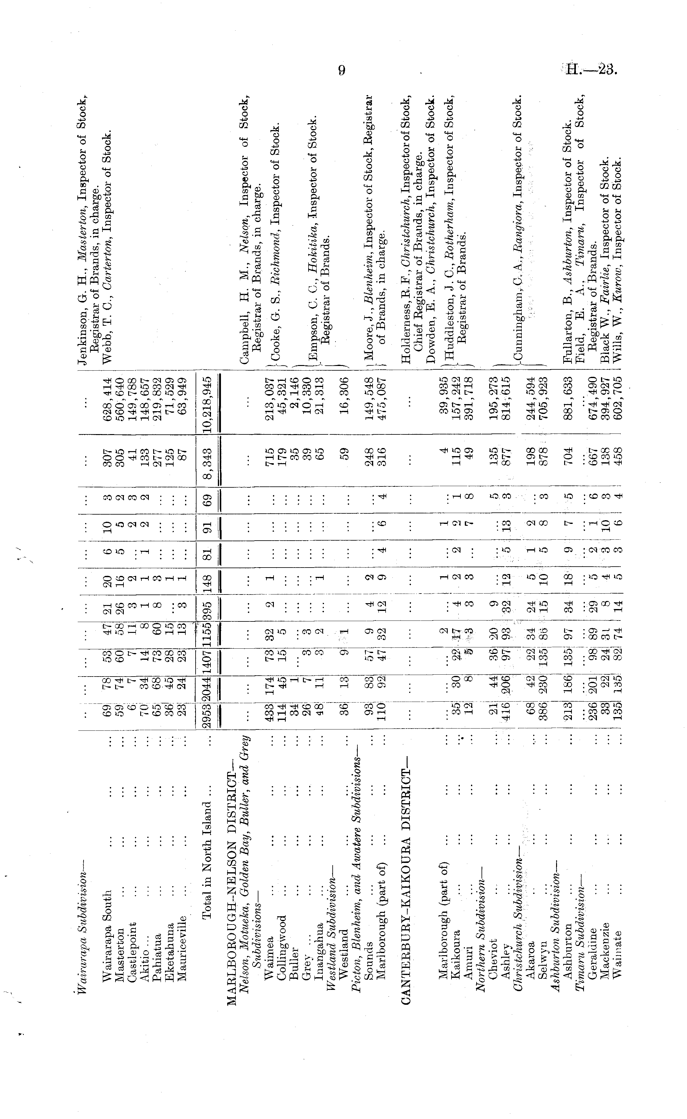 Wairarapa Subdivision — Jenkinson, G. H., Masterton, Inspector of Stocky Eegistrar of Brands, in charge. Webb, T. C, Garterton, Inspector of Stock. Wairarapa South Masterton Castlepoint Akitio ... Pahiatua Eketahuna Mauriceville 69! 59 70 65, I 23 ; 78 74! 34 68 45 24 53 60 14 73 28 23 47 58 8 60 15 13 21 26 3 1 8 20 16 2 1 3 1 1 6 5 1 10 5 2 2 3 2 307 305 41 133 277 125 87 628,414 560,640 149,788 148,657 219,832 71,529 63,949 I "3 I i — Total in North Island ... 29531 i2044 1407 1155 395 I 148 81 91 69 8,343 10,218,945 ■ ■'■—■ . \^—. \=4 MARLBOROUGH-NELSON DISTRICT— Nelson, Motueka, Golden Bay, Butter, and Grey Subdivisions — Waimea Collingwood Buller Grey ... Inangahua Westland Subdivision — Westland Picton, Blenheim, and Awatere Subdivisions — Sounds Marlborough (part of) 433 174 114 45 34 1 26 ! 7 48 11 73 15 3 3 32 5 3 2 . 1 ::: 1 i 715 179 35 39 65 213,037 45,321 2,146 10,330 21,313 Campbell, H. M., Nelson, Inspector of Stock, Eegistrar of Brands, in charge. -Cooke, G. S., Richmond, Inspector of Stock. Bmpson, C. C, Hokitika, Inspector of Stock. I Eegistrar of Brands. 36 13 9 1 59 16,306 93 83, 110 92; 57 47: 9 32 4 2 12 9 4 "e 4 248 316 149,548 475,087 I Moore, J., Blenheim, Inspector of Stock, Eegistrar \ of Brands, in charge. CANTERBUBY-KAIKOURA DISTRICT— I ... ... . i Holderness,E.F., Ghristohurch, Inspector of Stock, Chief Eegistrar of Brands, in charge. Dowden, E. A., Ghristchurch, Inspector of Stock. 1 Marlborough (part of) Kaikoura Amuri Northern Subdivision — Cheviot Ashley Ghristchurcii Subdivision- — Akaroa '.', ... Selwyn Ashburton Subdivision — Ashburton Timaru Subdivision — Geraldme Mackenzie W'aiinate 35 30 121 8 "22 5 2 17 3 4 3 1 2 3 2 1 0 7 1 8 4 115 49 39,935 157,242 391,718 I Huddleston, J. C, Botherham, Inspector of Stock, j Eegistrar of Brands. 21 44 416] .206 36 97 20 93 9 32 12 5 13 5 3 135 877 195,273 814,615 ICunningham, C. A,, Bangiora, Inspector of Stock. •I I 68J 42! 386| 230 ! 1 22! 135! 34 86 24 15 5 10 1 5 2 8 3 198 878 244,594 705,923 213 186 135 97 34 18 9 7 5 704 881,633 Pullarton, B., Ashburton, Inspector of Stock. Field, E. A.. Timaru, Inspector of Stock, Eegistrar of Brands. Black W., Fairlie, Inspector of Stock. Wills, W., Kurow, Inspector of Stock. 236 201! 33 22! 135 135! ... I 98i 24! 82l 89 3L 74 29 14 5 4 5 2 3 3 1 10 6 6 3 4 667 138 458 674,490 394,927 602,705
