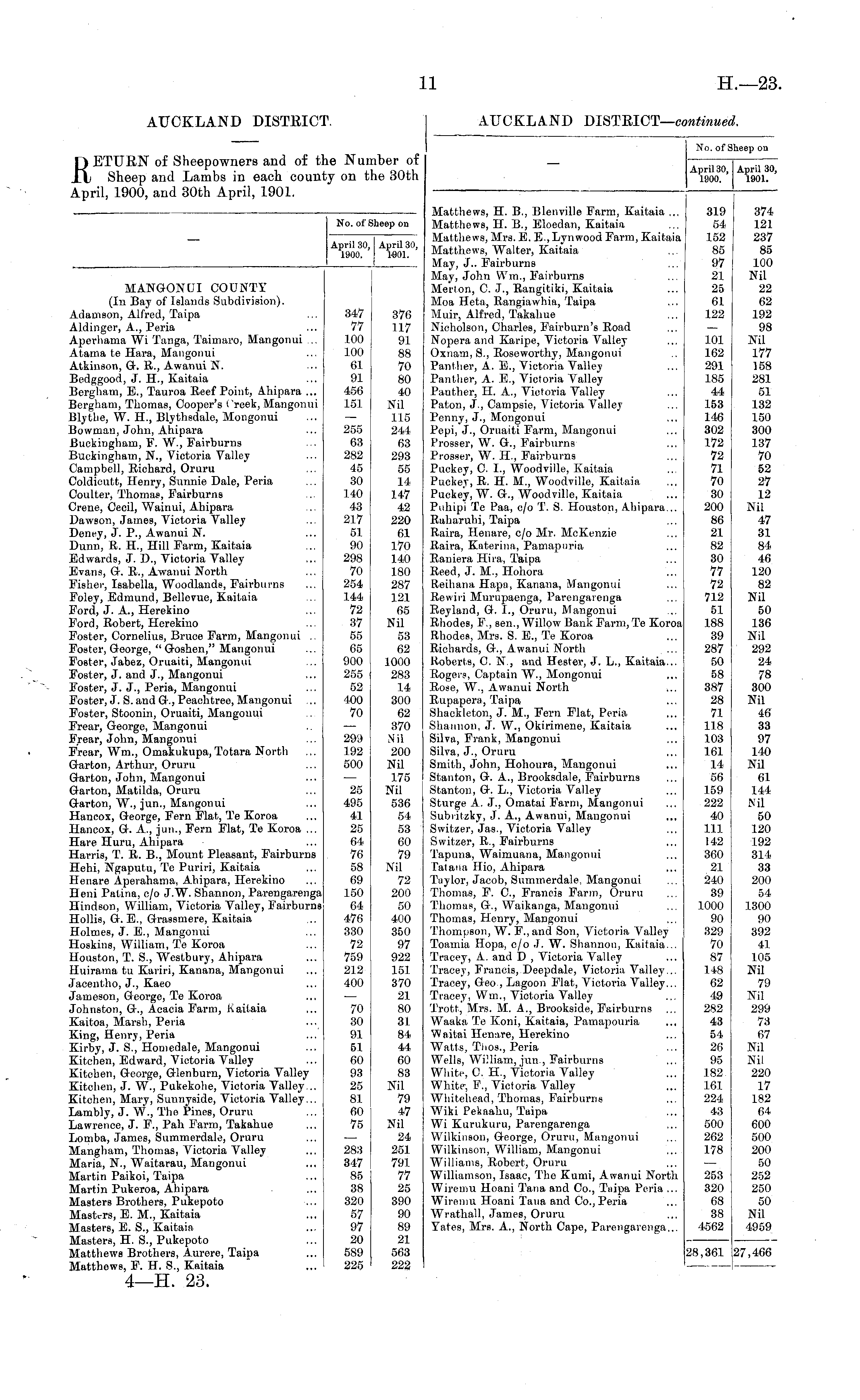 No. of Sheep on April 30, April 30, 1900. 1901. Matthews, H. B., Blenville Farm, Kaitaia ... Matthews, H. B., Eloedan, Kaitaia Matthews, Mrs. E. E., Lynwood Farm, Kaitaia Matthews, Walter, Kaitaia May, J.. Fairburns May, John Wm, Fairburns Merlon, C. J., Rangitiki, Kaitaia Moa Heta, Rangiawhia, Taipa Muir, Alfred, Takahue Nicholson, Charles, Fairburn's Road Nopera and Karipe, "Victoria Valley Oxriam, 8., Roaeworthy, Mangonui Pantlier, A. E., Victoria Valley Panther, A. E., Victoria Valley Panther, H. A., Victoria Valley Paton, J., Campsie, Victoria Valley Penny, J., Mongonui Pepi, J., Oruaiti Farm, Mangonui Prosser, W. Or., Fairburns Prosser, W. H., Fairburns Packey, C. I., Woodville, Kaitaia Puckey, R. H. M., Woodville, Kaitaia Puckey, W. G-., Woodville, Kaitaia Puhipi Te Paa, c/o T. S. Houston, Ahipara... Raharuhi, Taipa Raira, Henare, c/o Mr. McKenzie Raira, Katerina, Pamapuria Raniera Hira, Taipa Reed, J. M., Hohora Reihanu Hapa, Kanana, Mangonui Rewiri Murupaenga, Parengarenga Reyland, G. I., Orurti, Mangonui Rhodes, F., sen., Willow Bank Farm, Te Koroa Rhodes, Mrs. S. E., Te Koroa Richards, G-., Awanui North Roberts, 0. N., and Hester, J. L., Kaitaia... Rogers, Captain W., Mongonui Rose, W., Awanui North Rupapera, Taipa Shackleton, J. M., Fern Flat, Peria Shannon, J. W., Okirimene, Kaitaia Silva, Frank, Mangonui Silva, J., Oruru Smith, John, Hohoura, Mangonui Stan ton, Gh A., Brooksdale, Fairburns Stanton, G-. L., Victoria Valley Sturge A. J., Omatai Farm, Mangonui Subritzky, J. A., Awanui, Mangonui Switzer, Jas., Victoria Valley Switzer, R., Fairburns Tapuna, Waimuana, Mangonui Fat ana Hio, Ahipara Taylor, Jacob, Summerdale, Mangonui Thomas, F. C, Francis Farm, Oruru Thomas, Gh, Waikanga, Mangonui Thomas, Henry, Mangonui Thompson, W. F.,and Son, Victoria Valley Toamia Hopa, c/o J. W. Shannon, Kaitaia.. Tracey, A. and D , Victoria Valley Tracey, Francis, Deepdale, Victoria Valley... Tracey, Greo , Lagoon Flat, Victoria Valley... Tracey, Wm., Victoria Valley Trott, Mrs. M. A., Brookside, Fairburns Waaka Te Koni, Kaitaia, Pamapouria Waitai Henare, Herekino Watts, Thos., Peria Wells, William, jun., Fairburns White, C. H., Victoria Valley White, F., Victoria Valley Whitehead, Thomas, Fairburns Wiki Pekaahu, Taipa Wi Kurukuru, Parengarenga Wilkinson, Gfeorge, Oruru, Mangonui Wilkinson, William, Mangonui Williams, Robert, Oruru Williamson, Isaac, The Kumi, Awanui North Wiremu Hoani Tana and Co., Taipa Peria ... Wiremu Hoani Taua and Co., Peria Wrathall, James, Oruru Yates, Mrs. A., North Cape, Parengarenga... 319 54 152 85 97 21 25 61 122 101 162 291 185 44 153 146 302 172 72 71 70 30 200 86 21 82 30 77 72 712 51 188 39 287 50 58 387 28 71 118 103 161 14 56 159 222 40 111 142 360 21 240 39 1000 90 329 70 87 148 62 49 282 43 54 26 95 182 161 224 43 500 262 178 374 121 237 85 10O Nil 22 62 192 98 Ml 177 158 281 51 132 150 300 137 70 52 27 12 Nil 47 31 84 46 120 82 Nil 50 136 Nil 292 24 78 300 Nil 46 33 97 140 Nil 61 144 Nil 50 120 192 314 33 200 54 1300 90 392 41 105 Nil 79 Nil 299 73 67 Nil Nil 220 17 182 64 600 500 200 50 252 250 50 Nil 4959 253 320 68 38 4562 28,361 27,466
