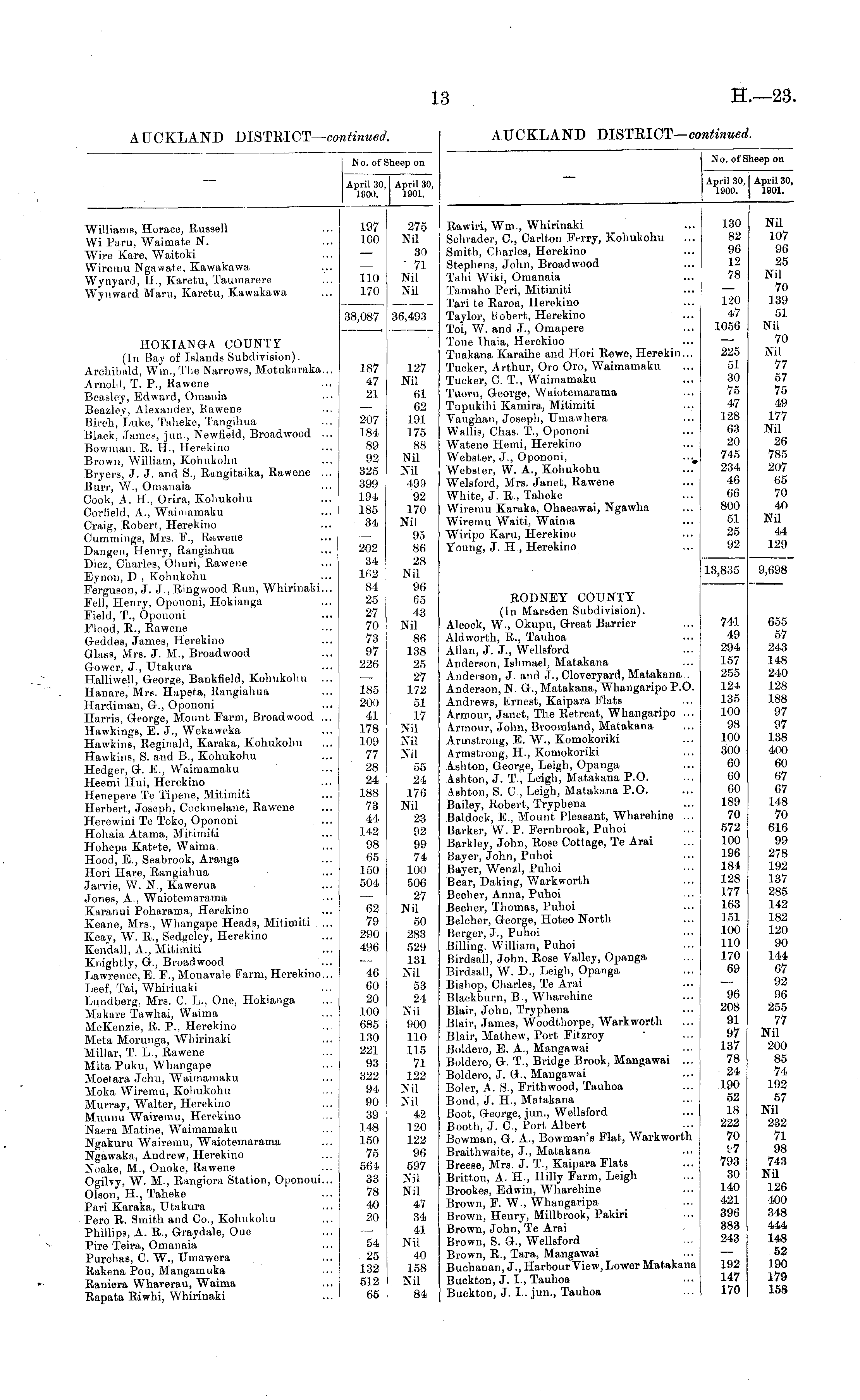 No. of Sheep on April 30, April 3 1000. J901. April 30, 1901. Williams, Horace, Bussell Wi Paru, Waimate N. Wire Kare, Waitoki Wireuiu Ngawate, Kawakawa Wynyard, H., Karetu, Taumarere Wjuward Mara, Karetu, Kawakawa 197 1C0 110 170 275 Nil 30 ■ 71 Nil Nil 38,087 36,493 HOKTANGA COUNT5T (In Bay of Islands Subdivision). Archibald, Win., The Narrows, Motuknraka... Arnol'l, T. P., Rawene Beasley, Edward, Omania Beazlev, Alexander, Kawene Birch, Luke, Taheke, Tangihua Black, James, jun., Newfield, Broadwood ... Bowman. B. H., Herekino Brown, William, Kohukohu Bryers, J. J. and S., Rangitaika, Bawene ... Burr, W., Omanaia Cook, A. H., Orira, Kohukohu Corfield, A., Waimamaku Craig, Bobert, Herekino Cummings, Mrs. F., Eawene Dangen, Henry, Bangiahua Diez, Charles, Ohuri, Bawene Eynon, D , Kohukohu Ferguson, J. J.Bingwood Bim, Whirinaki... Fell, Henry, Oponoui, Hokianga Field, T., Opononi Flood, B., Bawene Greddes, James, Herekino Glass, Mrs. J. M., Broadwood Grower, J., Utakura Halliwell, George, Bankfield, Kohukohu ... Hanare, Mrs. Hapeta, Bangialma Hardiman, G., Opononi Harris, George, Mount Farm, Broadwood ... Hawkings, E. J., Wekaweka Hawkins, Beginald, Karaka, Kohukohu Hawkins, S. and B., Kohukohu Hedger, G. E., Waimamaku Heemi Hui, Herekino Henepere Te Tipene, Mitimiti Herbert, Joseph, Cockmelane, Bawene Herewini Te Toko, Opononi Hohaia Atama, Mitimiti Hohepa Katete, Waima Hood, E., Seabrook, Aranga Hori Hare, Bangiahua Jarvie, W. N., Kawerua Jones, A., Waiotemarama Karanui Pohnrama, Herekino Keane, Mrs , Whangape Heads, Mitimiti ... Keay, W. E., Sedgeley, Herekino Kendall, A., Mitimiti Knightly, G\, Broadwood Lawrence, E. F., Monavale If arm, Herekino... Leef, Tai, Whirinaki Lundberg, Mrs. C. L., One, Hokianga Makare Tawhai, Waima MeKenzie, B. P., Herekino Meta Morunga, Whirinaki Millar, T. L, Bawene Mita Puku, Whangape Moelara Jehu, Waimamaku Moka Wiremu, Kohukohu Murray, Walter, Herekino Muunu Waireinu, Herekino Naera Matine, Waimamaku Ngakuru Wairemu, Waiotemarama Ngawaka, Andrew, Herekino Noake, M., Onoke, Rawene Ogilvy, W. M., Bangiora Station, Oponoui... Olson, H., Taheke Pari Karaka, Utakura Pero B. Smith and Co., Kohukohu Phillips, A. B., Graydale, Oue Pire Teira, Omanaia Purchas, C. W., Umawera Bakena Pou, Mangamuka Baniera Wharerau, Waima Bapata Riwhi, Whirinaki 187 47 21 207 184 89 92 325 399 194 185 34 202 34 162 84 25 27 70 73 97 226 185 200 41 178 109 77 28 24 188 73 44 142 98 65 150 504 127 Nil 61 62 191 175 88 Nil Nil 499 92 170 Nil 95 86 28 Nil 96 65 43 Nil 86 138 25 27 172 51 17 Nil Nil Nil 55 24 176 Nil 23 92 99 74 100 506 27 Nil 50 283 529 131 Nil 53 24 Nil 900 110 115 71 122 Nil Nil 42 120 122 96 597 Nil Nil 47 34 41 Nil 40 158 Nil 84 62 79 290 496 46 60 20 100 685 130 221 93 322 94 90 39 148 150 75 564 33 78 40 20 54 25 132 512 65
