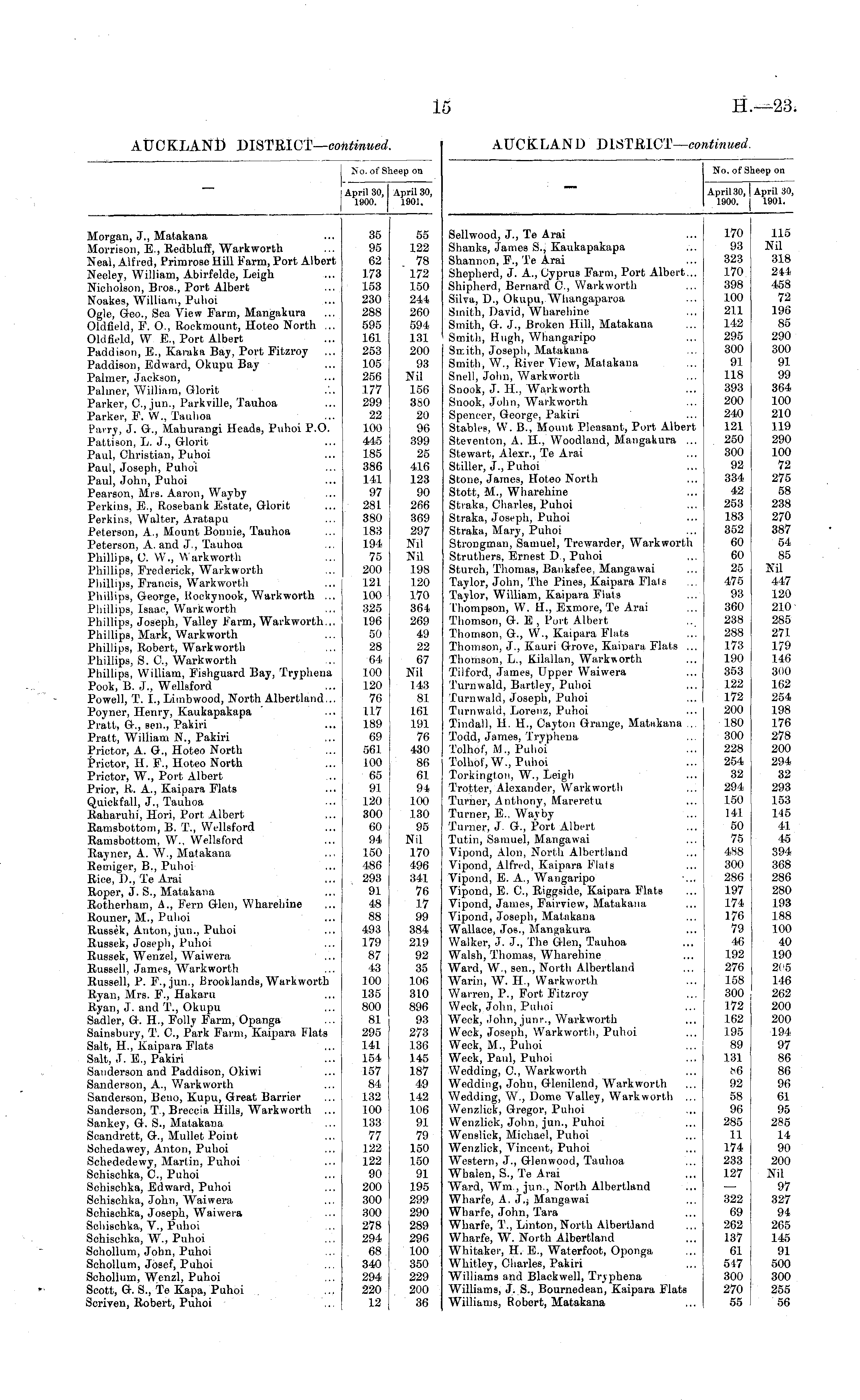 1*0. of Sheep on April 30, April 30, 1900. 1901. Morgan, J., Matakana Morrison, E., Redbluff, Warkworth Neal, Alfred, Primrose Hill Farm, Port Albert Neeley, William, Abirfelde, Leigh Nicholson, Broe., Port Albert Noakes, William, Puhoi Ogle, Q-eo., Sea View Farm, Mangakura Oldfield, F. O., Rockmount, Hoteo North ... Oldfield, W E., Port Albert Paddison, E., Karaka Bay, Port Fitzroy Paddison, Edward, Okupu Bay Palmer, Jackson, Palmer, William, Grlorit Parker, C, jun., Parkville, Tauhoa Parker, F. W., Tauhoa Parry, J. &., Mahurangi Heads, Puhoi P.O. Pattison, L. J., Glorit Paul, Christian, Puhoi Paul, Joseph, Puhoi Paul, John, Puhoi Pearson, Mrs. Aaron, Wayby Perkins, E., Rosebank Estate, Glorit Perkins, Walter, Aratapu Peterson, A., Mount Bonnie, Tauhoa Peterson, A. and J., Tauhoa Phillips, 0. W., Warkworth Phillips, Frederick, Warkworth Phillips, Francis, Warkworth Phillips, G-eorge, Hockynook, Warkworth ... Phillips, Isaac, Warkworth Phillips, Joseph, Valley Farm, Warkworth... Phillips, Mark, Warkworth Phillips, Robert, Warkworth Phillips, S. C, Warkworth Phillips, William, Fishguard Bay, Tryphena Pook, B. J., Wellsford Powell, T. I., Limbwood, North Albertland... Poyner, Henry, Kaukapakapa Pratt, G., sen., Pakiri Pratt, William N., Pakiri Prictor, A. G., Hoteo North Prictor, H. F., Hoteo North Prictor, W., Port Albert Prior, R. A., Kaipara Flats Quickfall, J., Tauhoa Raharuhi, Hori, Port Albert Ramsbottom, B. T., Wellsford Ramsbottom, W., Wellsford Rayner, A. W., Matakana Remiger, B., Puhoi Rice, I)., Te Arai Roper, J. S., Matakana Rotherham, A., Fern Glen, Wharehine Rouner, M., Puhoi Ruesek, Anton, jun., Puhoi Russek, Joseph, Puhoi Russek, Wenzel, Waiwera Russell, James, Warkworth Russell, P. F., jun., Brook lands, Warkworth Ryan, Mrs. F., Hakaru Ryan, J. and T., Okupu Sadler, G. H., Polly Farm, Opanga Sainebury, T. C, Park Farm, Kaipara Flats Salt, H., Kaipara Flats Salt, J. E., Pakiri Sanderson and Paddison, Okiwi Sanderson, A., Warkworth Sanderson, Beno, Kupu, Great Barrier Sanderson, T., Breccia Hills, Warkworth ... Sankey, G. S., Matakana Scandrett, G., Mullet Point Sehedawey, Anton, Puhoi Schededewy, Martin, Puhoi Schischka, C, Puhoi Schischka, Edward, Puhoi Sehischka, John, Waiwera Schischka, Joseph, Waiwera Schischka, V., Puhoi Sehischka, W., Puhoi Scholium, John, Puhoi Scholium, Josef, Puhoi Scholium, Wenzl, Puhoi Scott, G. S., Te Kapa, Puhoi Scriven, Robert, Puhoi 35 95 62 173 153 230 288 595 161 253 105 256 177 299 22 100 445 185 386 141 97 281 380 183 194 75 200 121 100 325 196 50 28 64 100 120 76 117 189 69 561 100 65 91 120 300 60 94 150 486 293 91 48 88 493 179 87 43 100 135 800 81 295 141 154 157 84 132 100 133 77 122 122 90 200 300 300 278 294 68 340 294 220 12 55 122 78 172 150 241 260 594 131 200 93 Nil 156 3S0 20 96 399 25 416 123 90 266 369 297 Nil Nil 198 120 170 364 269 49 22 67 Nil 143 81 161 191 76 430 86 61 94 100 130 95 Nil 170 496 341 76 17 99 384 219 92 35 106 310 896 93 273 136 145 187 49 142 106 91 79 150 150 91 195 299 290 289 296 100 350 229 200 36