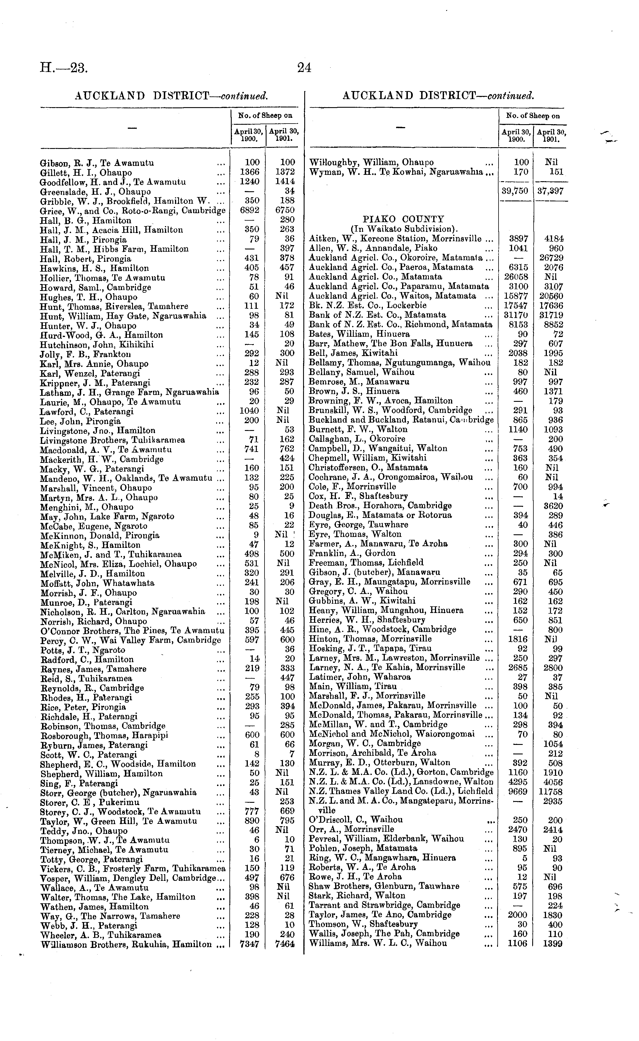 No. of Sheep Oα April30, April* 1900. 1901. April 30, 1901. Gibson, R. J., Te Awamutu Gillett, H. I., Ohaupo G-oodfellow, H. and J., Te Awamutu Greenslade, H. J., Ohaupo Gribble, W. J., Brookfield, Hamilton W. ... Grice, W., and Co., Roto-o-Rangi, Cambridge Hall, B. G., Hamilton Hall, J. M., Acacia Hill, Hamilton Hall, J. M., Pirongia Hall, T. M., Hibbs Farm, Hamilton Hall, Robert, Pirongia Hawkins, H. S., Hamilton Hollier, Thomas, Te Awamutu Howard, Saml., Cambridge Hughes, T. H., Ohaupo Hunt, Thomas, Riverelea, Tamahere Hunt, William, Hay G-ate, Ngaruawahia ... Hunter, W. J., Ohaupo Hurd-Wood, G. A., Hamilton Hutehinson, John, Kihikihi Jolly, F. B., Frankton Karl, Mrs. Annie, Ohaupo Karl, Wenzel, Paterangi Krippner, J. M., Paterangi Latham, J. H., Grange Farm, Ngaruawahia Laurie, M., Ohaupo, Te Awamutu Lawford, C, Paterangi Lee, John, Pirongia Livingstone, Jno., Hamilton Livingstone Brothers, Tuhikaramea Macdonald, A. V., Te Awamutu Mackerith, H. W., Cambridge Macky, W. G., Paterangi Mandeno, W. H., Oaklande, Te Awamutu ... Marshall, Vincent, Ohaupo Martyn, Mrs. A. L., Ohaupo Menghini, M., Ohaupo May, John, Lake Farm, Ngaroto McCabe, Eugene, Ngaroto McKinnon, Donald, Pirongia McKnight, S., Hamilton McMiken, J. and T., Tuhikaramea McNicol, Mrs. Eliza, Lochiel, Ohaupo Melville, J. D., Hamilton Moffatt, John, Whatawhata Morrish, J. F., Ohaupo Munroe, D., Paterangi Nicholson, R. H., Carlton, Ngaruawahia ... Norrisli, Richard, Ohaupo O'Connor Brothers, The Pines, Te Awamutu Percy, C. W., Wai Valley Farm, Cambridge Potts, J. T., Ngaroto Radford, C, Hamilton Raynes, James, Tamahere Reid, S., Tuhikaramea Reynolds, R., Cambridge Rhodes, H., Paterangi Rice, Peter, Pirongia Richdale, H., Paterangi Robinson, Thomas, Cambridge Rosborough, Thomas, Harapipi Ryburn, James, Paterangi Scott, W. C, Paterangi Shepherd, E. C, Woodside, Hamilton Shepherd, William, Hamilton Sing, F., Paterangi Storr, George (butcher), Ngaruawahia Storer, C. E , Pukerimu Storey, C. J., Woodstock, Te Awamutu Taylor, W., Green Hill, Te Awamutu Teddy, Jno., Ohaupo Thompson, W. J., Te Awamutu Tierney, Michael, Te Awamutu Totty, George, Paterangi Vickers, C. B., Frosterly Farm, Tuhikaramea Vosper, William, Dengley Dell, Cambridge... Wallace, A., Te Awamutu Walter, Thomas, The Lake, Hamilton Wathen, James, Hamilton Way, G., The Narrows, Tamahere Webb, J. H., Paterangi Wheeler, A. B., Tuhikaramea Williamson Brothers, Rukuhia, Hamilton ... 100 1366 1240 350 6892 350 79 431 405 78 51 60 111 98 34 145 292 12 288 232 96 20 1040 200 71 741 160 132 95 80 25 48 85 9 47 498 531 320 241 30 198 100 57 395 597 100 1372 1414 34 188 6750 280 263 36 397 378 457 91 46 Nil 172 81 49 108 20 300 Nil 293 287 50 29 Nil Nil 53 162 762 424 151 225 200 25 9 16 22 Nil I 12 500 Nil 291 206 30 Nil 102 46 445 600 36 20 333 447 98 100 394 95 285 600 66 7 130 Nil 151 Nil 253 669 795 Nil 10 71 21 119 676 Nil Nil 61 28 10 240 7464 14 219 79 255 293 95 600 61 8 142 50 25 43 777 890 46 6 30 16 150 497 98 398 46 228 128 190 7347