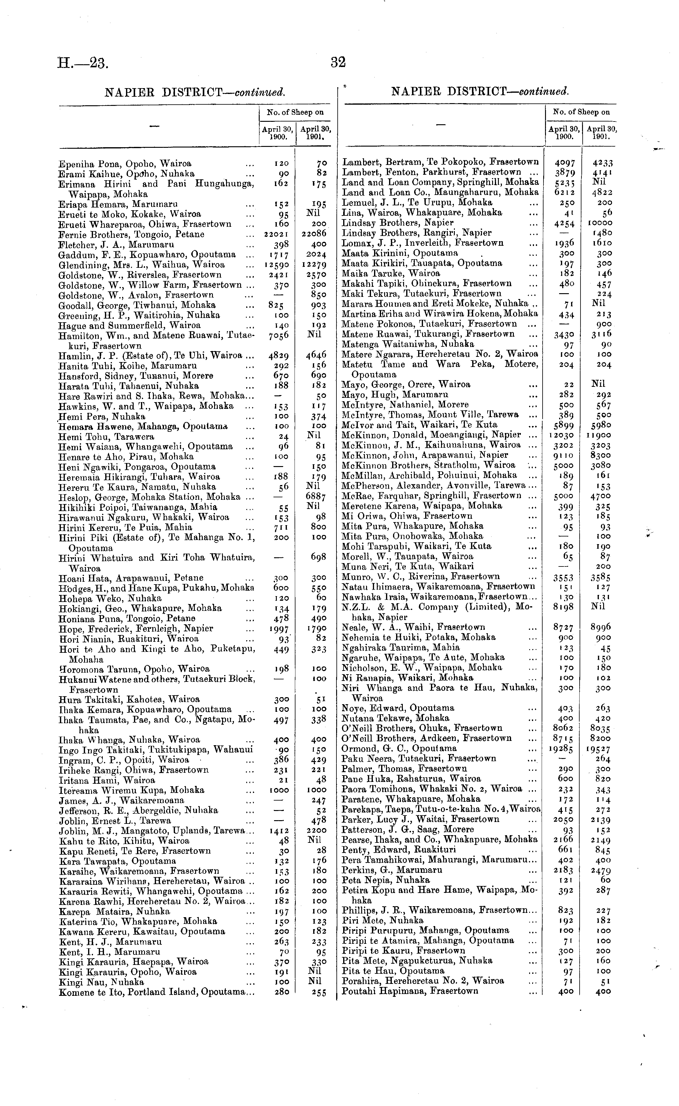 No. of Sheep on April 30, April 30. 1900. 1901. Lambert, Bertram, Te Pokopoko, Fraeertown Lambert, Penton, Parkhurst, Fraserfcown ... Land and Loan Company, Springhill, Mohaka Land and Loan Co., Maungaharuru, Mohaka Lemuel, J. L., Te Urupu, Mohaka Lina, Wairoa, Whakapuare, Mohaka Lindsay Brothers, Napier Lindsay Brothers, Rangiri, Napier Lomax, J. P., Inverleith, Frasertown llaata Kirinini, Opoutama Maata Kirikiri, Tauapata, Opoutama Maika Taruke, Wairoa Makahi Tapiki, Ohinekura, Frasertown Maki Tekura, Tutaekuri, Frasertown MararaHouineaand EretiMokeke, Nuhaka .. Martina Eriha ai)d Wirawira Hokena, Mohaka Matene Pokonoa, Tutaekuri, Frasertown ... Matene Ruawai, Tukurangi, Frasertown Matenga Waitaniwha, Nuhaka Matere Ngarara, Hereheretau No. 2, Wairoa Matetu Tame and Wara Peka, Motere, Opoutama Mayo, Q-eorge, Orere, Wairoa Mayo, Hugh, Marumaru Melntyre, Nathaniel, Morere Mclntyre, Thomas, Mount Ville, Tarewa ... Melvor and Tait, Waikari, Te Kuta MeKinnon, Donald, Moeangiangi, Napier ... McKinnon, J. M., Kaihunabuna, Wairoa ... MeKinnon, John, Arapawanui, Napier MeKinnon Brothers, Stratholm, Wairoa McMillan, Archibald, Poliuinui, Mohaka ... McPherson, Alexander, Avonville, Tarewa... McRae, Farquhar, Springhill, Frasertown ... Meretene Karena, Waipapa, Mohaka Mi Oriwa, Ohiwa, Frasertown Mita Pura, Whakapure, Mohaka Mita Pura, Onohowaka, Mohaka Mohi Tarapuhi, Waikari, Te Kuta Morell, W., Tauapata, Wairoa Muna Neri, Te Kuta, Waikari Munro, VV. C, Riverina, Frasertown Natau Ihimaera, Waikaremoana, Frasertown Nawhaka Iraia, Waikaremoana,Frasertown... N.Z.L. & M.A. Company (Limited), Mohaka, Napier Neale, W. A., Waihi, Frasertown Nehemia te Huiki, Potaka, Mohaka Ngahivaka Taurima, Mahia Ngaruhe, Waipapa, Te Aute, Mohaka Nicholson, E. W., Waipapa, Mohaka Ni Ranapia, Waikari, Mohaka Niri Whanga and Paora te Hau, Nuhaka, Wairoa Noye, Edward, Opoutama Nutana Tekawe, Mohaka O'Neill Brothers, Ohuka, Frasertown O'Neill Brothers, Ardkeen, Frasertown Ormond, Q-. C, Opoutama Paku Neera, Tutaekuri, Frasertown Palmer, Thomas, Frasertown Pane Huka, Rahaturua, Wairoa Paora Tomihona, Whakaki No. 2, Wairoa ... Paratene, Whakapuare, Mohaka Parekapa,, Taepa, Tutu-o-te-kaha No. 4, Wairoa Parker, Lucy J., Waitai, Frasertown Patterson, J. Gk, Saag, Morere Pearse, Ihaka, and Co., Whakapuare, Mohaka Penty, Edward, Ruakituri Pera Tamahikowai, Mahurangi, Marumaru... Perkins, Gk, Marumaru Peta Nepia, Nuhaka Petira Kopu and Hare Hame, Waipapa, Mohaka Phillips, J. R., Waikaremoana, Frasertown... Piri Mete, Nuhaka Piripi Purupuru, Mahanga, Opoutama Piripi te Atamira, Mahanga, Opoutama Piripi te Kauru, Frasertown Pita Mete, Ngapuketurua, Nuhaka Pita te Hau, Opoutama Porahira, Hereheretau No. 2, Wairoa Poutahi Hapimana, Frasertown 4097 3879 6212 250 4' 4254 4097 4233 3879 4'4' 523 5 Nil 6212 4822 250 20O 4' 5 6 4254 roooo — 1480 1936 1610 300 300 197 300 182 146 480 457 — 224 71 Nil 1936 300 197 182 480 434 213 — 900 343° 3 "6 7« 434 97 9° 100 100 204 204 343° 97 100 204 22 Nil 282 292 500 567 389 500 5899 5980 12030 11900 3202 3203 9110 8300 5000 3080 189 161 22 282 500 389 5899 12030 3202 9110 5000 189 87 5000 399 123 95 180 65 87 >53 5000 4700 399 325 123 '85 95 93 — 100 3553 '5' '.TO 8198 180 190 65 87 200 3553 3585 151 127 '.T° '3' 8198 Nil 8727 8996 900 900 ■23 45 100 150 170 180 8727 900 '23 100 170 100 100 102 300 300 300 403 263 400 420 8062 8035 8715 8200 19285 19527 264 290 300 600 820 4°3 400 8062 87'5 19285 343 172 114 415 272 2050 2139 93 152 2166 2149 661 845 402 400 2183 2479 121 60 392 287 290 600 232 172 415 2050 93 2166 661 402 2183 121 392 823 227 192 182 100 100 71 100 300 200 127 160 823 192 100 i> 300 127 97 7' 400 97 100 7' 5> 400 400
