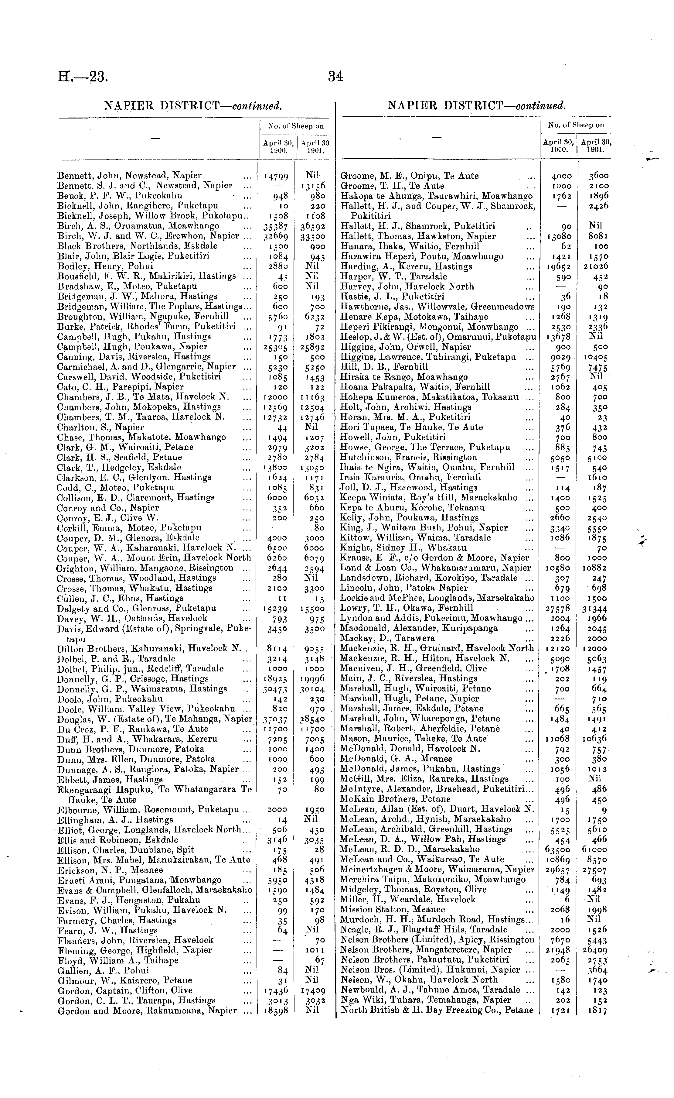 o.o. teep on wo. oi oiieep on April 3D, April 30 1900. 1901. Bennett, John, Newstead, Napier Bennett, S. J. and C, Newstead, Napier ... Beuek, P. F. W., Pukeokalm • ... Bicknell, John, Rar.gihere, Puketapu Bicknell, Joseph, Willow Brook, Puketapu... Birch, A. S., Oruamatua, Moawhango Bircli, W. J. and W. C, Erewhon, Napier ... Black Brothers, Northlands, Eskdale Blair, John, Blair Logie, Puketitiri Bodley, Henry. Pohui Bousfield, 1C. W. R., Makirikiri, Hastings ... Bradshaw, E., Moteo, Pnketapu Bridgeman, J. W., Mahora, Hastings Bridgeman, William, The Poplars, Hastings... Broughton, William, Ngapuke, Fernhill Burke, Patrick, Rhodes' Farm, Puketitiri ... Campbell, Hugh, Pukahu, Hastings Campbell, Hugh, Poukawa, Napier Canning, Davis, Riverslea, Hastings Carmichael, A. and D., Glengarrie, Napier ... Carswell, David, Woodside, Puketitiri Cato, C. H., Parepipi, Napier Chambers, J. B., Te Mata, Haveloek N. ... Chambers, John, Mokopeka, Hastings Chambers, T. M., Tauroa, Havelock N. Charlton, S., Napier Chase, Thomas, Makatote, Moawhango Clark, G. M., Wairoaiti, Petane Clark, H. 8., Seafield, Petane Clark, T., Hedgeley, Eskdale Clarkson, E. 0., G-lenlyon, Hastings Codd, 0., Moteo, Puketapu Collison, E. D., Claremont, Hastings Conroy and Co., Napier Conroy, E. J., Clive W. Corkill, Emma, Moteo, Puketapu Couper, D. M., Glenora, Eskdale Couper, W. A., Kaharanaki, Havelock N. ... Couper, W. A., Mount Erin, Havelock North Crighton, William, Mangaone, Riseington ... Crosse, Thomas, Woodland, Hastings Crosse, Thomas, Whakatu, Hastings Cullen, J. C, Elms, Hastings Dalgety and Co., Glenross, Puketapu Davey, W. H., Oatlands, Havelock Davis, Edward (Estate of), Springvale, Puketapu Dillon Brothers, Kahuranaki, Havelock N.... Dolbel, P. and R., Taradale Dolbel, Philip, jun., Redcliff, Taradale Donnelly, G. P., Crissoge, Hastings Donnelly, 6. P., Waimarama, Hastings Poole, Jolm, Pukeokahu Doole, William, Valley View, Pukeokahu ... Douglas, W. (Estate of), Te Mahanga, Napier Du Croz, P. F., Raukawa, Te Aute Duff , , H. and A., Whakarara, Kereru Dunn Brothers, Dunmore, Patoka Dunn, Mrs. Ellen, Dunmore, Patoka Dunnage, A. S., Rangiora, Patoka, Napier ... Ebbett, James, Hastings Ekengarangi Hapuku, Te Whatangarara Te Hauke, Te Ante Elbourne, William, Rosemount, Puketapu ... Ellingham, A. J., Hastings Elliot, G-eorge, Longlands, Havelock North... Ellis and Robinson, Eskdale Ellison, Charles, Dunblane, Spit Ellison, Mrs. Mabel, Manukairakau, Te Aute Erickson, N. P., Meanee Erueti Arani, Pungatana, Moawhango Evans & Campbell, Glenl'alloch, Maraekakaho Evans, E. J., Hengaston, Pukahu Evison, William, Pukahu, Havelock N. Farmery, Charles, Hastings Fearn, J. W., Hastings Flanders, John, Riverslea, Havelock Fleming, George, Highfield, Napier Floyd, William A., Taihape Gallien, A. F., Pohui Gilmour, W., Kaiarero, Petane Gordon, Captain, Clifton, Clive Gordon, C. L. T., Taurapa, Hastings Gordon and Moore, Rakaumoana, Napier ... 14799 Nil — '3'5 6 948 980 10 2 2O 1508 1108 35387 36592 32669 33500 1500 qoo 1084 945 2880 Nil 4; Nil 600 Nil 2 5° '93 600 700 5760 6232 91 72 1773 1802 2 53°S 25892 150 500 5 2 3° 5 2 5° IO 8.S 1453 120 122 12000 1 11 63 12569 12504 12732 12746 44 Nil 1494 1207 2979 3202 2780 2784 13800 13050 1624 1171 1085 831 6000 6032 352 660 200 250 80 4000 3°o° 6500 6000 6260 6079 2644 2594 280 Nil 2100 3300 11 '5 15239 '55°° 793 975 345° 35°° '4799 948 10 1508 35387 32669 1500 1084 2880 45 600 250 600 576o 9' '773 2 53°S '5° 5 2 3° 1085 120 j 2000 '25 6 9 12732 44 '494 2979 2780 13800 1624 .085 6000 352 200 4000 6500 6260 2644 280 2100 11 '5 2 39 793 345° 8114 9055 3214 3148 rooo 1000 18925 19996 30473 3» IO 4 142 230 820 970 37°37 38540 1 1700 1 1 700 7205 7005 1000 1400 1000 600 8114 3 2I 4 1000 18925 3O473 142 820 37°37 11700 7205 1000 1000 200 493 152 199 70 80 200 'S 2 70 2000 1950 14 Nil 2000 '4 506 3146 '75 468 '8S 595° 1590 250 99 35 64 506 450 3'46 3°35 175 28 468 49 1 185 506 595° 43'8 1590 1484 250 592 99 '7° 35 98 64 Nil 70 — 101 1 - 67 84 Nil 31 Nil ' 74.?6 1 74O9 3013 3032 18598 Nil 84 3' 17436 3O' 3 18598