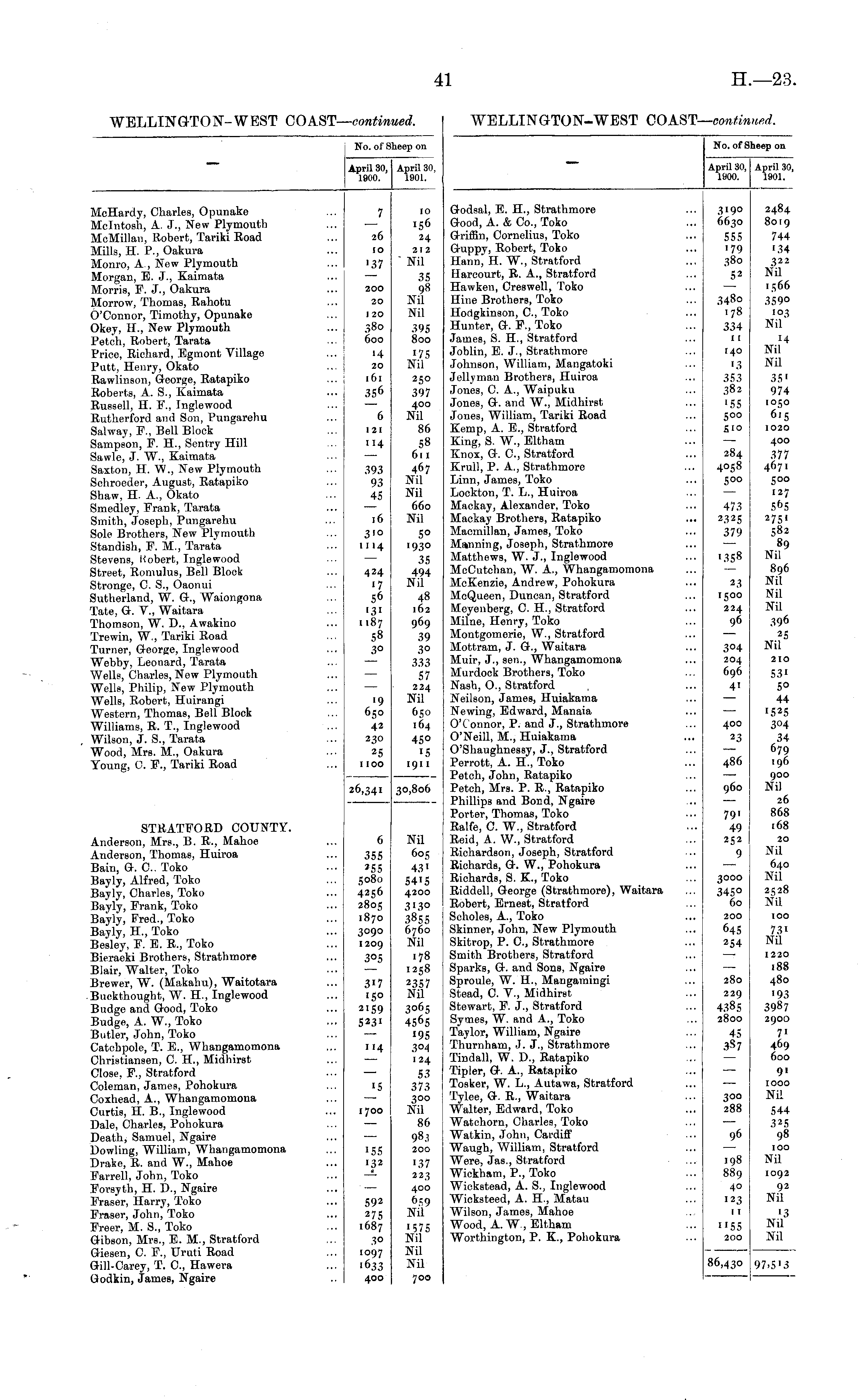 No. of Sheep on April 30, 1900. April 30, 1901. McHardy, Charles, Opunake Mclntosh, A. J., New Plymouth McMillan, Robert, Tariki Road Mills, H. P., Oakura Monro, A , New Plymouth Morgan, E. J., Kaimata Morris, F. J., Oakura Morrow, Thomas, Rahotu O'Connor, Timothy, Opunake Okey, H., New Plymouth Petch, Robert, Tarata Price, Richard, Bgmont Village Putt, Henry, Okato Rawlinson, George, Ratapiko Roberts, A. S., Kaimata Russell, H. F., Inglewood Rutherford and Son, Pungarehu Salway, F., Bell Block Sampson, F. H., Sentry Hill Sawle, J. W., Kaimata Saxton, H. W., New Plymouth Sehroeder, August, Ratapiko Shaw, H. A., Okato Smedley, Frank, Tarata Smith, Joseph, Pungarehu Sole Brothers, New Plymouth Standish, F. M., Tarata Stevens, Koberfc, Inglewood Street, Romulus, Bell Block Stronge, C. S., Oaonui Sutherland, W. G-., Waiongona Tate, G. V., Waitara Thomson, W. D., Awakino Trewin, W., Tariki Road Turner, George, Inglewood Webby, Leonard, Tarata Wells, Charles, New Plymouth Wella, Philip, New Plymouth Wells, Robert, Huirangi Western, Thomas, Bell Block Williams, R. T., Inglewood Wilson, J. S., Tarata Wood, Mrs. M., Oakura Young, 0. F., Tariki Road 7 26 10 "37 200 20 120 380 600 >4 20 161 356 6 121 114 393 93 45 10 156 24 212 ' Nil 35 98 Nil Nil 395 800 175 Nil 250 397 400 Nil 86 58 611 467 Nil Nil 660 Nil 16 310 1114 424 17 56 131 1187 58 3° 5° 1930 35 494 Nil 48 162 969 39 3° 333 57 224 Nil 650 164 45° 15 1911 30,806 '9 650 42 230 2 5 1100 26,341 STRATFORD COUNTY. Anderson, Mrs., B. R., Mahoe Anderson, Thomas, Huiroa Bain, G. 0.. Toko Bayly, Alfred, Toko Bayly, Charles, Toko Bayly, Frank, Toko Bayly, Fred., Toko Bayly, H., Toko Besley, F. B. R., Toko Bieraeki Brothers, Strathmore Blair, Walter, Toko Brewer, W. (Makahu), Waitotara Buckthought, W. H., Inglewood Budge and Good, Toko Budge, A. W., Toko Butler, John, Toko Catchpole, T. E., Whangamomona Christiansen, C. H., Midhirst Close, F., Stratford Coleman, James, Pohokura Coxhead, A., Whangamomona Curtis, H. B., Inglewood Dale, Charles, Pohokura Death, Samuel, Ngaire Dowling, William, Whangamomona Drake, R. and W., Mahoe Farrell, John, Toko Forsyth, H. D., Ngaire Fraser, Harry, Toko Fraser, John, Toko Freer, M. S., Toko Gibson, Mrs., E. M., Stratford Giesen, C. F., TJruti Road Gill-Carey, T. C, Hawera Godkin, James, Ngaire 6 355 3 55 5080 4256 2805 1870 3090 1209 3°5 3'7 '5° 2"S9 5231 114 Nil 605 43 ■ 5415 4200 3130 3855 6760 Nil 178 1258 2357 Nil 3065 45 6 5 195 3°4 124 53 373 300 Nil 86 98.1 200 137 223 400 &S9 Nil 1575 Nil Nil Nil 15 1700 155 132 59 2 275 1687 3° 1097 1633 400 700