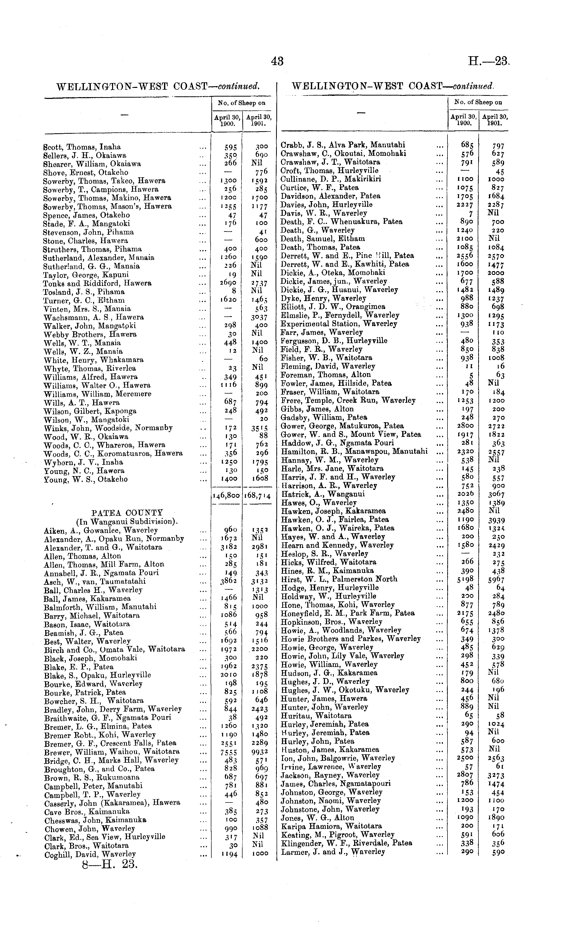 No. of Sheep on April 30, 1800. April 30, 1901. Crabb, J. S., Alva Park, Manutahi Crawshaw, C., Okoutai, Momohaki Crawshaw, J. T., Waitotara Croft, Thomas, Hurleyville Cullinane, D. P., Makirikiri Curtice, W. F., Patea Davidson, Alexander, Patea Davies, John, Hurley ville Davis, W. R., Waverley Death, F. C. Whenuakura, Patea Death, G., Waverley Death, Samuel, Eltham Death, Thomas, Patea Derrett, W. and B., Pine Hill, Patea Derrett, W. and B., Kawhiti, Patea Dickie, A., Oteka, Momohaki Dickie, James, jun., Waverley Dickie, J. G., Huanui, Waverley Dyke, Henry, Waverley Elliott, J. D. W., Orangimea Elmslie, P., Fernydell, Waverley Experimental Station, Waverley Farr, James, Waverley Fergusson, D. B., Hurley ville Field, F. B., Waverley Fisher, W. B., Waitotara Fleming, David, Waverley Foreman, Thomas, Alton Fowler, James, Hillside, Patea Fraser, William, Waitotara Frere, Temple, Creek Run, Waverley G-ibbs, James, Alton Q-adsby, William, Patea Gower, George, Matukuroa, Patea Gower, W. and S., Mount View, Patea Haddow, J. G., Ngamata Pouri Hamilton, R. B., Manawapou, Manutahi ... Hannay, W. M., Waverley Harle, Mrs. Jane, Waitotara Harris, J. F. and H., Waverley Harrison, A. R., Waverley Hatrick, A., Wanganui Hawes, O., Waverley Hawken, Joseph, Kakaramea Hawken, O. J., Fairlea, Patea Hawken, 0. J., Waireka, Patea Hayes, W. and A., Waverley Hearn and Kennedy, Waverley Heslop, S. R., Waverley Hicks, Wilfred, Waitotara Hines, R. M., Kaimanuka Hirst, W. L., Palmerston North Hodge, Henry, Hurleyville Hold way, W., Hurleyville Hone, Thomas, Kohi, Waverley Honeyfield, E. M., Park Farm, Patea Hopkinson, Bros., Waverley Howie, A., Woodlands, Waverley Howie Brothers and Parkes, Waverley Howie, George, Waverley Howie, John, Lily Vale, Waverley Howie, William, Waverley Hudson, J. G., Kakaramea Hughes, J. D., Waverley Hughes, J. W., Okotuku, Waverley Hunter, James, Hawera Hunter, John, Waverley Huritau, Waitotara Hurley, Jeremiah, Patea Hurley, Jeremiah, Patea Hurley, John, Patea Huston, James, Kakaramea Ion, Jolm, Balgowrie, Waverley Irvine, Lawrence, Waverley Jackson, Rayney, Waverley James, Charles, Ngamatapouri Johnston, George, Waverley Johnston, Naomi, Waverley Johnstone, John, Waverley Jones, W. G., Alton Karipa Hamiora, Waitotara Keating, M., Pigroot, Waverley Klingender, W. F., Riverdale, Patea Larmer, J. and J., Waverley 68s 576 791 797 627 589 45 1000 827 1684 2287 Nil 700 220 Nil 1084 2570 1477 2000 588 1489 1237 698 I2 95 I] 73 110 353 838 1008 16 63 Nil .84 1200 200 270 2722 [822 363 2557 Nil 238 557 900 3067 '3«9 Nil 1100 '°75 '7°5 2227 7 890 1240 2100 1085 2556 1600 1700 677 1482 988 880 1300 9.?8 480 850 938 11 5 48 170 '253 ■97 248 2800 1917 281 2320 538 MS 580 752 202b 135° 7,480 1190 1680 200 1580 266 39° 5'98 48 200 877 2<75 655 674 349 485 298 45 2 179 800 244 456 889 65 290 94 587 573 2500 57 2807 786 "53 1200 3939 132* 250 2429 232 275 438 5967 64 284 789 2480 856 '378 300 629 339 578 Nil 680 196 Nil Nil 58 1024 Nil 600 Nil 2563 61 3273 1474 454 1 ioo 170 1890 171 606 356 59° •93 1090 200 591 338 290