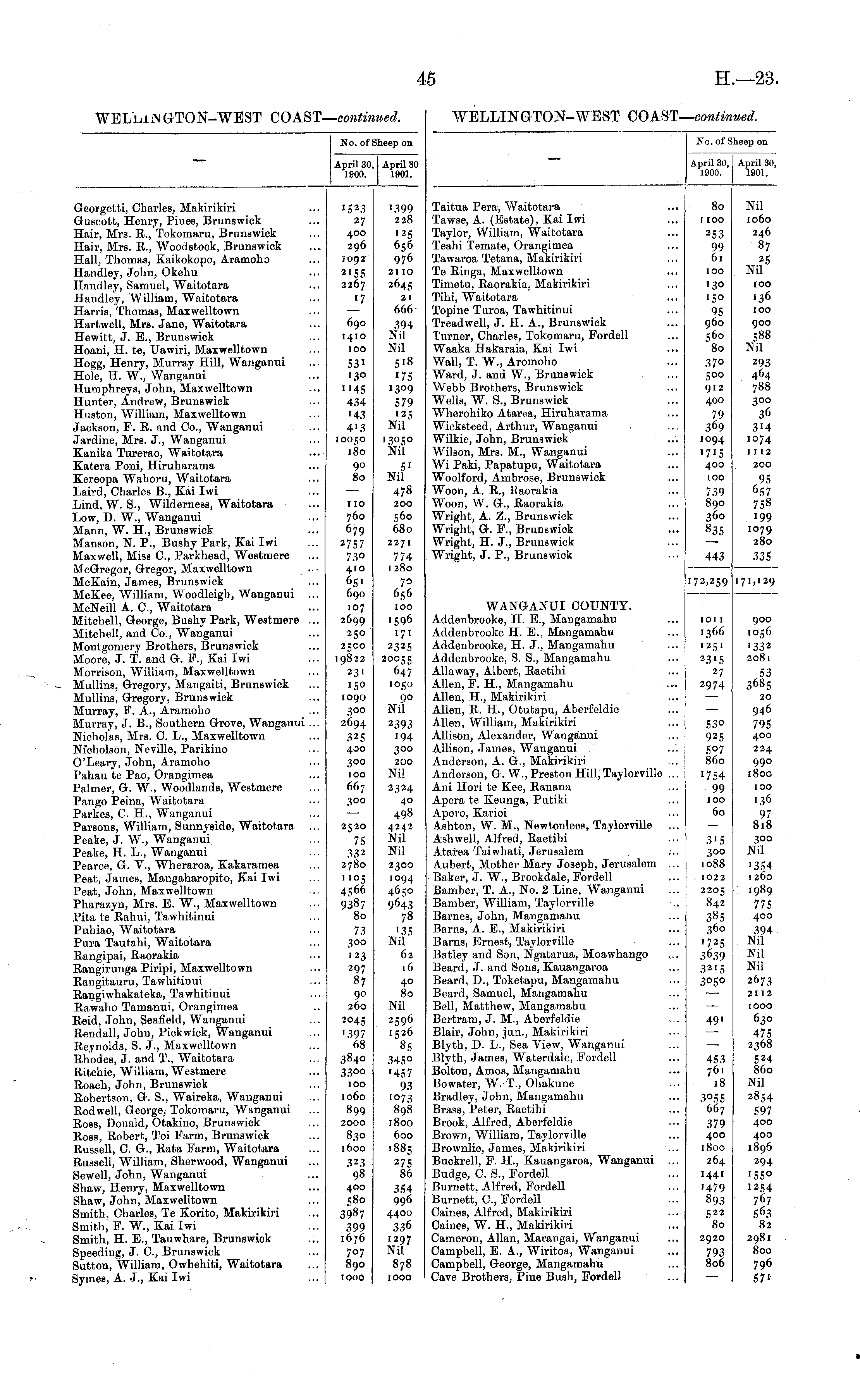 Ko. of Sheep on April 30, April 3 1900. 1901. April 30 1901. Georgetti, Charles, Makirikiri Guscott, Henry, Pines, Brunswick Hair, Mrs. R., Tokomaru, Brunewick Hair, Mrs. R., Woodstock, Brunswick Hall, Thomas, Kaikokopo, Aramoho Handley, John, Okehu Handley, Samuel, Waitotara Handley, William, Waitotara Harris, Thomas, Maxwelltown Hartwell, Mrs. Jane, Waitotara Hewitt, J. E., Brunswick Hoani, H. te, Uawiri, Maxwelltown Hogg, Henry, Murray Hill, Wanganui Hole, H. W., Wanganui Humphreys, John, Maxwelltown Hunter, Andrew, Brunswick Huston, William, Maxwelltown Jackson, P. R. and Co., Wanganui Jardine, Mrs. J., Wanganui Kanikii Turerao, Waitotara Katera Poni, Hiruharama Kereopa Wahoru, Waitotara Laird, Charles B., Kai Iwi Lind, W. S., Wilderness, Waitotara Low, D. W., Wanganui Mann, W. H., Brunswick Manson, N. P., Bushy Park, Kai Iwi Maxwell, Miss C, Parkhead, Westmere McGregor, Gregor, Maxwelltown ..■ McKain, James, Brunswick McKee, William, Woodleigh, Wanganui ... McNeill A. C, Waitotara Mitchell, George, Bushy Park, Westmere ... Mitchell, and Co., Wanganui Montgomery Brothers, Brunswick Moore, J. T. and G. F., Kai Iwi Morrison, William, Maxwelltown Mullins, Gregory, Mangaiti, Brunswick Mullins, Gregory, Brunswick Murray, F. A., Aramoho Murray, J. B., Southern Grove, Wanganui ... Nicholas, Mrs. C. L., Maxwelltown Nicholson, Neville, Parikino O'Leary, John, Aramoho Pahau te Pao, Orangimea Palmer, G. W., Woodlands, Westmere Pango Peina, Waitotara Parkes, C. H., Wanganui Parsons, William, Sunnyeide, Waitotara ... Peake, J. W., Wanganui Peake, H. L., Wanganui Pearce, G. V., Wheraroa, Kakaramea Peat, James, Mangaharopito, Kai Iwi Peat, John, Maxwelltown Pharazyn, Mrs. E. W., Maxwelltown Pita te Rahui, Tawhitinui Puhiao, Waitotara Pura Tautahi, Waitotara Rangipai, Eaorakia Eangirunga Piripi, Maxwelltown Rangitauru, Tawhitinui Rangiwhakateka, Tawhitinui Rawaho Tamanui, Orangimea Reid, John, Seafield, Wanganui Rendall, John, Pickwick, Wanganui Reynolds, S. J., Maxwelltown Rhodes, J. and T., Waitotara Ritchie, William, Westmere Roach, John, Brunswick Robertson, G. S., Waireka, Wanganui Rodwell, George, Tokomaru, Wanganui Ross, Donald, Otakino, Brunswick Ross, Robert, Toi Farm, Brunswick Russell, 0. G., Rata Farm, Waitotara Russell, William, Sherwood, Wanganui Sewell, John, Wanganui Shaw, Henry, Maxwelltown Shaw, John, Maxwelltown Smith, Charles, Te Korito, Makirikiri Smith, F. W., Kai Iwi Smith, H. E., Tauwhare, Brunswick Speeding, J. C, Brunswick Sutton, William, Owhehiti, Waitotara Symes, A. J., Kai Iwi 1523 27 400 296 iO92 2>55 2267 '7 690 1410 100 53' 130 i>45 434 '43 4'3 10030 180 90 80 110 760 679 2757 73O 410 65' 690 107 2699 250 2500 19822 231 150 1090 3°° 2694 325 400 300 100 667 300 '399 2 28 65b 976 2IIO 2645 21 666 394 Nil Nil 5i8 "75 1309 579 125 Nil '3°5° Nil 51 Nil 478 200 560 680 2271 774 1280 70 6 S 6 100 I59 6 171 2325 20055 647 1050 9° Nil 2393 •94 300 200 Nil 2520 75 332 2780 >'°5 4566 9387 80 73 300 123 297 87 90 260 2045 '397 68 3840 33O0 100 1060 899 2000 830 1600 2324 40 498 4242 Nil Nil 2300 1094 4650 9 6 43 78 "35 Nil 62 16 40 80 Nil 2596 1526 8S 345° '457 93 >°73 898 1800 600 1885 275 86 323 98 400 580 3987 399 1676 707 890 1000 354 996 4400 336 1297 Nil 878 1000
