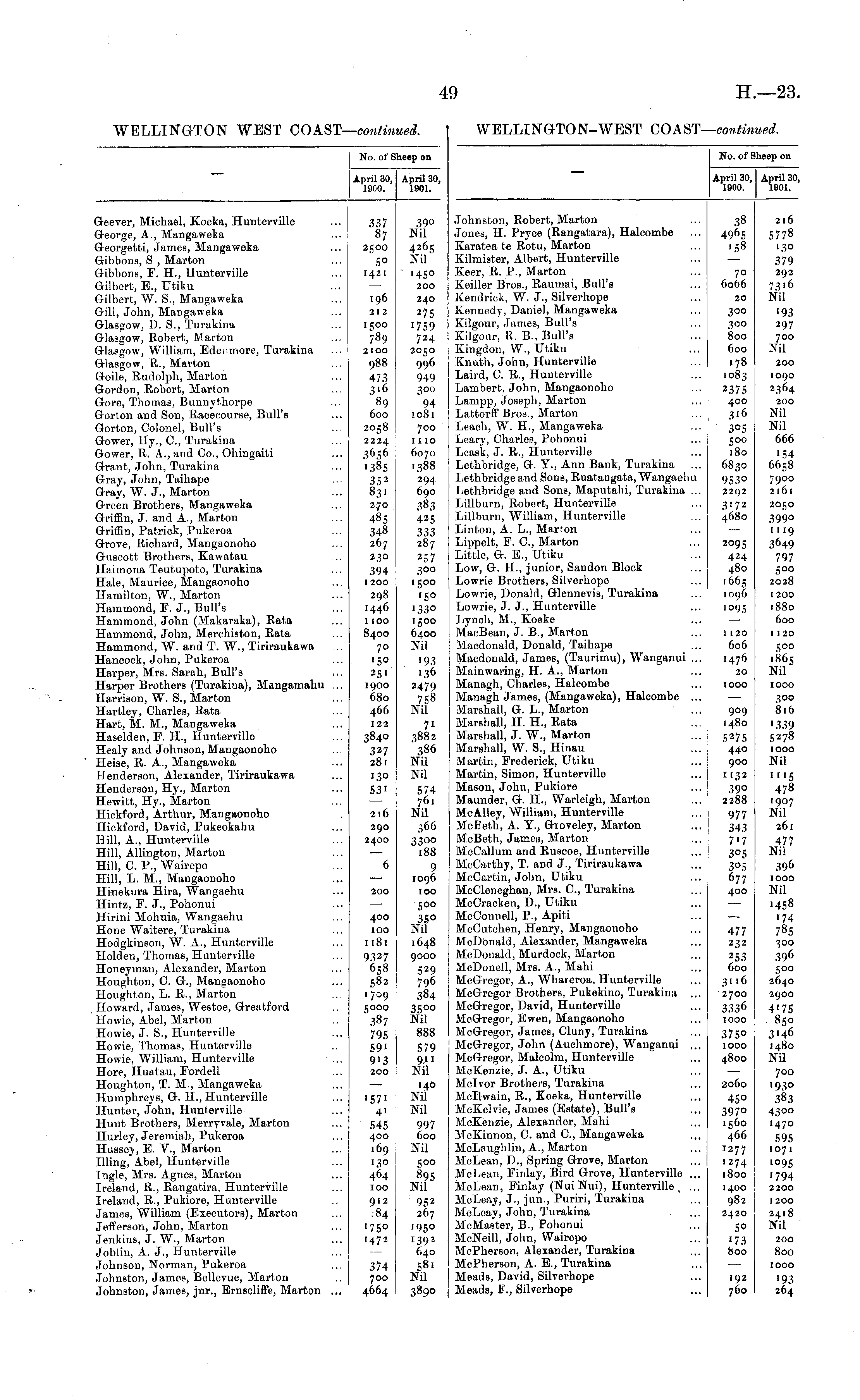 No. of Sheep on April 30, 1900. April 30, 1901. Geever, Michael, Koeka, Hunterville George, A., Mangaweka Georgetti, James, Mangaweka Gibbons, S , Marton Gibbons, F. H., Hunterville Gilbert, B., Xltiku Gilbert, W. S., Mangaweka Gill, John, Mangaweka Glasgow, D. S., Turakina Glasgow, Robert, Marton Glasgow, William, Edenmore, Turakina Glasgow, R., Mai'ton Goile, Rudolph, Marton Gordon, Robert, Marton Gore, Thomas, Bunnythorpe Gorton and Son, Racecourse, Bull's Gorton, Colonel, Bull's Qower, Hy., C, Turakina Gower, R. A., and Co., Ohingaiti Grant, John, Turakina Gray, John, Taihape Gray, W. J., Marton Green Brothers, Mangaweka Griffin, J. and A., Marton Griffin, Patrick, Pukeroa Grove, Richard, Mangaonoho Guscott Brothers, Kawatau Hairnona Teutupoto, Turakina Hale, Maurice, Mangaonoho Hamilton, W., Marton Hammond, F. J., Bull's Hammond, John (Makaraka), Rata Hammond, John, Merchiston, Rata Hammond, W. and T. W., Tiriraukawa Hancock, John, Pukeroa Harper, Mrs. Sarah, Bull's Harper Brothers (Turakina), Mangamahu .., Harrison, W. S., Marton Hartley, Charles, Rata Hart, M. M., Mangaweka Haselden, F. H., Hunterville Healy and Johnson, Mangaonoho Heise, R. A., Mangaweka Henderson, Alexander, Tiriraukawa Henderson, Hy., Marton Hewitt, Hy., Marton Hickford, Arthur, Mangaonoho Hickford, David, Pukeokahu Hill, A., Hunterville Hill, Allington, Marton Hill, C. P., Wairepo Hill, L. M., Mangaonoho Hinekura Hira, Wangaehu Hintz, F. J., Pohonui Hirini Mohuia, Wangaehu Hone Waitere, Turakina Hodgkinson, W. A., Hunterville Holden, Thomas, Hunterville Honeyman, Alexander, Marton Houghton, C. G., Mangaonoho Houghton, L. R., Marton Howard, James, Westoe, Greatford Howie, Abel, Marton Howie, J. S., Hunterville Howie, Thomas, Hunterville Howie, William, Hunterville Hore, Huatau, Fordell Houghton, T. M., Mangaweka Humphreys, G. H., Hunterville Hunter, John, Hunterville Hunt Brothers, Merry vale, Marton Hurley, Jeremiah, Pukeroa Hussey, E. V., Marton Illing, Abel, Hunterville Ingle, Mrs. Agnes, Marton Ireland, R., Rangatira, Hunterville Ireland, R., Pukiore, Hunterville James, William (Executors), Marton Jefferson, John, Marton Jenkins, J. W., Marton Joblin, A. J., Hunterville Johnson, Norman, Pukeroa Johnston, James, Bellevue, Marton Johnston, James, jnr., Ernscliffe, Marton ... 337 87 2500 5° 1421 196 212 1500 789 2IOO 988 473 316 89 600 2058 2224 3656 138S 352 83' 270 485 348 267 230 394 1200 298 1446 1100 8400 70 '5° 25' 1900 680 466 122 3840 327 281 390 Nil 4265 Nil ' '45° 200 240 275 1759 724 2050 996 949 300 94 1081 700 1 no 6070 1388 294 690 383 425 333 287 m 300 1500 150 1330 1500 6400 Nil '93 136 2479 758 Nil 7i 3882 386 Nil Nil 574 761 Nil 366 3300 188 9 1096 100 500 35° Nil 1648 9000 529 796 384 35°° Nil 888 130 53' 216 290 2400 6 200 400 100 1181 9327 658 582 1709 5000 387 795 591 9'3 200 579 911 Nil '571 4> 545 400 169 130 464 100 912 ,84 ■75° 1472 140 Nil Nil 997 600 Nil 500 895 Nil 952 267 1950 I39 J 640 581 Nil 3890 374 700 4664