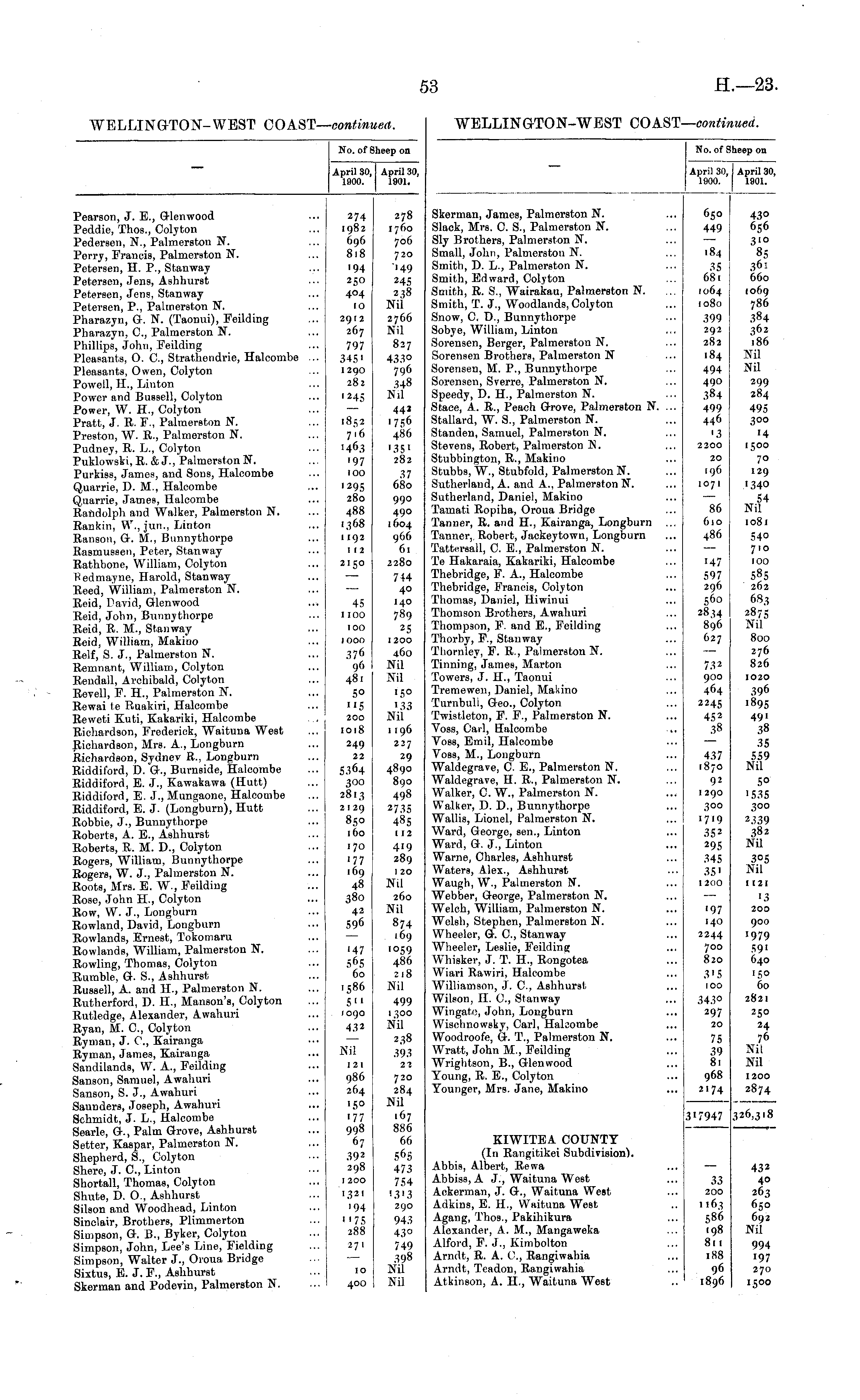No. of Sheep on April 30, April 30, 1900. 1901. Pearson, J. E., Glenwood Peddie, Thos., Colyton Pedersen, N., Palmerston N. Perry, Francis, Palmerston N. Petersen, H. P., Stanway Petersen, Jens, Ashhurst Petersen, Jens, Stanway Petersen, P., Palmer8ton N. Pharazyn, G-. N. (Taonui), Feilding Pharazyn, C, Palmerston N\ Phillips, John, Feilding Pleasants, O. C, Strathendrie, Halcombe ... Pleasants, Owen, Colyton Powell, H., Linton Power and Bussell, Colyton Power, W. H., Colyton Pratt, J. R. F., Palmerston N. Preston, W. R., Palraerston N. Pudney, R. L., Colyton Puklowski, R. & J., Palmerston N. Purkiss, James, and Sons, Haleombe Quarrie, D. M., Halcombe Quarrie, James, Halcombe Randolph and Walker, Palmerston N. Rankin, W., jun., Linton Ranson, G. M,, Bunnythorpe Rasmussen, Peter, Stanway Rathbone, William, Colyton Kedmayne, Harold, Stanway Reed, William, Palmerston N. Reid, David, Glenwood Reid, John, Bunnythorpe Reid, R. M., Stanway Reid, William, Makino Relf, S. J., Palmerston N. Remnant, William, Colyton Rendall, Archibald, Colyton Revell, F. H., Palmeraton N. Rewai te Ruakiri, Halcombe Reweti Kuti, Kakariki, Halcombe Richardson, Frederick, Waituna West Richardson, Mrs. A., Longburn Richardson, Sydnev R., Longburn Riddiford, D. G., Burnside, Halcombe Riddiford, E. J., Kawakawa (Hutt) Riddiford, E. J., Mungaone, Halcombe Riddiford, E. J. (Longburn), Hutt Robbie, J., Bunnythorpe Roberts, A. E., Aehhurst Roberts, R. M. D., Colyton Rogers, William, Bunnythorpe Rogers, W. J., Palmerston N. Roots, Mrs. E. W., Feilding Rose, John H., Colyton Row, W. J., Longburn Rowland, David, Longburn Rowlands, Ernest, Tokomaru Rowlands, William, Palmerston N. Rowling, Thomas, Colyton Rumble, G. S., Ashhurst Russell, A. and H., Palmereton N. Rutherford, D. H., Manson's, Colyton Rutledge, Alexander, Awahuri Ryan, M. C, Colyton Ryman, J. C, Kairanga Ryman, James, Kairanga Sandilands, W. A., Feilding Sanson, Samuel, Awahuri Sanson, S. J., Awahuri Saunders, Joseph, Awahuri Schmidt, J. L., Halcombe Searle, G., Palm Grove, Aehhurst Setter, Kaspar, Palmerston N. Shepherd, S., Colyton Shere, J. C, Linton Shortall, Thomas, Colyton Shute, D. 0., Ashhurst Silson and Woodhead, Linton Sinclair, Brothers, Plimmerton Simpson, G. B., Byker, Colyton Simpson, John, Lee's Line, Fielding Simpson, Walter J., Oroua Bridge Sixtus, E. J. F., Ashhurst Skerman and Podevin, Palmerston N. 274 1982 696 818 194 250 404 10 2912 267 797 345' 1290 282 ■245 1852 716 '463 197 100 ■295 280 488 1368 1192 112 2150 45 1100 100 1000 376 96 481 5° "5 200 IOl8 249 22 5364 300 2813 2 129 85O 160 278 1760 706 720 "'49 245 238 Nil 2766 Nil 827 433° 796 348 Nil 442 1756 486 '35' 282 37 680 990 49° 1604 966 61 2280 744 40 140 789 25 1200 460 Nil Nil ■5° 133 Nil 1196 227 29 4890 890 498 2735 485 112 170 177 169 48 38O 419 289 1 20 Nil 260 Nil 874 169 '°59 486 218 Nil 42 596 '47 565 60 1586 5" /090 432 Nil 121 986 264 '5° '77 998 67 39 2 298 1200 499 1 Nil 238 393 22 720 284 Nil 167 886 66 56s 473 754 290 943 43° 749 398 Nil Nil 1321 '94 "75 288 271 jo 400