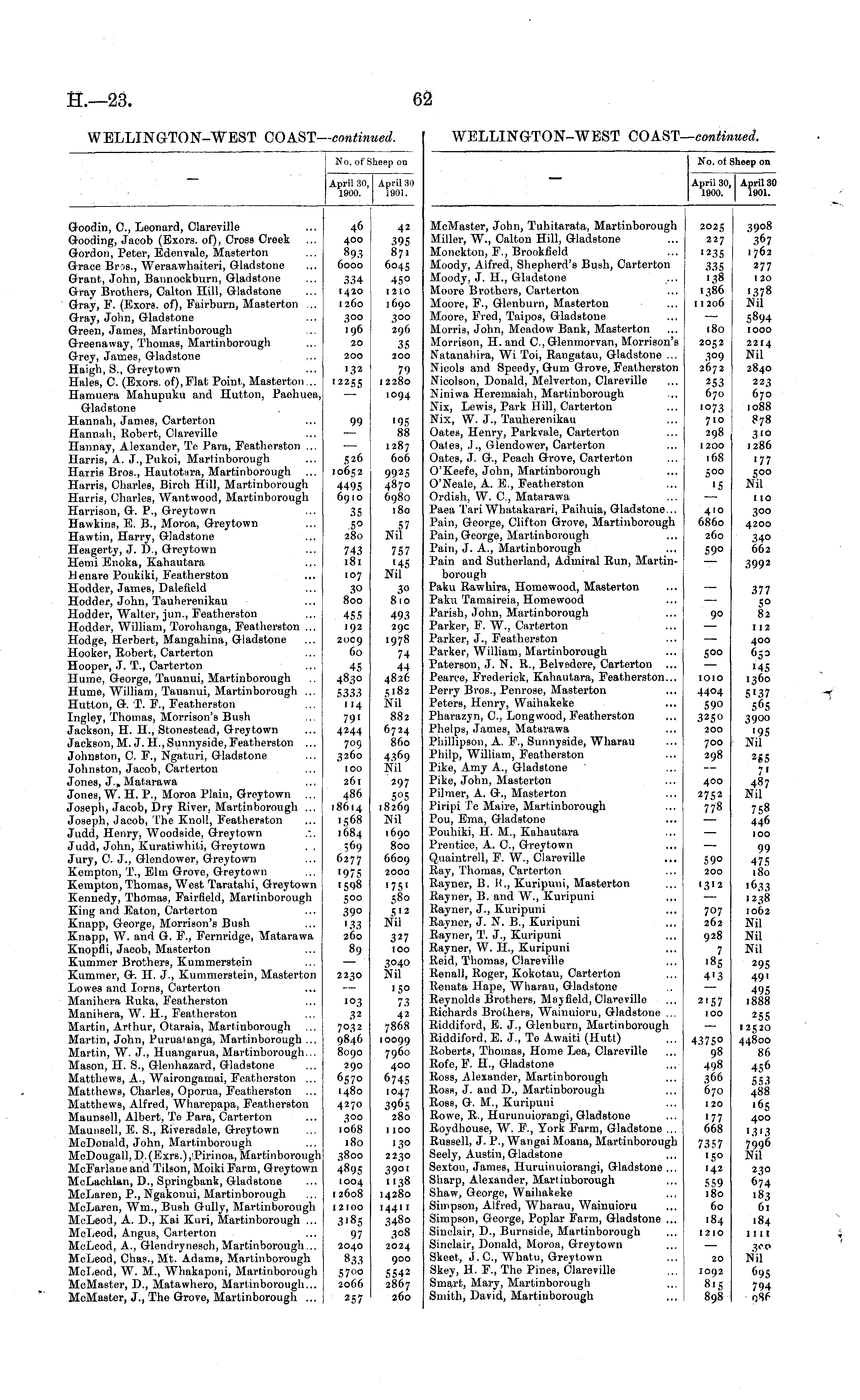 No. of Sheep on April 30, April 30 1900. 1001. Goodin, 0., Leonard, Clareville Gooding, Jacob (Exors. of), Cross Creek G-ordon, Peter, Bdenvale, Maaterton Grace Bros., Weraawhaiteri, Gladstone Grant, John, Bannockburn, Gladstone Gray Brothers, Calton Hill, Gladstone Gray, F. (Exors. of), Fairburn, Maeterton ... Gray, John, Gladstone Green, James, Martinborough Qreenaway, Thomas, Martinborough Grey, James, Gladstone Haigh, S., G-revtown Hales, C. (Exors. of),Flat Point, Masterton... Hamuera Mahupuku and Hutton, Paehuea, Gladstone Hannah, James, Carterton Hannah, Robert, Clareville Hannay, Alexander, Te Para, Featherston ... Harris, A. J., Pukoi, Martinborough Harris Bros., Hautotara, Martinborough Harris, Charles, Birch Hill, Martinborough Harris, Charles, Wantwood, Martinborough Harrison, Q-. P., Grreytown Hawkins, B. B., Moroa, Greytown Hawtin, Harry, Gladstone Heagerty, J. D., Greytown Hemi Enoka, Kahautara .Henare Poukiki, Featherston Hodder, James, Dalefield Hodder, John, Tauherenikau Hodder, Walter, jun., Featherston Hodder, William, Torohanga, Featherston ... Hodge, Herbert, Mangahina, Gladstone Hooker, Robert, Carterton Hooper, J. T., Carterton Hume, George, Tauanui, Martinborough Hume, William, Tauanui, Martinborough ... Hutton, Q-. T. F., Featherston Ingley, Thomas, Morrison's Bush Jackson, H. H., Stonestead, G-reytown Jackson, M. J. H., Sunnyside, Featherston ... Johnston, C. F., Ngaturi, G-ladstone Johnston, Jacob, Carterton Jones, J.,Matarawa Jones, W. H. P., Moroa Plain, Greytown Joseph, Jacob, Dry River, Martinborough ... Joseph, Jacob, The Knoll, Feathereton Judd, Henry, Woodside, Greytown Judd, John, Kuratiwhiti, Greytown . . Jury, C. J., Glendower, Greytown Kempton, T., Elm Grove, G-reytown Kempton, Thomas, West Taratahi, Greytown Kennedy, Thomas, Fairfield, Martinborough King and Eaton, Carterton Knapp, George, Morrison's Bush Knapp, W. and G. F., Fernridge, Matarawa Knopfli, Jacob, Masterton Kummer Brothers, Kummerstein Kummer, G-. H. J., Kummerstein, Masterton Lowes and Iorns, Carterton Manihera Ruka, Featherston Manihera, W. H., Featherston Martin, Arthur, Otaraia, Martinborough Martin, John, Puruatanga, Martinborough ... Martin, W. J., Huangarua, Martinborough... Mason, H. S., Glenhazard, Gladstone Matthews, A., Wairongamai, Featherston ... Matthews, Charles, Oporua, Featherston Matthews, Alfred, Wharepapa, Featherston Maunsell, Albert, Te Para, Carterton Maunsell, E. S., Riversdale, Greytown McDonald, John, Martinborougli McDougall, D. (Exrs.) ,iPirinoa, Martinbovough McFarlane and Tileon, Moiki Farm, Greytown McLaehlan, D., Springbank, Gladstone McLaren, P., Ngakonui, Martinborough McLaren, Wm., Bush G-ully, Martinborough McLeod, A. D., Kai Kuri, Martinborough ... McLeod, Angus, Carterton McLeod, A., Glendrynesch,Martinborough... McLeod, Chas., Mt. Adams, Martinborough McLeod, W. M., Whakaponi, Martinborough McMaeter, D., Matawhero, Martinborough... McMaster, J., The Grove, Martinborough ... 4 6 400 893 6000 42 395 87. 6045 45° 1210 1690 300 296 35 200 79 12280 334 1420 1260 300 196 20 200 '32 '2255 1094 99 ■95 88 1287 606 526 10652 449S 6910 35 .5° 280 9925 4870 6980 180 743 181 107 30 800 45S 192 2009 60 57 Nil 757 ■45 Nil 45 4830 5333 114 791 4244 709 3260 100 261 486 18614 1568 1684 569 6277 ■975 '598 500 39° 260 89 30 8io 493 29c 1978 74 44 4826 S182 Nil 882 6724 860 4369 Nil 297 5°5 18269 Nil 1690 800 6609 2000 '751 580 5'2 Nil 327 100 3040 Nil 2230 103 32 7032 9846 8090 290 6570 1480 4270 300 1068 180 3800 4895 1004 12608 12100 3185 97 2040 833 5700 2066 257 150 73 42 7868 10099 7960 400 6745 1047 39 6 5 280 1100 130 2230 39°' "3 8 14280 14411 3480 308 2024 900 5542 2867 260