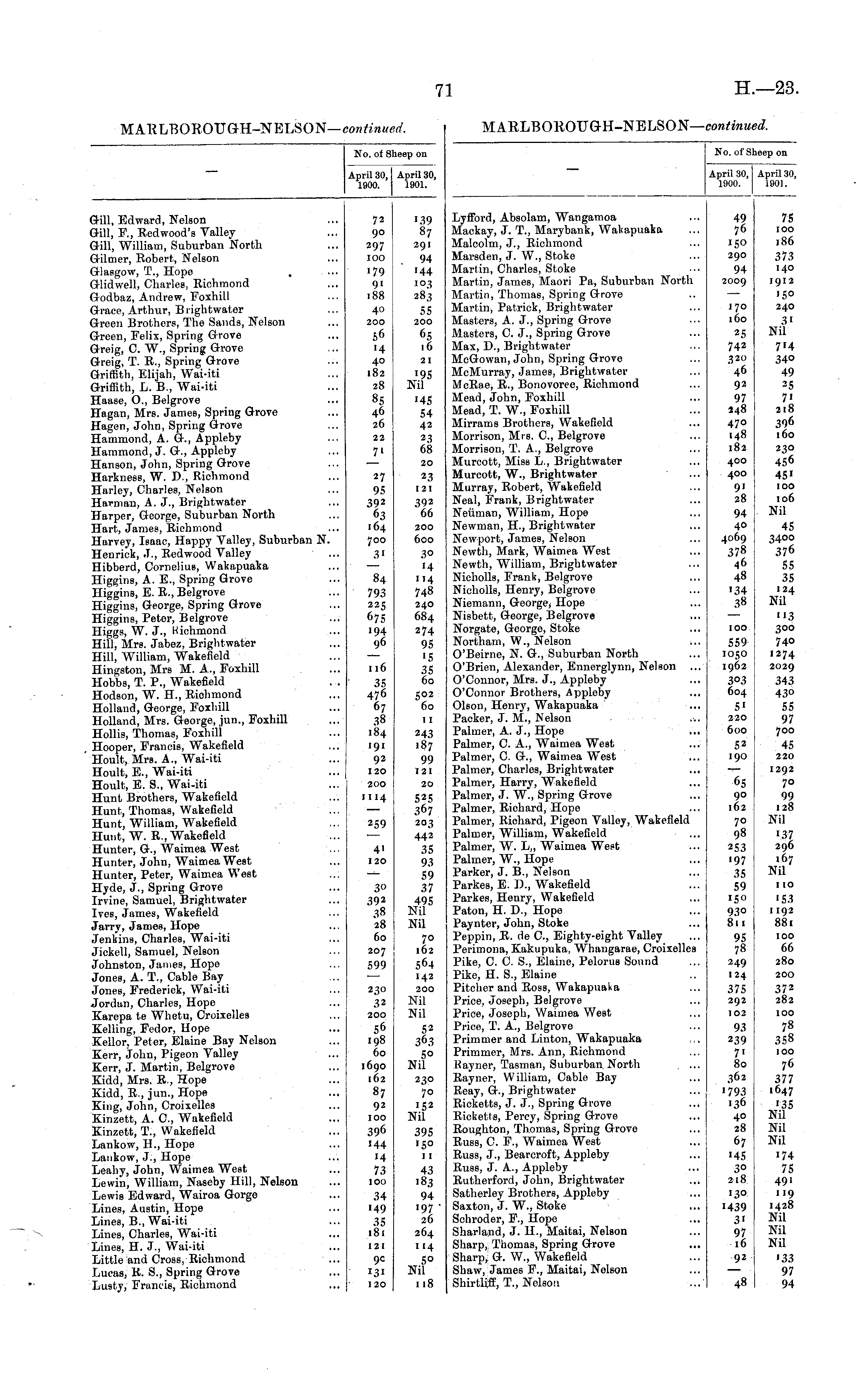 No. of Sheep on April 30, April 30, 1900. 1901. Gill, Edward, Nelson Gill, F., Redwood's Yalley Gill, William, Suburban North Gilmer, Robert, Nelson Glasgow, T., Hope , Glidwell, Charles, Richmond G-odbaz, Andrew, Foxhill Grace, Arthur, B rightwater Green Brothers, The Sands, Nelson Green, Felix, Spring Grove Greig, C. W., Spring Grove Greig, T. R., Spring Grove Griffith, Elijah, Wai-iti Griffith, L. B., Wai-iti Haase, O., Belgrove Hagan, Mrs. James, Spring Grove Hagen, John, Spring Grove Hammond, A. G., Appleby Hammond, J. &., Appleby Hanson, John, Spring Grove Harkness, W. D., Richmond Harley, Charles, Nelson Harman, A. J., Brightwater Harper, George, Suburban North Hart, James, Richmond Harvey, Isaac, Happy Valley, Suburban N. Henrick, J., Redwood Yalley Hibberd, Cornelius, Wakapuaka Higgins, A. E., Spring Grove Higgins, E. R., Belgrove Higgins, George, Spring Grove Higgins, Peter, Belgrove Higgs, W. J., Richmond Hill, Mrs. Jabez, Brightwater Hill, William, Wakefield Hingston, Mrs M. A., Foxhill Hobbs, T. P., Wakefield Hodson, W. H., Richmond Holland, George, Foxhill Holland, Mrs. George, jun., Foxhill Hollis, Thomas, Foxhill Hooper, Francis, Wakefield Hoult, Mrs. A., Wai-iti Hoult, E., Wai-iti Hoult, E. S., Wai-iti Hunt Brothers, Wakefield Hunt, Thomas, Wakefield Hunt, William, Wakefield Hunt, W. R., Wakefield Hunter, G., Waimea West Hunter, John, Waimea West Hunter, Peter, Waimea West Hyde, J., Spring Grove Irvine, Samuel, Brightwater Ivee, James, Wakefield Jarry, James, Hope Jenkins, Charles, Wai-iti Jickell, Samuel, Nelson Johnston, James, Hope Jones, A. T., Cable Bay Jones, Frederick, Wai-iti Jordan, Charles, Hope Karepa te Whetu, Croixelles Kelling, Fedor, Hope Kellor. Peter, Elaine Bay Nelson Kerr, John, Pigeon Valley Kerr, J. Martin, Belgrove Kidd, Mrs. R., Hope Kidd, R., jun., Hope King, John, Croixelles Kinzett, A. 0., Wakefield Kinzett, T., Wakefield Lankow, II., Hope Lankow, J., Hope Leahy, John, Waimea West Lewin, William, Naseby Hill, Nelson Lewis Edward, Wairoa Gorge Lines, Auetin, Hope Lines, B., Wai-iti Lines, Charles, Wai-iti Lines, H. J., Wai-iti Little and Cross, Richmond Lucas, K. S., Spring Grove Lusty, Francis, Richmond 72 go 297 100 '79 9' 188 1.39 87 291 94 '44 I°3 283 55 200 65 16 40 200 56 '4 40 182 28 85 46 26 21 '95 Nil 22 7i •45 54 42 23 68 20 23 121 392 66 27 95 392 63 164 700 31 84 793 225 675 194 I 6 116 35 476 67 38 184 191 92 120 200 200 600 3° «4 114 748 240 684 274 95 '5 35 60 502 60 11 243 "87 99 121 20 1114 525 367 203 442 35 93 59 37 495 Nil Nil 70 162 564 142 200 Nil Nil 52 363 50 Nil 259 4i 120 3° 392 38 28 60 207 599 230 32 200 56 198 60 1690 162 87 92 100 396 144 M 73 100 34 "49 35 181 230 70 "5 2 Nil 395 '5° 11 43 "83 94 '97 ' 26 264 114 5° Nil 118 121 90 J 3i 120