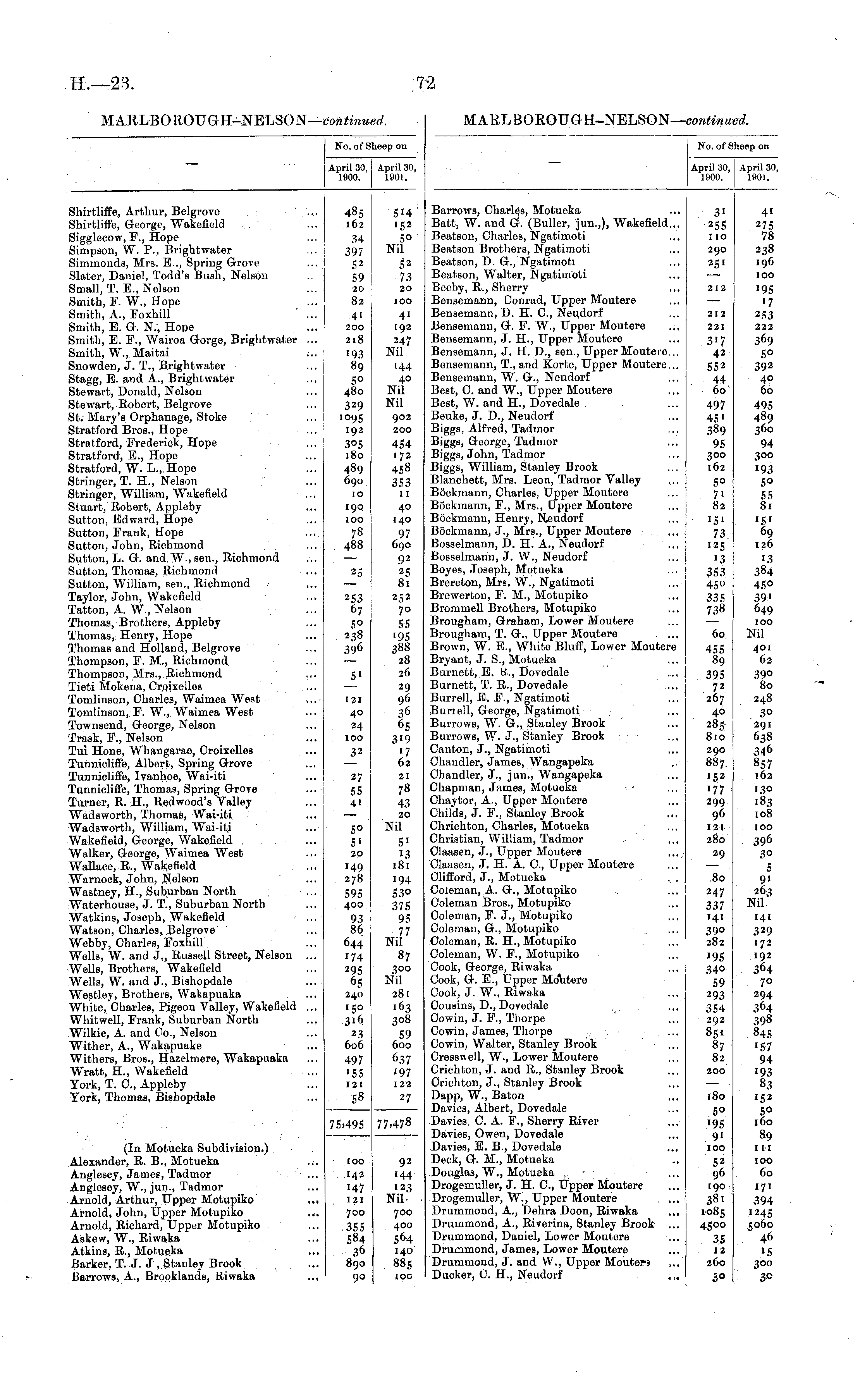 No. of Sheep on April 30, April 30, 1900. 1901. Barrows, Charles, Motueka Batt, W. and Qt. (Buller, jun.,), Wakefield... Beatson, Charles, Ngatimoti Beatson Brothers, Ngatimoti Beatson, D. Gγ., Ngatimoti Beatson, Walter, Ngatimoti Beeby, R., Sherry Bensemann, Conrad, Upper Moutere Bensemann, D. H. C, Neudorf Bensemann, G. F. W., Upper Moutere Bensemann, J. H., Upper Moutere Bensemann, J. H. I)., sen., Upper Moutere... Bensemann, T., and Korte, Upper Moutere... Bensemann, W. G\, Neudorf Best, C. and W., Upper Moutere Best, W. and H., Dovedale Beuke, J. D., Neudorf Biggs, Alfred, Tadmor Biggs, G-eorge, Tadmor Biggs, John, Tadmor Biggs, William, Stanley Brook Blancliett, Mrs. Leon, Tadmor Valley Bockmann, Charles, Upper Moutere Bockmann, F., Mrs., Upper Moutere Bockmann, Henry, Neudorf Boekmann, J., Mrs., Upper Moutere Bosselmann, D. H. A., Neudorf Bosselmann, J. W., Neudorf Boyes, Joseph, Motueka Brereton, Mrs. W., Ngatimoti Brewerton, F. M., Motupiko Brommell Brothers, Motupiko Brougham, Graham, Lower Moutere Brougham, T. G-., Upper Moutere Brown, W. E., White Bluff, Lower Moutere Bryant, J. S., Motueka Burnett, E. l<., Dovedale Burnett, T. R., Dovedale ... Burrell, iS. J?., Ngatimoti Bun ell, George, Ngatimoti Burrows, W. G-., Stanley Brook Burrows, W. J., Stanley Brook Canton, J., Ngatimoti Chandler, James, Wangapeka Chandler, J., jun., Wangapeka ■ ... Chapman, James, Motueka Chaytor, A., Upper Moutere Childs, J. F., Stanley Brook Chrichton, Charles, Motueka Christian, William, Tadmor Claasen, J., Upper Moutere Claasen, J. H. A. C, Upper Moutere Clifford, J., Motueka Coleman, A. G-., Motupiko Coleman Bros., Motupiko Coleman, F. J., Motupiko Coleman, Gr., Motupiko ... Coleman, R. H., Motupiko Coleman, W. F., Motupiko Cook, George, Riwaka Cook, G-. E., Upper Molitere Cook, J. W., Riwaka Cousins, D., Dovedale , . ... Cowin, J. F., Tliorpe Cowin, James, Thorpe Cowin, Walter, Stanley Brook < ... Cressn ell, W., Lower Moutere Crichton, J. and R., Stanley Brook Crichton, J., Stanley Brook Dapp, W., Baton Davies, Albert, Dovedale Davies. C. A. F., Sherry River Davies, Owen, Dovedale Davies, E. B., Dovedale Deck, a. M., Motueka Douglas, W., Motueka , ■ Drogemuller, J. H. C, Upper Moutere Drogemuller, W., Upper Moutere , ... Drummond, A., Dehra Doon, Riwaka Drummond, A., Riverina, Stanley Brook ... Drummond, Daniel, Lower Moutere Drummond, James, Lower Moutere Drummond, J. and W., Upper Mouterj Ducker, C. H., Neudorf ,„ 31 255 110 290 25 1 212 212 221 3'7 42 552 44 60 497 45' 389 95 300 162 5° 7i 82 •Si 73 125 13 353 45° 335 738 60 455 89 395 72 267 40 285 8io 290 887 ««• 177 299 96 121 280 4i 275 78 238 196 100 '95 17 253 222 369 5° 39 2 40 60 495 489 360 94 300 J 93 5° 55 81 '5' 6 9 126 13 384 45° 39' 649 100 Nil 401 62 39° 80 248 3° 291 638 346 857 162 130 183 108 100 396 3° 5 V Nil" 29 80 247 337 141 39° 282 '95 340 59 293 354 292 851 87 82 200 141 329 172 192 364 70 294 3 6 4 398 845 157 94 >93 83 !5 2 5° 160 89 1 [i 100 60 180 5° '95 9 l 100 52 96 190 381 1085 4500 SS 12 260 171 394 1245 5060 46 15 300 3° 3°