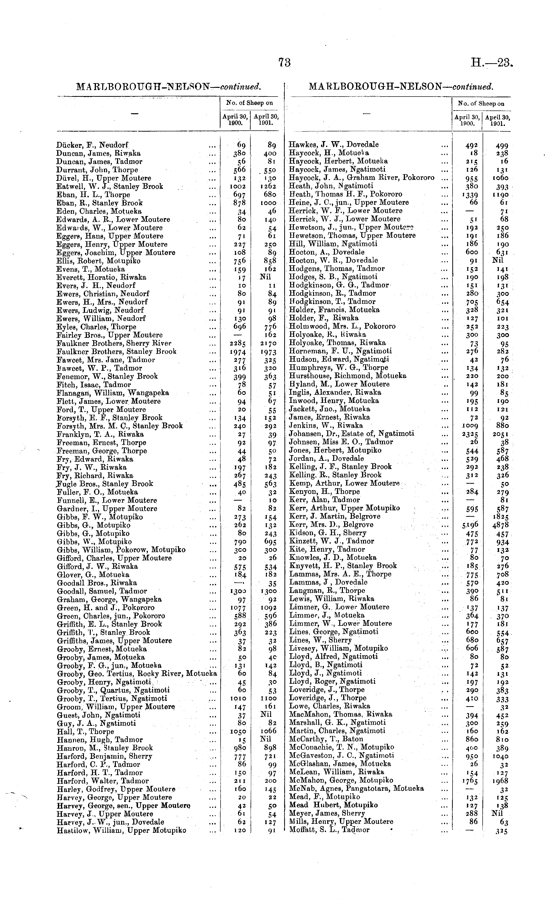 No. of Sheep on April 30, April 30, 1900. 1001. Ducfcer, F., Neudorf Duncan, James, Riwaka Duncan, James, Tadmov Durrant, John, Thorpe Diivel, H., Upper Moutere Eatwell, W. J., Stanley Brook Eban, H. L., Thorpe Eban, E., Stanley Brook Eden, Charles, Motueka Edwards, A. R., Lower Moutere Edwards, W., Lower Moutere Eggers, Hans, Upper Moutere Eggers, Henry, Upper Moutere Eggers, Joachim, Upper Moutere Ellis, Bobert, Molupiko Evens, T., Motueka Everett, Horatio, Riwaka Evers, J. H., Neudorf Ewers, Christian, Neudorf Ewers, H., Mrs., Neudorf Ewers, Ludwig, Neudorf Ewers, William, Neudorf Eyles, Charles, Thorpe Fairley Bros., Upper Moutere Faulkner Brothers, Sherry Biver Faulkner Brothers, Stanley Brook Fawcet, Mrs. Jane, Tadmor laweet, W. P., Tadmor Fenemor, W., Stanley Brook Fitch, Isaac, Tadmor Flanagan, William, Wangapeka Flett, James, Lower Moutere Ford, T., Upper Moutere lorsyth, E. F., Stanley Brook Forsyth, Mrs. M. C, Stanley Brook Franklyn, T. A., fiiwaka Freeman, Ernest, Thorpe Freeman, G-eorge, Thorpe Fry, Edward, Eiwaka Fry, J. W., Riwaka Fry, Richard, Biwaka Fugle Bros., Stanley Brook Fuller, F. O., Motueka Funnell, E., Lower Moutere G-ardner, I., Upper Moutere Q-ibbs, F. W., Motupiko Gibbs, G., Motupiko G-ibbe, G., Motupiko Gibbs, W., Motupiko Gibbs, William, Pokorow, Motupiko Gifford, Charles, Upper Moutere Gifford, J. W., Eiwaka Glover, G., Motueta Goodall Bros., Eiwaka Goodall, Samuel, Tadoior Graham, George, Wangapeka Green, H. and J., Pokororo Green, Charles, jun., Pokororo Griffith, E. L., Stanley Brook Griffith, T., Stanley Brook Griffiths, James, Upper Moutere Grooby, Ernest, Motueka Grooby, James, Motueka Grooby, F. G., jun., Motuela Grooby, G-eo. Tertius, Rocky Eiver, Motueka Grooby, Henry, Ngatimoti ' ... Grooby, T., Quartus, Ngatimoti Grooby, T., Tertius, Ngatimoti - ... Groom, William, Upper Moutere Guest, John, Ngatimoti Guy, J. A., Ngatimoti Hall, T., Thorpe Hannen, Hugh, Tadmor Hariron, M., Stanley Brook Harford, Benjamin, Sherry Harford, C. P., Tadmor Harford, H. T., Tadmor Harford, Walter, Tadmor Harley, Godfrey, Upper Moutere Harvey, George, Upper Moutere Harvey, George, sen., Upper Moutere Harvey, J, Upper Moutere Harvey, J. W., jun., Dovedale Hastilow, William, Upper Motupiko 6 9 380 56 566 132 1OO2 697 878 34 80 62 7' 227 108 756 •59 '7 10 80 9' 9' 130 696 2285 1974 277 316 399 78 60 94 20 240 27 92 44 48 '97 267 485 40 82 273 262 80 790 3C0 20 89 400 81 .550 130 1262 680 IOOO 46 140 54 61 250 89 858 162 Nil 11 84 89 9' 98 776 162 2170 '973 325 320 3(>3 57 5i 67 55 152 292 39 97 5° 72 182 243 S63 32 10 82 154 132 243 695 300 26 575 184 534 182 35 1300 92 1092 59 6 386 223 32 98 4C 142 84 3° 53 1100 161 Nil 82 1066 Nil 898 721 99 97 200 1300 97 1077 588 292 363 37 82 5° 13' 60 45 60 IOIO 147 37 80 1050 "5 980 777 86 ■5° 211 160 20 42 6r 62 12O "45 22 5° 54 127 91