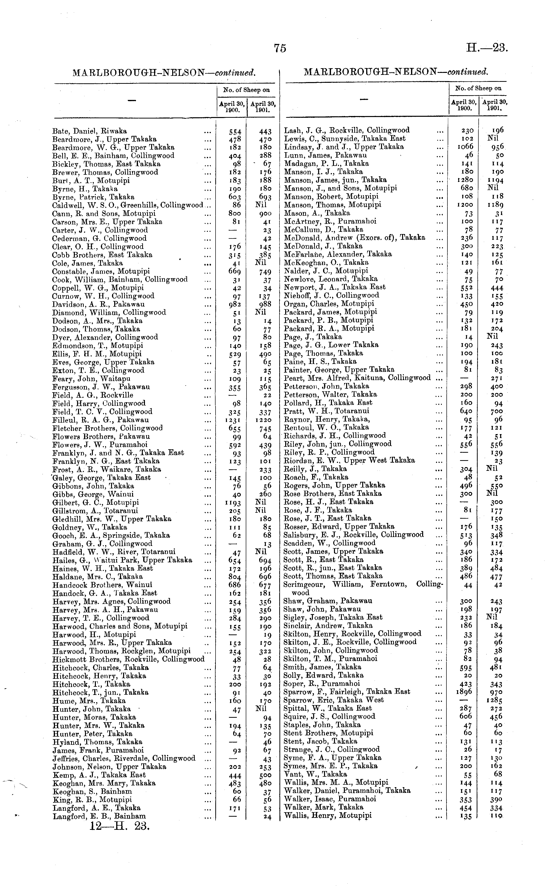 No. of Sheep on April 30, April 3 1900. 1901. April 30, 1901. Bate, Daniel, Eiwaka Beardmore, J., Upper Takaka Beardmore, W. Gk, Upper Takaka Bell, E. E., Bainham, Oollingwood Bickley, Thomas, Bast Takaka Brewer, Thomas, Collingwood Burl, A. T., Motupipi Byrne, H., Takaka Bvrne, Patrick, Takaka Caldwell, W. S. O., G-reenhills, Collingwood... Cann, B. and Sons, Motupipi Carson, Mrs. E., Upper Takaka Carter, J. W., Collingwood Cederman, G. Collingwood Clear, O. H., Collingwood Cobb Brothers, East Takaka Cole, James, Takaka Constable, James, Motupipi Cook, William, Bainliam, Collingwood Coppell, W. G., Motupipi Curnow, W. H., Collingwood Davidson, A. B., Pakawau Diamond, William, ColHngwood Dodson, A., Mrs., Takaka Dodson, Thomas, Takaka Dyer, Alexander, Collingwood Edmondson, T., Motupipi Ellis, F. H. M., Motupipi Eves, G-eorge, Upper Takaka Exton, T. E., Collingwood Feary, John, Waitapu Fergusson, J. W., Pakawau Field, A. <>., Eockville Field, Harry, Oollingwood Field, T. C. V., Collingwood Filleul, B. A. G., Pakawau Fletcher Brothers, Collingwood Flowers Brothers, Pakawau Flowers, J. W., Puramahoi Franklyn, J. and N. G-., Takaka East Franklyn, N. &., East Takaka Frost, A. E., Waikare, Takaka Galey, George, Takaka East Gibbons, John, Takaka Gibbs, George, Wainui G-ilbert, G. C, Motupipi Gillstrom, A., Totaranui GHedhill, Mrs. W., Upper Takaka Goldney, W., Takaka Gooch, E. A., Springside, Takaka Graham, G. J., Collingwood Hadfield, W. W., Eiver, Totaranui Hailes, G., VVaitui Park, Upper Takaka Haines, W. H., Takaka East Haldane, Mrs. C, Takaka Handcock Brothers, Wainui Handock, G. A., iakaka East Harvey, Mrs. Agnes, Collingwood Harvey, Mrs. A. H., Pakawau Harvey, T. B., Collingwood Harwood, Charles and Sons, Motupipi Harwood, H., Motupipi Harwood, Mrs. E., Upper Takaka Harwood, Thomas, Eoekglen, Motupipi Hickmott Brothers, Eoekville, Collingwood Hitchcock, Charles, Takaka Hitchcock, Henry, Takaka Hitchcock, T., Takaka Hitchcock, T., Jan., Takaka Hume, Mrs., Takaka Hunter, John, Takaka ■ Hunter, Moras, Takaka Hunter, Mrs. W., Takaka Hunter, Peter, Takaka Hyland, Thomas, Takaka James, Frank, Puramahoi Jeffries, Charles, BAverdale, Collingwood Johnson, Nelson, Upper Takaka Kemp, A. J., Takaka Bast Keoghan, Mrs. Mary, Takaka Keoghan, S., Bainham King, R. B., Motupipi Langford, A. E., Takaka Langford, B. B., Bainham 5S4 478 182 404 98 182 ■83 190 603 86 800 81 176 3'5 41 669 3" 42 97 982 Si '3 60 97 140 S29 S7 23 109 355 98 325 1231 655 99 592 93 123 I4 I 76 40 "93 205 180 443 47° i8o 288 ■ 67 176 188 180 693 Nil 900 4' 23 42 145 385 Nil 749 37 34 137 988 Nil H 77 80 158 490 65 22 140 337 1220 745 64 439 98 101 233 100 56 260 Nil Nil 180 85 68 13 Nil 694 196 696 677 181 356 356 290 190 ■9 170 322 28 64 3° 192 40 170 Nil 94 '35 70 46 67 43 253 500 480 37 56 53 24 111 62 47 6 54 172 804 686 162 254 '59 284 '55 ■S3 254 48 77 33 200 9i 160 47 194 64 92 202 444 483 60 66 171