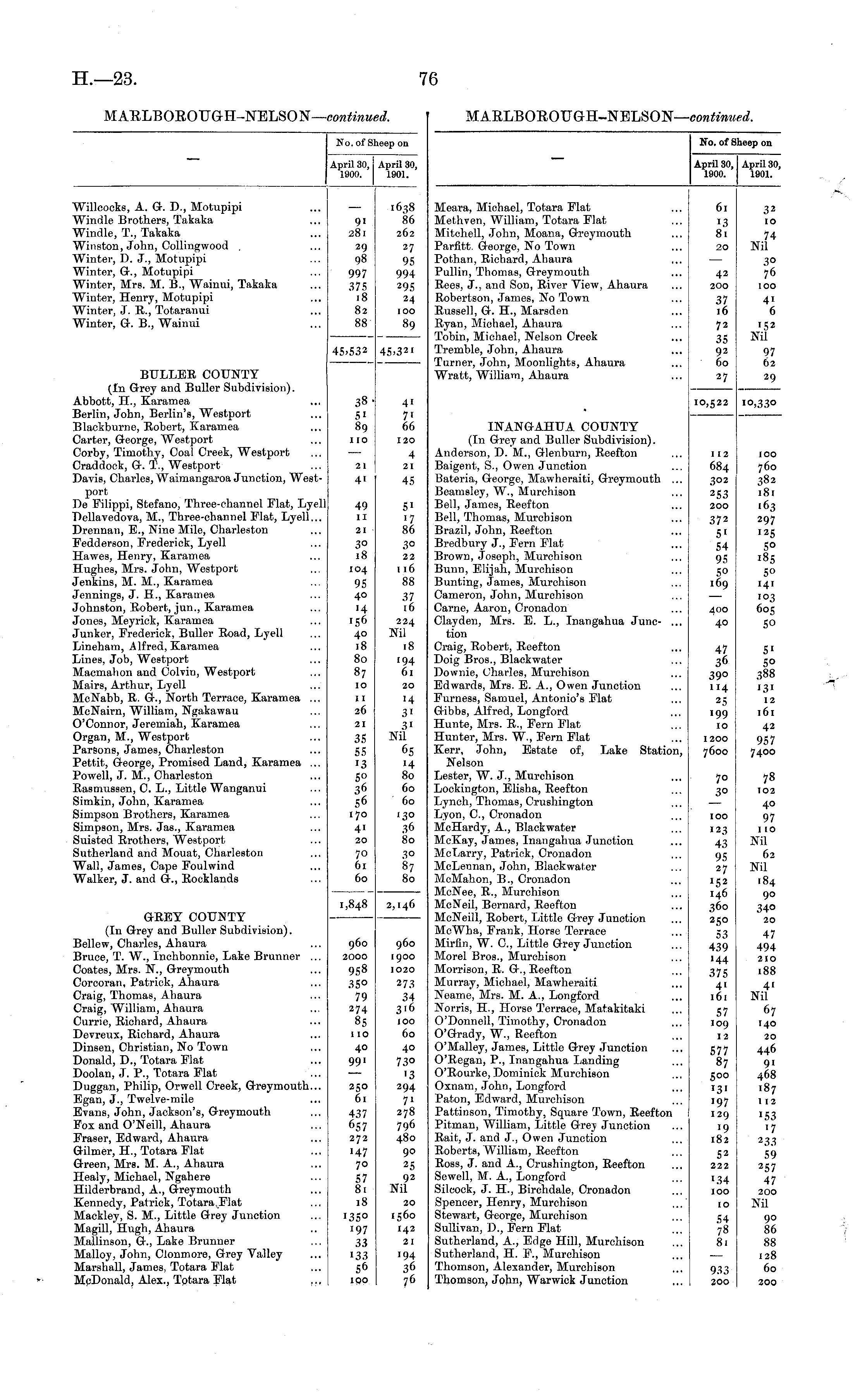 No. of Sheep on April 30, April 30, 1900. 1901. Meara, Michael, Totara Flat Methven, William, Totara Flat Mitchell, John, Moana, Greymouth Parfitt. George, No Town Pothan, Richard, Ahaura Pullin, Thomas, Greymouth Rees, J., and Son, River View, Ahaura Robertson, James, No Town Russell, G. H., Marsden Ryan, Michael, Ahaura Tobin, Michael, Nelson Creek Tremble, John, Ahaura Turner, John, Moonlights, Ahaura Wratt, William, Ahaura 61 13 81 20 42 200 37 16 72 35 92 60 32 10 74 Nil 3° 76 100 4 1 6 '52 Nil 97 62 27 29 10,522 10,33° INANGAHUA COUNTY (In Grey and Buller Subdivision). Anderson, D. M., Glenburn, Reefton Baigent, S., Owen Junction Bateria, George, Mawheraiti, Greymouth ... Beamsley, W., Murchison Bell, James, Reefton Bell, Thomas, Murcbison Brazil, John, Reefton Bredbury J., Pern Mat Brown, Joseph, Murchison Bunn, Elijah, Murchison Bunting, James, Murchison Cameron, John, Murchison Carne, Aaron, Cronadon Clayden, Mrs. B. L., Inangahua June- ... tion Craig, Robert, Reefton Doig Bros., Blackwater Downie, Uharles, Murchison Edwards, Mrs. E. A., Owen Junction Enrness, Samuel, Antonio's Plat Gibbs, Alfred, Longford Hunte, Mrs. R., Pern Elat Hunter, Mrs. W., Pern Elat Kerr, John, Estate of, Lake Station, Nelson Lester, W. J., Murchison Lockington, Elisha, Reefton Lynch, Thomas, Cruehington Lyon, C, Cronadon McHardy, A., Blackwater McKay, James, Inangahua Junction Me Larry, Patrick, Croiiadon McLennan, John, Blackwater McMahon, B., Cronadon McNee, R., Murchison McNeil, Bernard, Reefton McNeill, Robert, Little Grey Junction McWha, Frank, Horse Terrace Mirfin, W. 0., Little Grey Junction Morel Bros., Murchison Morrison, R. G., Reefton Murray, Michael, Mawheraiti Neame, Mrs. M. A., Longford Norris, H., Horse Terrace, Matakitaki O'Donnell, Timothy, Cronadon O'Grady, W., Reefton O'Malley, James, Little Grey Junction O'Regan, P., Inangahua Landing O'Rourke, Dominick Murchison Oxnam, John, Longford Paton, Edward, Murchison Pattinson, Timothy, Square Town, Reefton Pitman, William, Little Grey Junction Rait, J. and J., Owen Junction Roberts, William, Reefton Ross, J. and A., Crushington, Reefton Sewell, M. A., Longford Silcock, J. H., Birchdale, Cronadon Spencer, Henry, Murchison Stewart, George, Murchison Sullivan, D., Fern Flat Sutherland, A., Edge Hill, Murchison Sutherland, H. P., Murchison Thomson, Alexander, Murchison Thomson, John, Warwick Junction I [2 684 3O2 2S3 2OO 37 2 5' 54 95 50 169 400 40 47 36 39° 114 25 199 10 1200 7600 70 3° 100 123 43 95 27 !52 I46 360 2 S O 53 439 144 375 4 1 161 57 109 12 577 87 500 !3i 197 129 19 182 52 222 100 760 382 181 163 297 125 5° 185 5° 141 i°3 605 5° 5 1 5° 388 131 12 161 42 957 7400 78 102 40 97 110 Nil 62 Nil 184 90 34° 20 47 494 210 188 4' Nil 67 140 20 446 9 1 468 .87 112 '53 17 233 59 257 47 200 Nil ■34 100 10 54 78 81 90 86 88 128 60 933 200 200