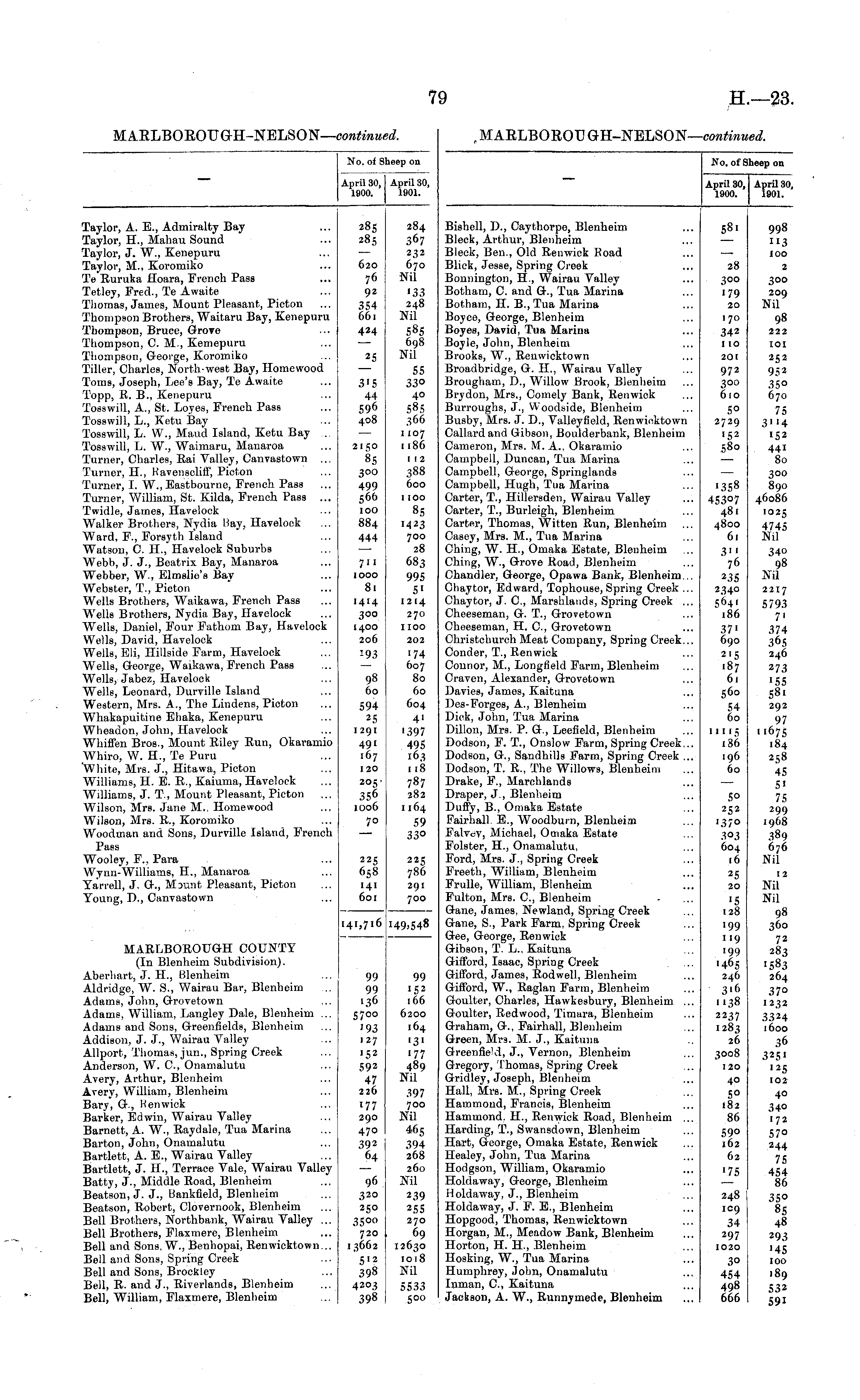 No. of Sheep on April SO, April 30, 1900. 1901. Bishell, D., Caythorpe, Blenheim Bleck, Arthur, Blenheim Bleok, Ben., Old Renwick Road Bliek, Jesse, Spring Creek Bonnington, H., Wairau Valley Botham, C. and G., Tua Marina Botham, H. B.,Tua Marina Boyce, George, Blenheim Boyes, David, Tua Marina Boyle, John, Blenheim Brooks, W., Renwicktown Broadbridge, G. H., Wairau Valley Brougham, D., Willow Brook, Blenheim Brydon, Mrs., Comely Bank, Renwiek Burroughs, J., Woodside, Blenheim Busby, Mrs. J. D., Valleyfield, Renwicktown Callardand Gibson, Boulderbank, Blenheim Cameron, Mrs. M.A.., Okaramio Campbell, Duncan, Tua Marina Campbell, George, Springlands Campbell, Hugh, Tua Marina Carter, T., Hillersden, Wairau Valley Carter, T., Burleigh, Blenheim Carter, Thomas, Witten Run, Blenheim Casey, Mrs. M., Tua Marina Ching, W. H., Omaka Kstate, Blenheim ... Ching, W., Grove Road, Blenheim Chandler, George, Opawa Bank, Blenheim .. Chaytor, Edward, Tophouse, Spring Creek ... Chaytor, J. C, Marshlands, Spring Creek ... Cheeseman, G. T., Grovetown Cheeseman, H. C., Grovetown Christeburch Meat Company, Spring Creek... Conder, T., Renwick Connor, M., Longfield Farm, Blenheim Craven, Alexander, Grovetown Davies, James, Kaituna Des-Forges, A., Blenheim Dick, John, Tua Marina Dillon, Mrs. P. &., Leefield, Blenheim Dodson, F. T., Onslow Farm, Spring Creek... Dodeon, G., Sandhille Farm, Spring Creek ... Dodson, T. R., The Willows, Blenheim Drake, F., Marehlands Draper, J., Blenlieim Duffy, B., Omaka Estate Fairhall E., Woodburn, Blenheim Falvcv, Michael, Omaka Estate Folster, H., Onamalutu, Ford, Mrs. J., Spring Creek Freeth, William, Blenheim Frulle, William, Blenheim Fulton, Mrs. C, Blenheim Gane, James, Newland, Spring Creek Gane, S., Park Farm, Spring Creek Gee, George, Renwiek Gibson, T. L., Kaituna Gifford, Isaac, Spring Creek Gifford, James, Rodwell, Blenheim Gifford, W., Raglan Farm, Blenheim Goulter, Charles, Hawkesbury, Blenheim ... Goulter, Redwood, Timara, Blenheim Graham, G., Fairhall, Blenheim Green, Mrs. M. J., Kaituna Greenfield, J., Vernon, Blenheim Gregory, Thomas, Spring Creek Gridley, Joseph, Blenheim Hall, Mrs. M., Spring Creek Hammond, Francis, Blenheim Hammond. H., Renwiek Road, Blenheim ... Harding, T., Swansdown, Blenheim Hart, George, Omaka Estate, Renwiek Healey, John, Tua Marina Hodgson, William, Okaramio Holdaway, George, Blenheim Holdaway, J., Blenheim Holdaway, J. F. E., Blenheim Hopgood, Thomas, Renwicktown Horgan, M., Meadow Bank, Blenheim Horton, H. H., Blenheim Hosking, W., Tua Marina Humphrey, John, Onamalutu Inman, C, Kaituna Jackson, A. W., Runnymede, Blenheim 5§. 998 "3 100 2 28 3°° 179 2O 1 7 O 342 110 201 300 209 Nil 98 222 101 972 300 6l0 5° 2729 580 252 952 35° 670 75 3"4 152 441 80 >3S8 4S3°7 481 4800 61 300 890 46086 1025 4745 Nil 3" 76 235 2340 564' 186 690 2'5 .87 61 560 54 60 340 98 Nil 2217 5793 7' 374 365 246 273 '55 S8i 292 97 11675 184 258 45 51 75 299 1968 389 676 Nil 11115 186 196 60 5° 252 1370 3°3 604 16 25 20 15 128 199 i>9 199 '463 246 3,6 1138 2237 1283 26 3008 12 Nil Nil 98 360 72 283 '583 264 37° 1232 3324 1600 36 3251 ■25 102 120 40 5° 182 86 59° 162 62 '75 40 34° 172 57° 244 75 454 86 35° 85 48 293 '45 100 189 532 S9« 248 ic 9 34 297 1020 3° 454 498 666
