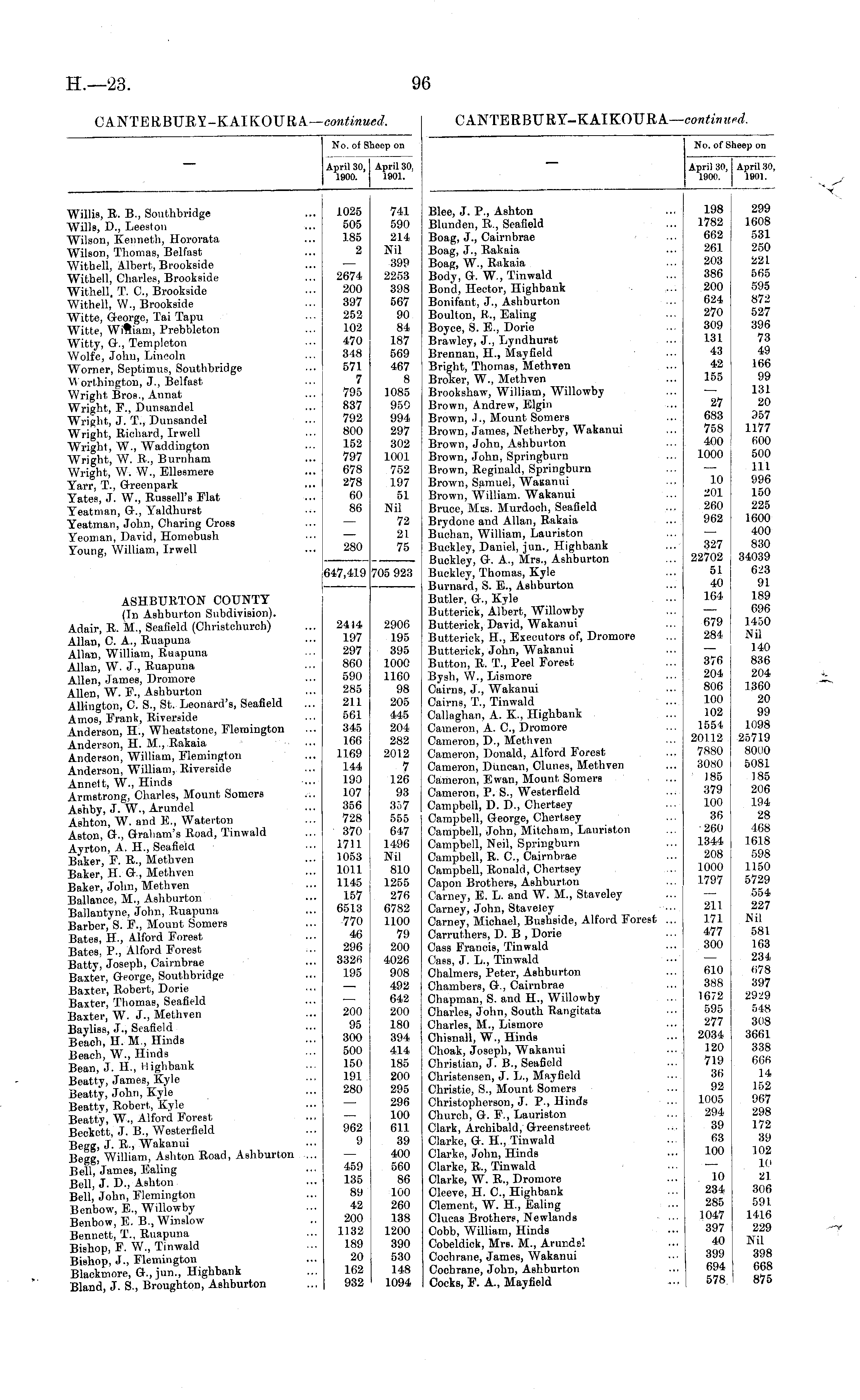 No. of Sheep on April 30, April 30, 1900. 1901. Blee, J. P., Ash ton Blunden, R., Seafield Boag, J., Cairnbrae Boag, J., Rakaia Boag, W., Rakaia Body, a. W., Tinwald Bond, Hector, Highbank Bonifant, J., Ashburton Boulton, R., Ealing Boyce, 8. E., Dorie Brawley, J., Lyndhurst Brennan, H., Mayfield Bright, Thomas, Methven Broker, W., MethTen Brookshaw, William, Willowby Brown, Andrew, Elgin Brown, .I., Mount Somers Brown, James, Netherby, Wakanui Brown, John, Aehburton Brown, John, Springburn Brown, Reginald, Springburn Brown, Samuel, WaKanui Brown, "William. Wakanui Bruce, Mcs. Murdoch, Seafield Brydone and Allan, Rakaia Buchan, William, Lauriston Buckley, Daniel, jun., Highbank Buckley, G-. A., Mrs., Ashburton Buckley, Thomas, Kyle Burnard, S. E., Ashburton Butler, G-., Kyle Butterick, Albert, Willowby Butterick, David, Wakanui Butterick, H., Executors of, Dromore Butterick, John, Wakanui Button, R. T., Peel Forest Bysh, W., Lismore Cairns, J., Wakanui Cairns, T., Tinwald Callaghan, A. K., Highbank Cameron, A. C, Dromore Cameron, D., Methven Cameron, Donald, Alford Forest Cameron, Duncan, Clunes, Methven Cameron, Ewan, Mount Sotnere Cameron, P. S., Weeterfield Campbell, D. D., Chertsey Campbell, George, Chertsey Campbell, John, Mitcham, Laurieton Campbell, Neil, Springburn Campbell, R. C, Cairnbrae Campbell, Ronald, Chertsey Capon Brothers, Ashburton Carney, E. L. and W. M., Staveley Carney, John, Staveley Carney, Michael, Bushside, Alford Forest ... Carruthers, D. B , Dorie Cass Francis, Tinwald Cass, J. L., Tinwald Chalmers, Peter, Ashburton Chambers, Gt., Cairnbrae Chapman, S. and H., Willowby Charles, John, South Rangitata Charles, M., Lismore Chisnall, W., Hinds Choak, Joseph, Wakanui Christian, J. B., Seafield Christensen, J. L., Mayfield Christie, S., Mount Somers Christopherson, J. P., Hinds Church, G-. F., Lauriston Clark, Archibald, Greenstreet Clarke, Or. H., Tinwald Clarke, John, Hinds Clarke, R., Tinwald Clarke, W. R., Dromore Cleeve, H. 0., Highbank Clement, W. H., Ealing Clucas Brothers, Newlands Oobb, William, Hinds Cobeldick, Mrs. M., Aruncb! Cochrane, James, Wakanui Cochrane, John, Ashburton Cocks, F. A., Mayfield 198 1782 662 261 203 386 200 624 270 309 131 43 42 155 299 1608 531 250 221 565 595 872 527 396 73 49 166 99 131 20 957 1177 600 500 111 996 150 225 1600 400 830 34039 623 91 189 696 1450 Nil 140 836 204 1360 20 99 1098 25719 80U0 5081 185 206 194 28 468 1618 598 1150 5729 554. 227 Nil 581 163 234 678 397 2929 548 308 3661 338 666 14 152 967 298 172 39 102 10 21 306 591 1416 229 Nil 398 668 875 27 683 758 400 1000 10 201 260 962 327 22702 51 40 164 679 284 376 204 806 100 102 1554. 20112 7880 3080 185 379 100 36 •260 1344 208 1000 1797 211 171 477 300 610 388 1672 595 277 2034 120 719 36 92 1005 294 39 63 100 10 234 285 1047 397 40 399 694 578