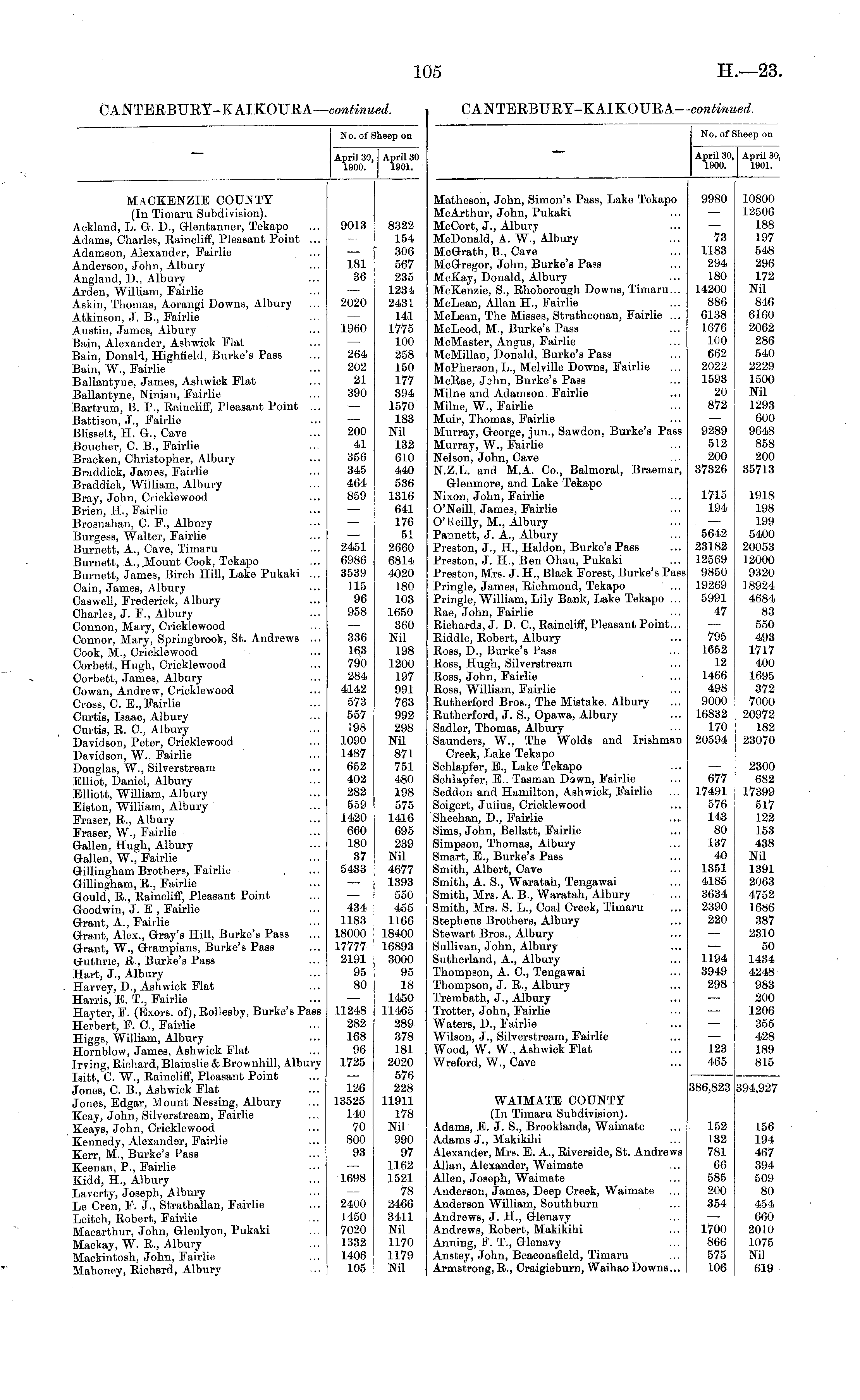 No. of Sheep on April 30, April 3 1900. 1901. April 30 1901. MACKENZIE COUNTY (In Timaru Subdivision). Ackland, L. G. D., Glentanner, Tekapo Adams, Charles, Raincliff, Pleasant Point ... Adamson, Alexander, Eairlie Anderson, John, Albury Angland, D., Albury Arden, William, Pairlie Asian, Thomas, Aorangi Downs, Albury Atkinson, J. B., Eairlie Austin, James, Albury Bain, Alexander, Ashwick Elat Bain, Donali, Highfield, Burke's Pass Bain, W., Fairlie Ballantyne, James, Asliwiok Elat Ballantyne, Niniau, Eairlie Bartrum, B. P., Raincliff, Pleasant Point ... Battison, J., Eairlie Blissett, H. a., Cave Boucher, C. B., Eairlie Bracken, Christopher, Albury Braddick, James, Fairlie Braddick, William, Albury Bray, John, Cricklewood Brien, H., Eairlie Brosnahan, C. F., Albnry Burgess, Walter, Fairlie Burnett, A., Cave, Timaru Burnett, A., Mount Cook, Tekapo Burnett, James, Birch Hill, Lake Pukaki ... Cain, James, Albury Caswell, Erederiek, Albury Charles, J. F., Albury Connon, Mary, Cricklewood Connor, Mary, Springbrook, St. Andrews ... Cook, M., Cricklewood Corbett, Hugh, Cricklewood Corbett, James, Albury Cowan, Andrew, Cricklewood Cross, C. E., Eairlie Curtis, Isaac, Albury Curtis, R. 0., Albury Davidson, Peter, Cricklewood Davidson, W., Eairlie Douglas, W., Silverstream Elliot, Daniel, Albury Elliott, William, Albury Eleton, William, Albury Eraser, R., Albury Eraser, W., Fairlie Gallen, Hugh, Albury Gallen, W., Eairlie G-illingham Brothers, Fairlie , Gillingharn, R., Fairlie Gould, R., Raincliff, Pleasant Point Goodwin, J. E , Fairlie Grant, A., Fairlie Grant, Alex., Gray's Hill, Burke's Pass Grant, W., Grampians, Burke's Pass W-uthrie, &., Burke's Pass Hart, J., Albury Harvey, D., Ashwick Flat Harris, E. T., Fairlie Hayter, F. (Exors. of),Rollesby, Burke's Pass Herbert, E. C, Fairlie Higgs, William, Albury Hornblow, James, Ashwick Elat Irving, Richard, Blainslie & Brownhill, Albury Isitt, C. W., Raineliff, Pleasant Point Jones, C. B., Ashwick Flat Jones, Edgar, Mount Nessing, Albury Keay, John, Silverstream, Fairlie Keays, John, Cricklewood Kennedy, Alexander, Eairlie Kerr, M., Burke's Pass Keen an, P., Eairlie Kidd, H., Albury Laverty, Joseph, Albury Le Cren, E. J., Strathallan, Eairlie Leitch, Robert, Fairlie Macarthur, John, Glenlyon, Pukaki Mackay, W. R., Albury Mackintosh, John, Fairlie Mahoney, Richard, Albury 9013 181 36 2020 1960 264 202 21 390 200 41 356 345 464 859 2451 6986 3539 115 96 958 336 163 790 284 4142 573 557 198 1090 1487 652 402 282 559 1420 660 180 37 5433 8322 154 306 567 235 1234 2431 141 1775 100 258 150 177 394 1570 183 Ml 132 610 440 536 1316 641 176 51 2660 6814 4020 180 103 1650 360 Nil 198 1200 197 991 763 992 298 Nil 871 751 480 198 575 1416 695 239 Nil 4677 1393 550 455 1166 18400 16893 3000 95 18 1450 11465 289 378 181 2020 576 228 11911 178 Ml 990 97 1162 1521 78 2466 3411 Nil 1170 1179 Nil 434 1183 18000 17777 2191 95 80 11248 282 168 96 1725 126 13525 140 70 800 93 1698 2400 1450 7020 1332 1406 105