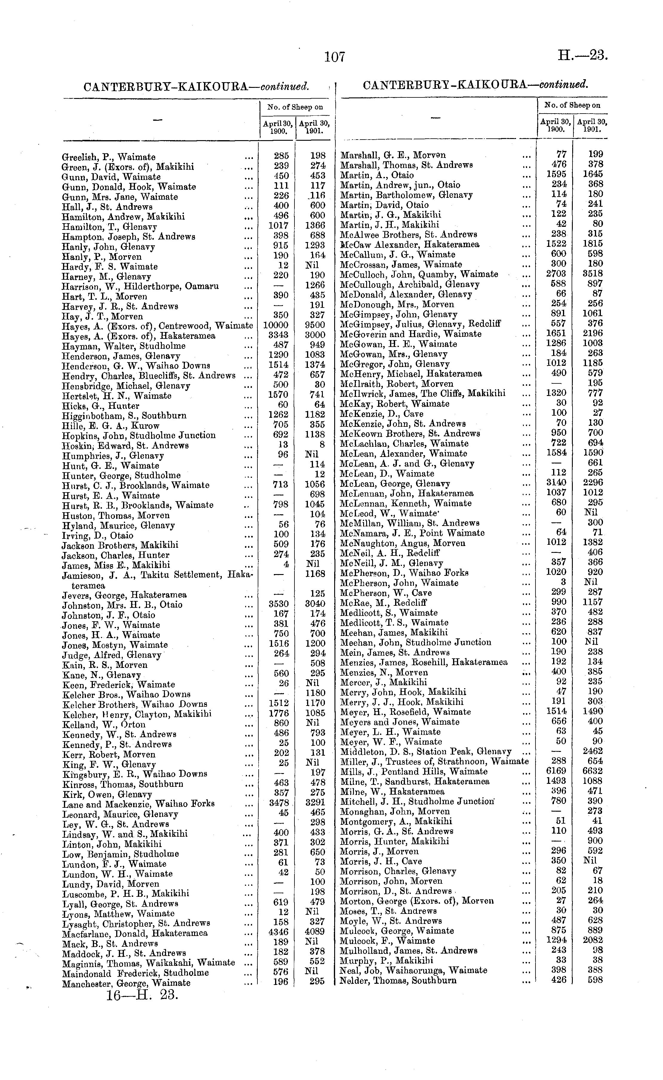 No. of Sheep on April 30, April 30, 1900. 1901. Marshall, G. E., Morvan Marshall, Thomas, St. Andrews Martin, A., Otaio Martin, Andrew, jun., Otaio Martin, Bartholomew, Glenavy Martin, David, Otaio Martin, J. G., Makikihi Martin, J. H., Makikihi McAlwee Brothers, St. Andrews MeCaw Alexander, Hakateramea McCallum, J. G., Waimate McCrossan, James, Waimate McCulloch, John, Quamby, Waimate McCullough, Archibald, Glenavy McDonald, Alexander, Glenavy McDonough, Mrs., Morven McGimpsey, John, Glenavy McGimpsey, Julius, Glenavy, Kedcliff McGoverin and Hardie, Waimate McGowan, H. E., Waimate McGowan, Mrs., G-lenavy McGregor, John, Glenavy McHenry, Michael, Hakateramea Mcllraith, Robert, Morven Mcllwrick, James, The Cliffs, Makikihi McKay, Robert, Waimate McKenzie, D., Cave McKenzie, John, St. Andrews McKeown Brothers, St. Andrews McLachlan, Charles, Waimate McLean, Alexander, Waimate MoLean, A. J. and G., Glenavy McLean, D., Waimate McLean, George, Glenavy McLennan, John, Hakateramea McLennan, Kenneth, Waimate McLeod, W., Waimate' McMillan, William, St. Andrews McNamara, J. B., Point Waimate McNaughton, Angus, Morven McNeil, A. H., Redcliff McNeill, J. M., Glenavy McPherson, D., Waihao Forks McPherson, John, Waimate McPherson, W., Cave McRae, M., Redcliff Medlicott, S., Waimate Medlicott, T. S., Waimate Meehan, James, Makikihi Median, John, Studholme Junction Mein, James, St. Andrews Menzies, James, Kosehill, Hakateramea Menzies, N., Morven Mercer, J., Makikihi Merry, John, Hook, Makikihi Merry, J. J., Hook, Makikihi Meyer, H., Rosefield, Waimate Meyers and Jones, Waimate Meyer, L. H., Waimate Meyer, W. If., Waimate Middleton, D. S., Station Peak, Glenavy ... Miller, J., Trustees of, Strathnoon, Waimate Mills, J., Pentland Hills, Waimate Milne, T., Sandhurst, Hakateramea Milne, W., Hakateramea Mitchell, J. H., Studholme Junction Monaghan, John, Morven Montgomery, A., Makikihi Morris, G. A., St\ Andrews Morris, Hunter, Makikihi Morris, J., Morven Morris, J. H., Cave Morrison, Charles, Glenavy Morrison, John, Morven Morrison, D., St. Andrews Morton, George (Exors. of), Morven Moses, T., St. Andrews Moyle, W., St. Andrews Mulcock, George, Waimate Mulcock, P., Waimate Mulholland, James. St. Andrews Murphy, P., Makikihi Neal, Job, Waihaorunga, Waimate Nelder, Thomas, Southburn 77 199 476 378 1595 1645 234 368 114 180 74 241 122 235 42 80 238 315 1522 1815 600 598 300 180 2703 3518 588 897 66 87 254 256 891 1061 557 376 1651 2196 1286 1003 184 263 1012 1185 490 579 — 195 1320 777 30 92 100 27 70 130 950 700 722 694 1584 1590 — 661 112 265 3140 2296 1037 1012 680 295 60 Nil — 300 64 71 1012 1382 — 406 357 366 1020 920 3 Nil 299 287 990 1157 370 482 236 288 620 837 100 Nil 190 238 192 134 400 385 92 235 47 190 191 303 1514 1490 656 400 63 45 50 90 — 2462 288 654 6169 6632 1493 1088 396 471 780 390 — 273 51 41 110 493 900 296 592 350 Nil 82 67 62 18 205 210 27 264 30 30 487 628 875 889 1294 2082 243 98 33 38 398 388 426 598 77 476 1595 234 114 74 122 42 238 1522 600 300 2703 588 66 254 891 557 1651 1286 184 1012 490 1320 30 100 70 950 722 1584 112 3140 1037 680 60 64 1012 357 1020 3 299 990 370 236 620 100 190 192 400 92 47 191 1514 656 63 50 288 6169 1493 396 780 51 110 296 350 82 62 205 27 30 487 875 1294 243 33 398 426