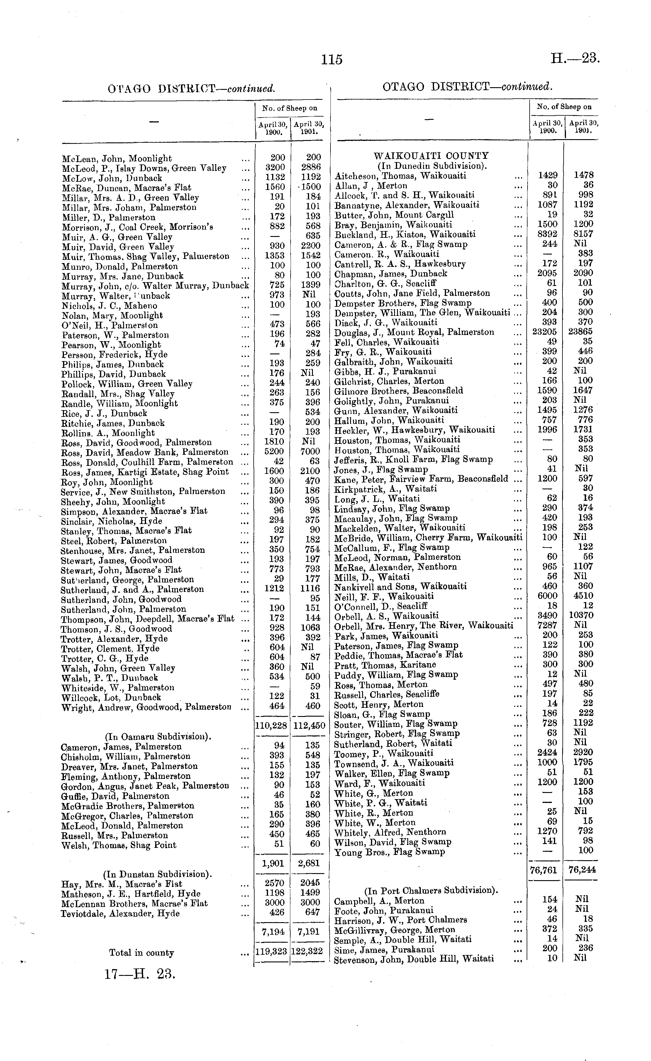 No. of Sheep on April 30, April 30, 1900. 1901. McLean, John, Moonlight McLeod, P., Islay Downs, Green Valley McLow, John, Dunback McRae, Duncan, Macrae's Flat Millar, Mrs. A. D., Green Valley Millar, Mrs. Joham, Palmerston Miller, D., Palmerston Morrieon, J., Coal Creek, Morrison'e Muir, A. G., Green Valley Muir, David, Green Valley Muir, Thomas. Shag Valley, Palmerston Munro, Donald, Palmerston Murray, Mrs. Jane, Dunback Murray, John, c/o. Walter Murray, Dunback Murray, Walter, I'unback Nichols, J. C, Maheno Nolan, Mary, Moonlight O'Neil, H., Palmerston Paterson, W., Palmerston Pearson, W., Moonlight Persson, Frederick, Hyde Philips, James, Dunback Phillips, David, Dunback Pollock, William, Green Valley Bandall, Mrs., Shag Valley Randle, William, Moonlight Rice, J. J., Dunback Ritchie, James, Dunback Rolline, A., Moonlight Ross, David, Goodwood, Palmerston Ross, David, Meadow Bank, Palmerston Ross, Donald, Coulhill Farm, Palmereton ... Ross, James, Kartigi Estate, Shag Point Roy, John, Moonlight Service, J., New Smithston, Palmerston Sheehy, John, Moonlight Simpson, Alexander, Macrae's Flat Sinclair, Nicholas, Hyde Stanley, Thomas, Macrae's Flat Steel, Robert, Palmerston Stenhouse, Mrs. Janet, Palmerston Stewart, James, Goodwood Stewart, John, Macrae's Flat Sutherland, George, Palmerston Sutherland, J. and A., Palmerston Sutherland, John, Goodwood Sutherland, John, Palmerston Thompson, John, Deepdell, Macrae's Flat ... Thomson, J. S., Goodwood Trotter, Alexander, Hyde Trotter, Clement, Hyde Trotter, C. G., Hyde Walsh, John, Green Valley Walsh, P. T., Dunback Whiteside, W., Palmerston Willcock, Lot, Dunback Wright, Andrew, Goodwood, Palmerston ... 200 3200 1132 1560 191 20 172 882 930 1353 100 80 725 973 100 473 196 74 193 176 244 263 375 190 170 1810 5200 42 1600 300 150 390 96 294 92 197 350 193 773 29 1212 200 2886 1192 -1500 184 101 193 568 635 2200 1542 100 100 1399 Nil 100 193 566 282 47 284 259 Nil 240 156 396 534 200 193 Nil 7000 63 2100 470 186 395 98 375 90 182 754 197 793 177 1116 95 151 144 1063 392 Nil 87 Nil 500 59 31 460 190 172 928 396 604 604 360 534 122 464 110,228 112,450 (In Oamaru Subdivision). Cameron, James, Palmerston Chisholm, William, Palmerston Dreaver, Mrs. Janet, Palmerston Fleming, Anthony, Palmerston G-ordon, Angus, Janet Peak, Palmerston ... Guffie, David, Palmerston MeGradie Brothers, Palmerston McGregor, Charles, Palmerston McLeod, Donald, Palmerston Russell, Mrs., Palmerston Welsh, Thomas, Sliag Point 94 393 155 132 90 46 35 165 290 450 51 135 548 135 197 153 52 160 380 396 465 60 (In Dunstan Subdivision). Hay, Mrs. M., Macrae's Flat Matheson, J. B., Hartfield, Hyde McLennan Brothers, Macrae's Flat Teviotdale, Alexander, Hyde 1,901 2570 1198 3000 426 2,681 2045 1499 3000 647 7,194 7,191 Total in county 119,323 122,322