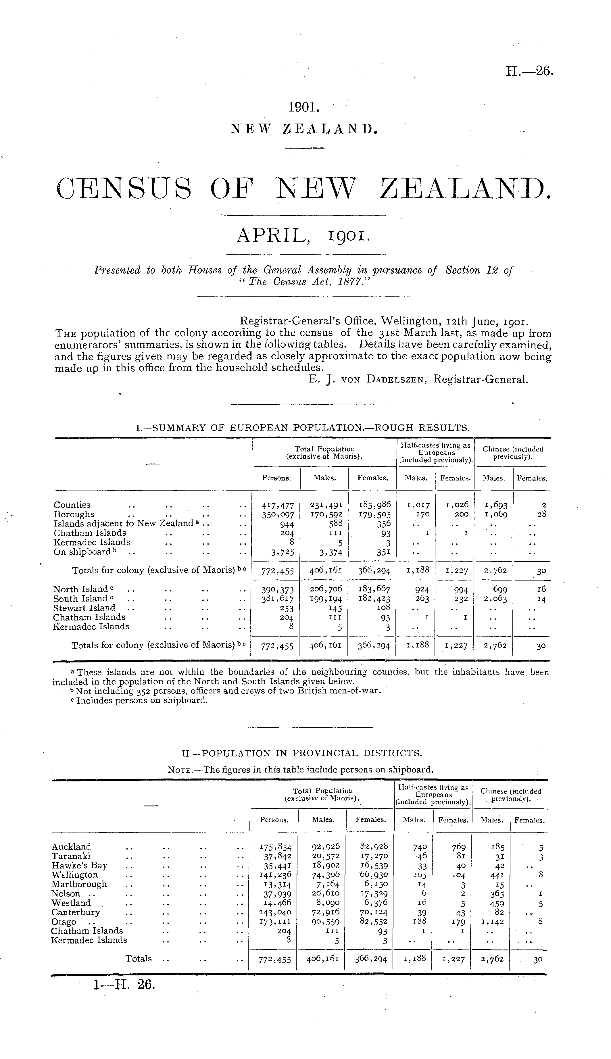 Registrar-General's Office, Wellington, 12th June, 1901. The population of the colony according to the census of the 31st March last, as made up from enumerators' summaries, is shown in the following tables. Details have been carefully examined, and the figures given may be regarded as closely approximate to the exact population now being made up in this office from the household schedules. E. J. yon Dadelszen, Registrar-General.