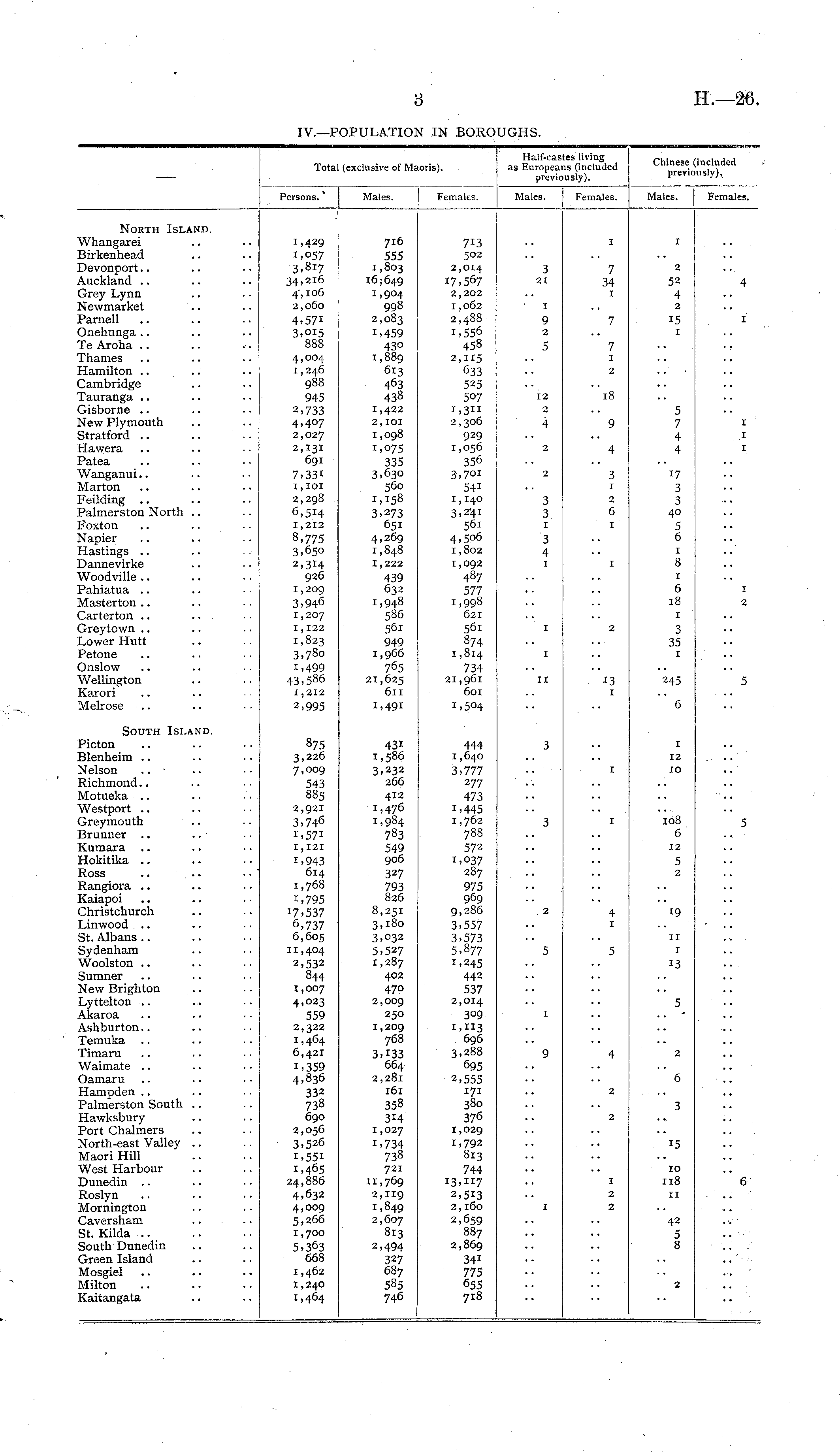 Total (exclusive of Maoris). Half-castes living as Europeans (included previously). Chinese (included previously). Persons. * Males. Females. Males. Females. Males. Females. North Island. Whangarei Birkenhead Devonport Auckland Grey Lynn Newmarket Parnell Onehunga Te Aroha Thames Hamilton Cambridge Tauranga Gisborne New Plymouth Stratford .. Hawera Patea Wanganui Marton Feilding Palmerston North .. Foxton Napier Hastings Dannevirke Woodville Pahiatua Masterton Carterton .. Greytown Lower Hutt Petone Onslow Wellington Karori Melrose 1,429 1,057 3,817 34,216 4, 106 2,060 4.57 1 3,015 888 4,004 1,246 988 945 2,733 4,407 2,027 2,131 691 7,33i 1,101 2,298 6,514 1,212 8,775 3,650 2,314 926 1,209 3,946 1,207 1,122 1,823 3.78o 1,499 43,586 1,212 2,995 716 555 1,803 i6;649 1,904 998 2,083 i,459 430 1,889 613 463 438 1,422 2,101 1,098 1,075 335 3,630 560 1,158 3,273 651 4,269 1,848 1,222 439 632 1,948 586 561 949 1,966 765 21,625 611 1,491 7 J 3 502 2,014 17.567 2,202 1,062 2,488 1,556 458 2,"5 633 525 507 1,311 2,306 929 1,056 356 3,701 54 1 1,140 3.241 561 4,506 1,802 i,og2 487 577 i,998 621 561 874 1,814 734 2i,g6i 601 3 21 I 9 2 5 12 2 4 2 2 i 7 34 i 7 7 i 2 18 9 4 3 i I 2 52 4 2 15 I 5 7 4 4 17 3 3 40 5 6 i 8 i 6 18 4 I I i I 3 3 i 2 6 I 3 4 i I i 2 i i 2 3 35 i i ii 13 i 245 5 1,504 6 South Island. 875 3,226 7,009 543 885 2,g2i 3,746 i,57i 1,121 i,943 614 1,768 i,795 17,537 6,737 6,605 11,404 2,532 844 1,007 4.023 559 2,322 1,464 6,421 1.359 4.836 332 738 690 2,056 3,526 i,55i 1,465 24,886 4,632 4,009 5,266 1,700 5,363 668 1,462 1,240 1,464 43i 1,586 3.232 266 412 1,476 1,984 783 549 906 327 793 826 8,251 3,180 3.032 5.527 1,287 402 470 2,oog 250 1,209 768 3.133 664 2,281 161 358 314 1,027 1.734 738 721 ".769 2,ng i,84g 2,607 813 2,494 327 687 585 746 444 1,640 3,777 277 473 1,445 1,762 788 572 1,037 287 975 969 g,286 3,557 3,573 5,877 1,245 442 537 2,014 3og 1,"3 696 3,288 695 2,555 171 380 376 1,029 1,792 813 744 13,"7 2,513 2,160 2,659 887 2,869 34i 775 655 718 3 i Picton Blenheim Nelson Richmond Motueka Westport Greymouth Brunner Kumara Hokitika i 12 10 3 i 108 6 5 12 5 2 Ross .. ... Rangiora Kaiapoi Christchurch Linwood St. Albans Sydenham Woolston 2 4 I 19 ii 5 5 I 13 Sumner New Brighton Lyttelton .. Akaroa Ashburton Temuka Timaru Waimate Oamaru Hampden Palmerston South .. Hawksbury Port Chalmers North-east Valley .. Maori Hill West Harbour Dunedin Roslyn Mornington Caversham St. Kilda South Dunedin Green Island Mosgiel Milton Kaitangata i 9 4 2 2 5 2 6 3 15 io n8 I 2 2 6 ii i 42 5 8 2