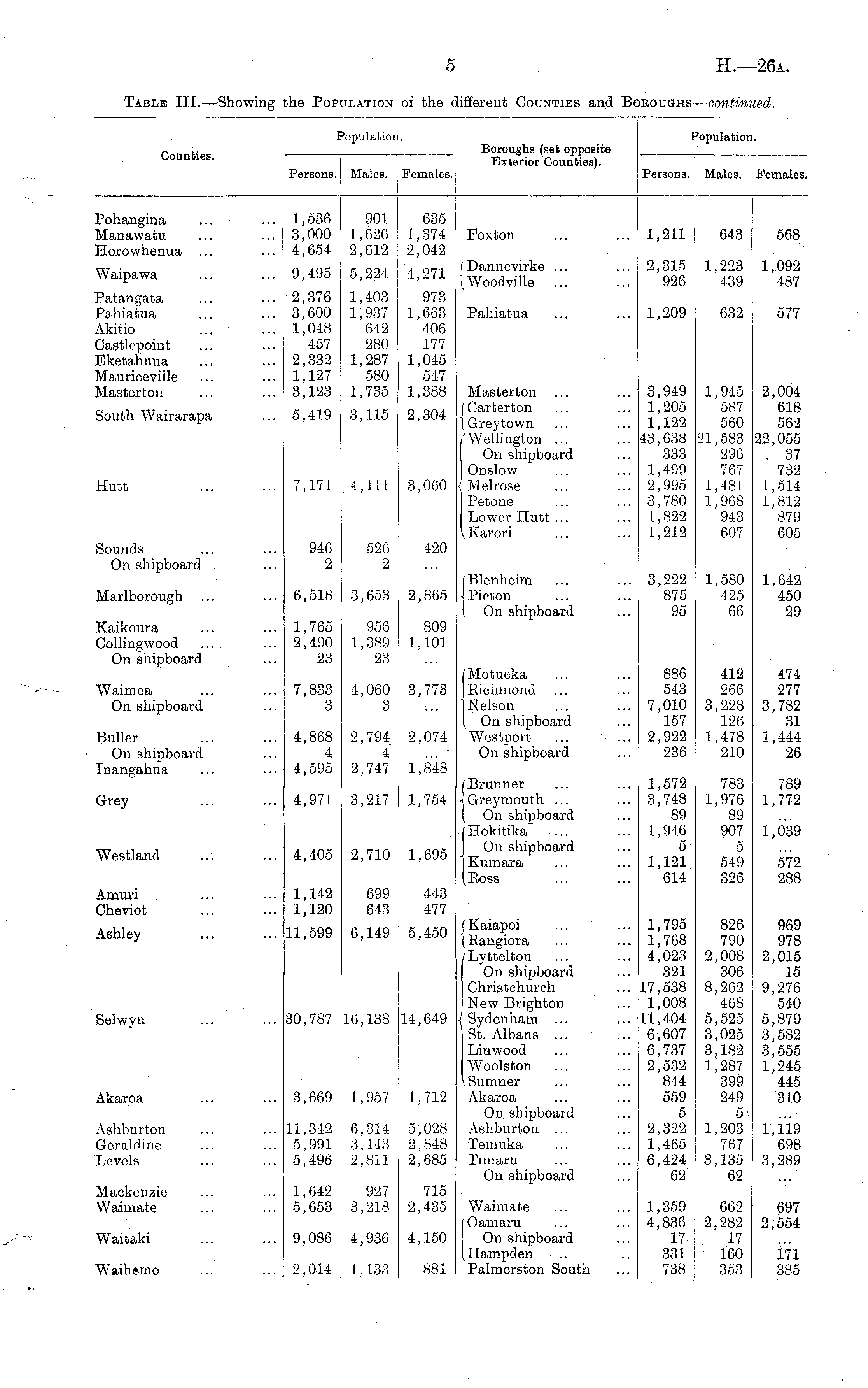 Population. Population. Counties. Boroughs (set opposite Exterior Counties). Persons. Males. Females. i Persons. Males. Female: Pohangina Manawatu Horowhenua ... 1,536 3,000 4,654 901 1,626 2,612 635 1,374 2,042 Foxton 1,211 643 568 Waipawa 9,495 5,224 4,271 j Dannevirke ... (Woodville 2,315 926 1,223 439 1,092 487 Patangata Pahiatua Akitio Castlepoint Eketahuna Mauriceville Master ton 2,376 3,600 1,048 457 2,332 1,127 3,123 1,403 1,937 642 280 1,287 580 1,735 973 1,663 406 177 1,045 547 1,388 Pahiatua 1,209 632 577 South Wairarapa 5,419 3,115 2,304 Masterton ( Carfcerton {Greytown ' Wellington ... On shipboard Onslow Melrose I Petone Lower Hutt ... \ Karori 3,949 1,205 1,122 43,638 333 1,499 2,995 3,780 1,822 1,212 1,945 587 560 21,583 296 767 1,481 1,968 943 607 2,004 618 562 22,055 . 37 732 1,514 1,812 879 605 Hutt 7,171 4,111 3,060 Sounds On shipboard 946 2 526 2 420 Marlborough ... 6,518 3,653 2,865 (Blenheim Pieton On shipboard 3,222 875 95 1,580 425 66 1,642 450 29 Kaikoura Collingwood On shipboard 1,765 2,490 23 956 1,389 23 809 1,101 886 543 7,010 157 2,922 236 Waimea On shipboard 7,833 3 4,060 3 3,773 Motueka Eichmond " Nelson On shipboard Westport On shipboard 412 266 3,228 126 1,478 210 474 277 3,782 31 1,444 26 Buller On shipboard Inangahua 4,868 4 4,595 2,794 4 2,747 2,074 1,848 1,572 3,748 89 1,946 5 1,121 614 783 1,976 89 907 5 549 326 789 1,772 Grey 4,971 3,217 1,754 I Brunner j Greymouth ... ( On shipboard [ Hokitika ... J On shipboard 4,405 2,710 1,039 Westland 1,695 572 288 jKumara (Boss Amuri Cheviot 1,142 1,120 699 643 443 477 Ashley Selwyn 11,599 6,149 5,450 ( Kaiapoi I Eangiora 'Lyttelton On shipboard Ghristchurch I New Brighton ■I Sydenham St. Albans ... Lin wood Woolston Sumner Akaroa On shipboard Ashburton Temuka Timaru On shipboard 1,795 1,768 4,023 321 17,538 1,008 11,404 6,607 6,737 2,532 844 559 5 2,322 1,465 6,424 62 826 790 2,008 306 8,262 468 5,525 3,025 3,182 1,287 399 249 5 1,203 767 3,135 62 969 978 2,015 15 9,276 540 5,879 3,582 3,555 1,245 445 310 30,787 16,138 14,649 Akaroa 3,669 1,957 1,712 Ashburton Geraldine Levels 11,342 5,991 5,496 6,314 3,143 2,811 5,028 2,848 2,685 1,119 698 3,289 Mackenzie Waimate 1,642 5,653 927 3,218 715 2,435 Waimate ("Oamaru \ On shipboard (Hampden Palmerston South 1,359 4,836 17 331 738 662 2,282 17 160 353 697 2,554 Waitaki 9,086 4,936 4,150 171 385 Waiheino 2,014 1,133 881