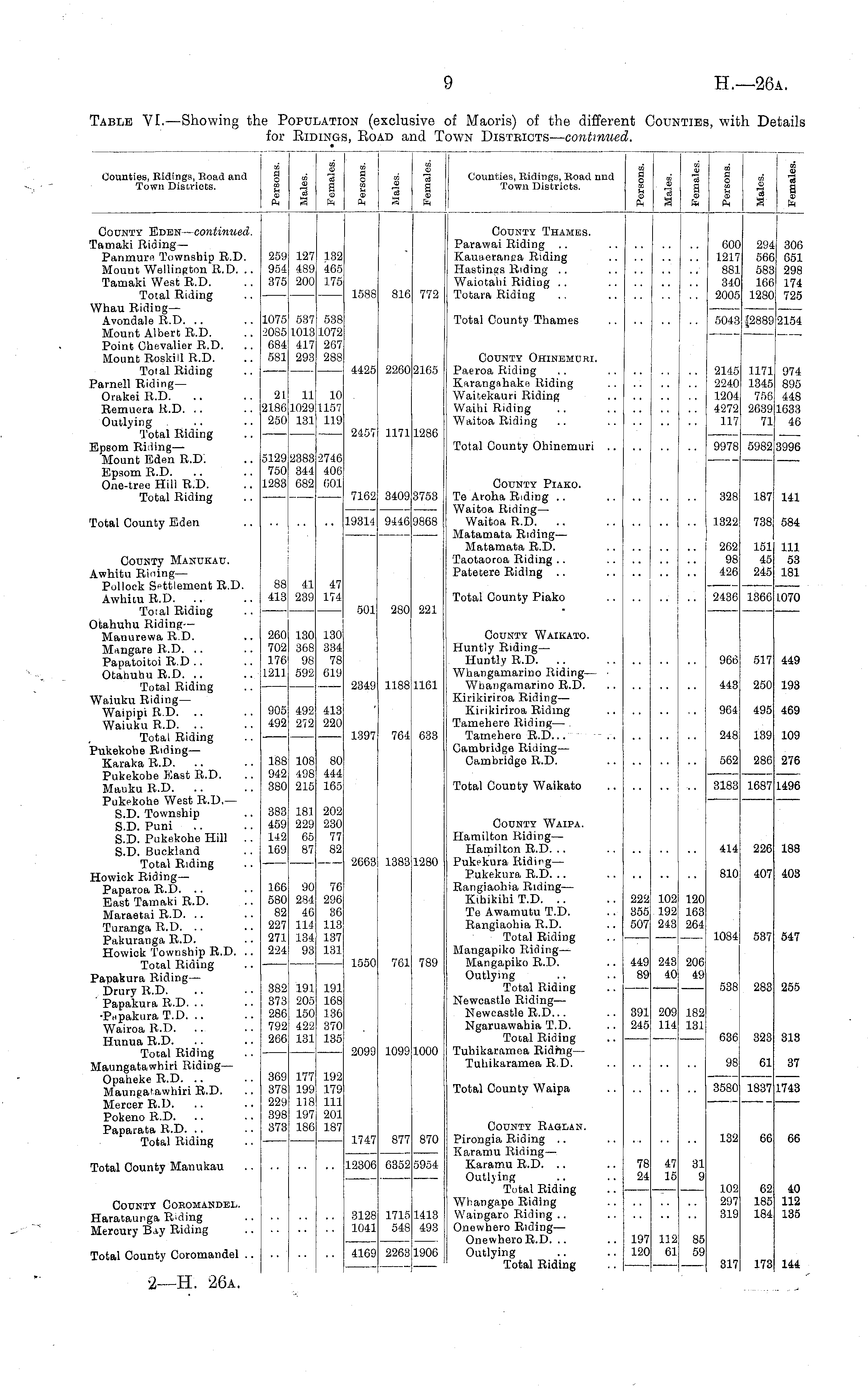 Table VI. —Showing the Population (exclusive of Maoris) of the different Counties, with Details for Ridings, Road and Town Districts— continued.
