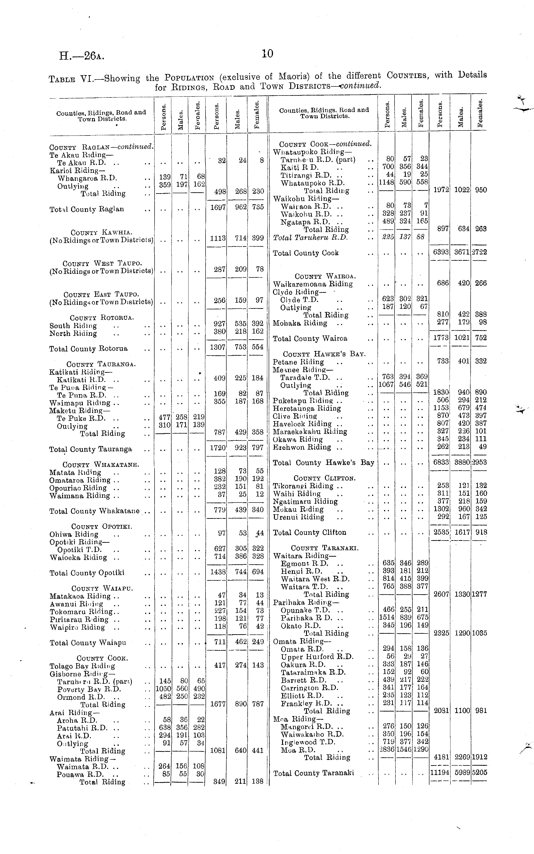 Table VI.—Showing the Population (exclusive of Maoris) of the different Counties, with Details for Ridings, Road and Town Districts— continued.