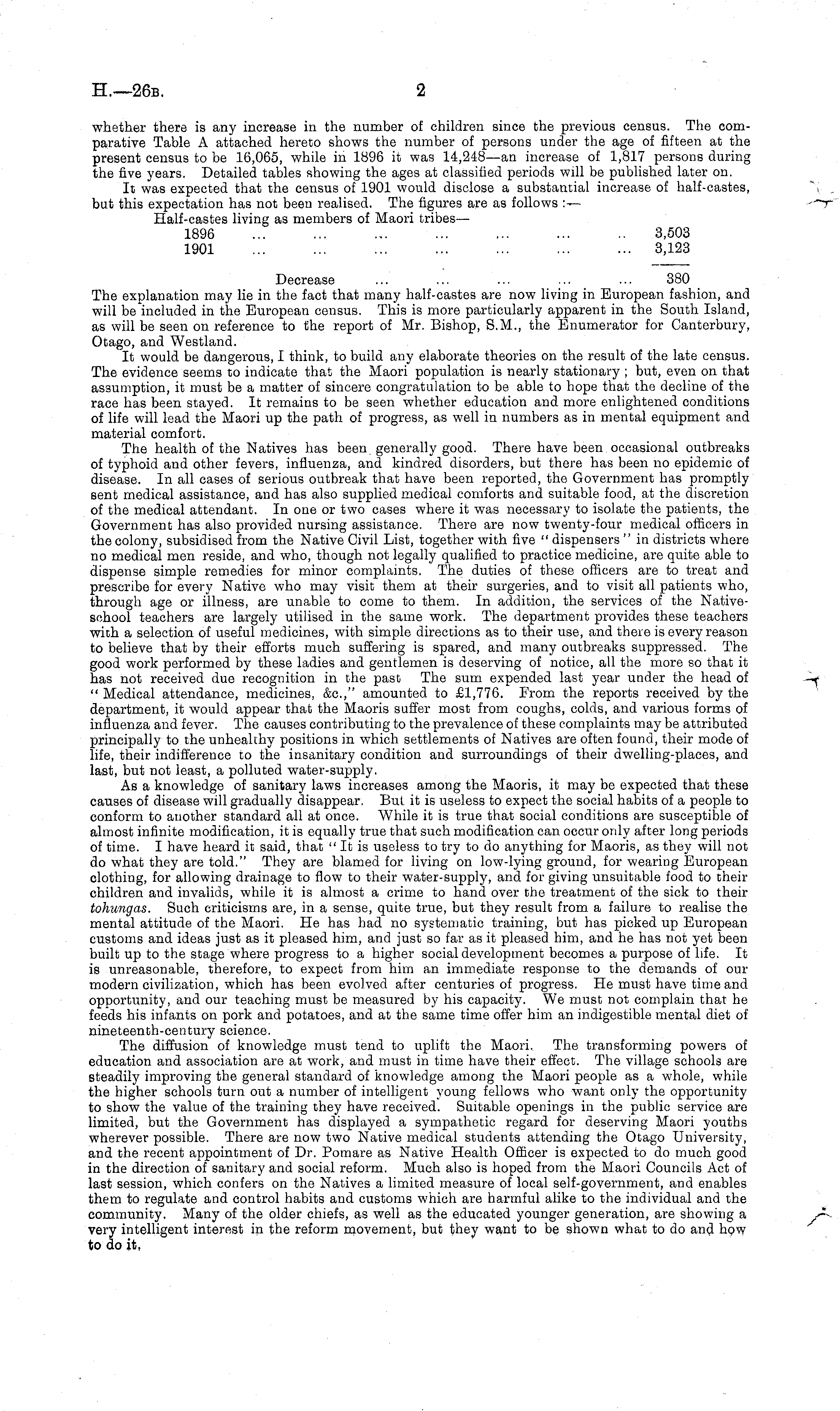 whether there is any increase in the number of children since the previous census. The comparative Table A attached hereto shows the number of persons under the age of fifteen at the present census to be 16,065, while in 1896 it was 14,248 —an increase of 1,817 persons during the five years. Detailed tables showing the ages at classified periods will be published later on. It was expected that the census of 1901 would disclose a substantial increase of half-castes, but this expectation has not been realised. The figures are as follows :— Half-castes living as members of Maori tribes— 1896 ... ... ~. ... ... ... .. 3,503 1901 3,123 Decrease ... ... ... ... ... 380 The explanation may lie in the fact that many half-castes are now living in European fashion, and will be included in the European census. This is more particularly apparent in the South Island, as will be seen on reference to the report of Mr. Bishop, S.M., the Enumerator for Canterbury, Otago, and Westland. It would be dangerous, I think, to build any elaborate theories on the result of the late census. The evidence seems to indicate that the Maori population is nearly stationary ; but, even on that assumption, it must be a matter of sincere congratulation to be able to hope that the decline of the race has been stayed. It remains to be seen whether education and more enlightened conditions of life will lead the Maori up the path of progress, as well in numbers as in mental equipment and material comfort. The health of the Natives has been generally good. There have been occasional outbreaks of typhoid and other fevers, influenza, and kindred disorders, but there has been no epidemic of disease. In all cases of serious outbreak that have been reported, the Government has promptly sent medical assistance, and has also supplied medical comforts and suitable food, at the discretion of the medical attendant. In one or two cases where it was necessary to isolate the patients, the Government has also provided nursing assistance. There are now twenty-four medical officers in the colony, subsidised from the Native Civil List, together with five " dispensers " in districts where no medical men reside, and who, though not legally qualified to practice medicine, are quite able to dispense simple remedies for minor complaints. The duties of these officers are to treat and prescribe for every Native who may visit them at their surgeries, and to visit all patients who, through age or illness, are unable to come to them. In addition, the services of the Nativeschool teachers are largely utilised in the same work. The department provides these teachers with a selection of useful medicines, with simple directions as to their use, and there is every reason to believe that by their efforts much suffering is spared, and many outbreaks suppressed. The good work performed by these ladies and gentlemen is deserving of notice, all the more so that it has not received due recognition in the past The sum expended last year under the head of " Medical attendance, medicines, &c," amounted to £1,776. From the reports received by the department, it would appear that the Maoris suffer most from coughs, colds, and various forms of influenza and fever. The causes contributing to the prevalence of these complaints may be attributed principally to the unhealthy positions in which settlements of Natives are often found, their mode of life, their indifference to the insanitary condition and surroundings of their dwelling-places, and last, but not least, a polluted water-supply. As a knowledge of sanitary laws increases among the Maoris, it may be expected that these causes of disease will gradually disappear. Bui. it is useless to expect the social habits of a people to conform to another standard all at once. While it is true that social conditions are susceptible of almost infinite modification, it is equally true that such modification can occur only after long periods of time. I have heard it said, that "It is useless to try to do anything for Maoris, as they will not do what they are told." They are blamed for living on low-lying ground, for wearing European clothing, for allowing drainage to flow to their water-supply, and for giving unsuitable food to their children and invalids, while it is almost a crime to hand over the treatment of the sick to their tohungas. Such criticisms are, in a sense, quite true, but they result from a failure to realise the mental attitude of the Maori. He has had no systematic training, but has picked up European customs and ideas just as it pleased him, and just so far as it pleased him, and he has not yet been built up to the stage where progress to a higher social development becomes a purpose of life. It is unreasonable, therefore, to expect from him an immediate response to the demands of our modern civilization, which has been evolved after centuries of progress. He must have time and opportunity, and our teaching must be measured by his capacity. We must not complain that he feeds his infants on pork and potatoes, and at the same time offer him an indigestible mental diet of nineteenth-century science. The diffusion of knowledge must tend to uplift the Maori. The transforming powers of education and association are at work, and must in time have their effect. The village schools are steadily improving the general standard of knowledge among the Maori people as a whole, while the higher schools turn out a number of intelligent young fellows who want only the opportunity to show the value of the training they have received. Suitable openings in the public service are limited, but the Government has displayed a sympathetic regard for deserving Maori youths wherever possible. There are now two Native medical students attending the Otago University, and the recent appointment of Dr. Pomare as Native Health Officer is expected to do much good in the direction of sanitary and social reform. Much also is hoped from the M