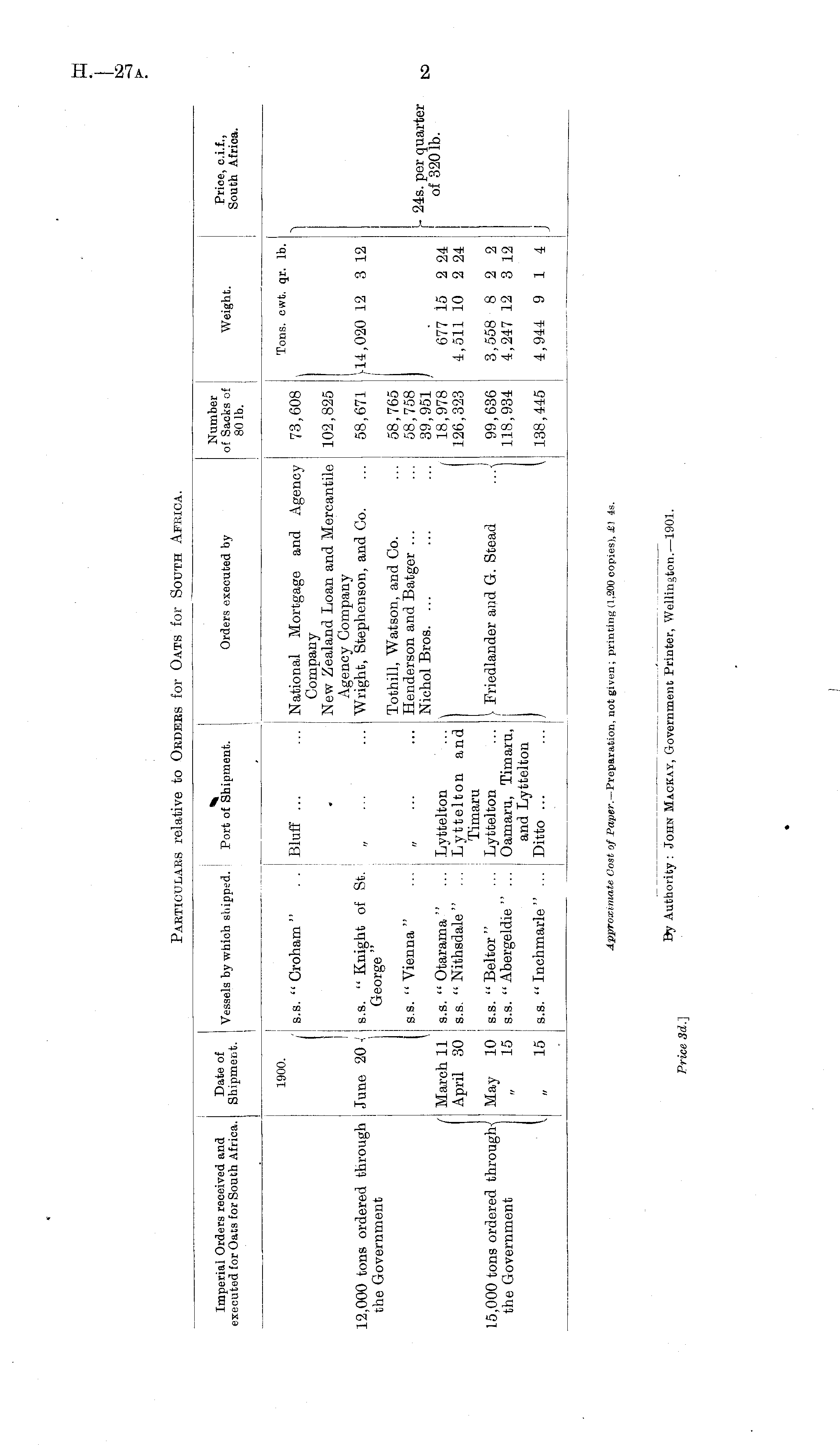 Imperial Orders received and executed for Oats for South Africa. Date of Shipment. Vessels by which shipped. Port of Shipment. Orders executed by Number of Sacks of 801b. Weight. Prioe, c.i.f., South Africa. 12,000 tons ordered through the Government 1900. / s.s. " Croham " . . Bluff ... June 20,' s.s. "Knight of St. „ George " s.s. " Vienna" ... „ March 11 s.s. " Otararna " ... Lyttelton April 30 s.s. " Nithsdale " ... Lyttelton and Timaru May 10 s.s. "Beltor" ... j Lyttelton „ 15 s.s. " Abergeldie " ... Oamaru, Timaru, and Lyttelton „ 15 s.s. " Inchmarle" ... Ditto ... rational Mortgage and Agency Company lew Zealand Loan and Mercantile Agency Company bright, Stephenson, and Co. "othill, Watson, and Co. lenderson and Batger ... fichol Bros. ... ( 73,608 102,825 58,671 58,765 58,758 39,951 18,978 126,323 Tons. cwt. qr. lb. 14,020 12 3 12 677 15 2 24 4,511 10 2 24 24s. per quarte: of 320 lb. 15,000 tons ordered throughthe Government Friedlander and G. Stead ..J 99,636 118,934 3,558 8 2 2 4,247 12 3 12 138, 445 4,944 9 14