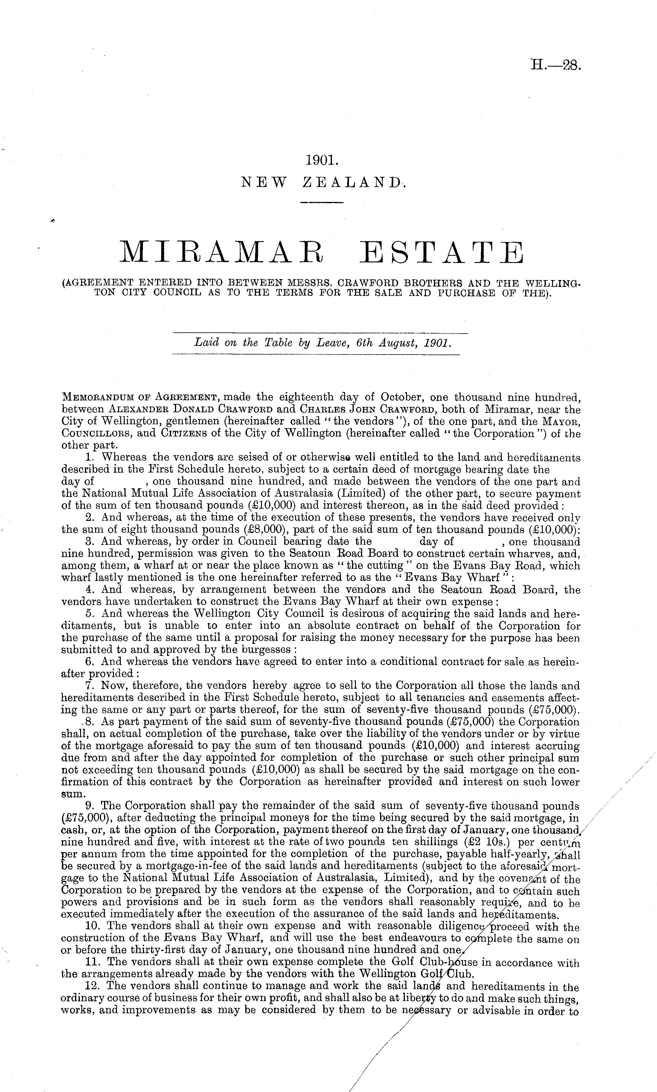 MIRAMAR ESTATE (AGREEMENT ENTERED INTO BETWEEN MESSRS. CRAWFORD BROTHERS AND THE WELLINGTON CITY COUNCIL AS TO THE TERMS FOR THE SALE AND PURCHASE OF THE).