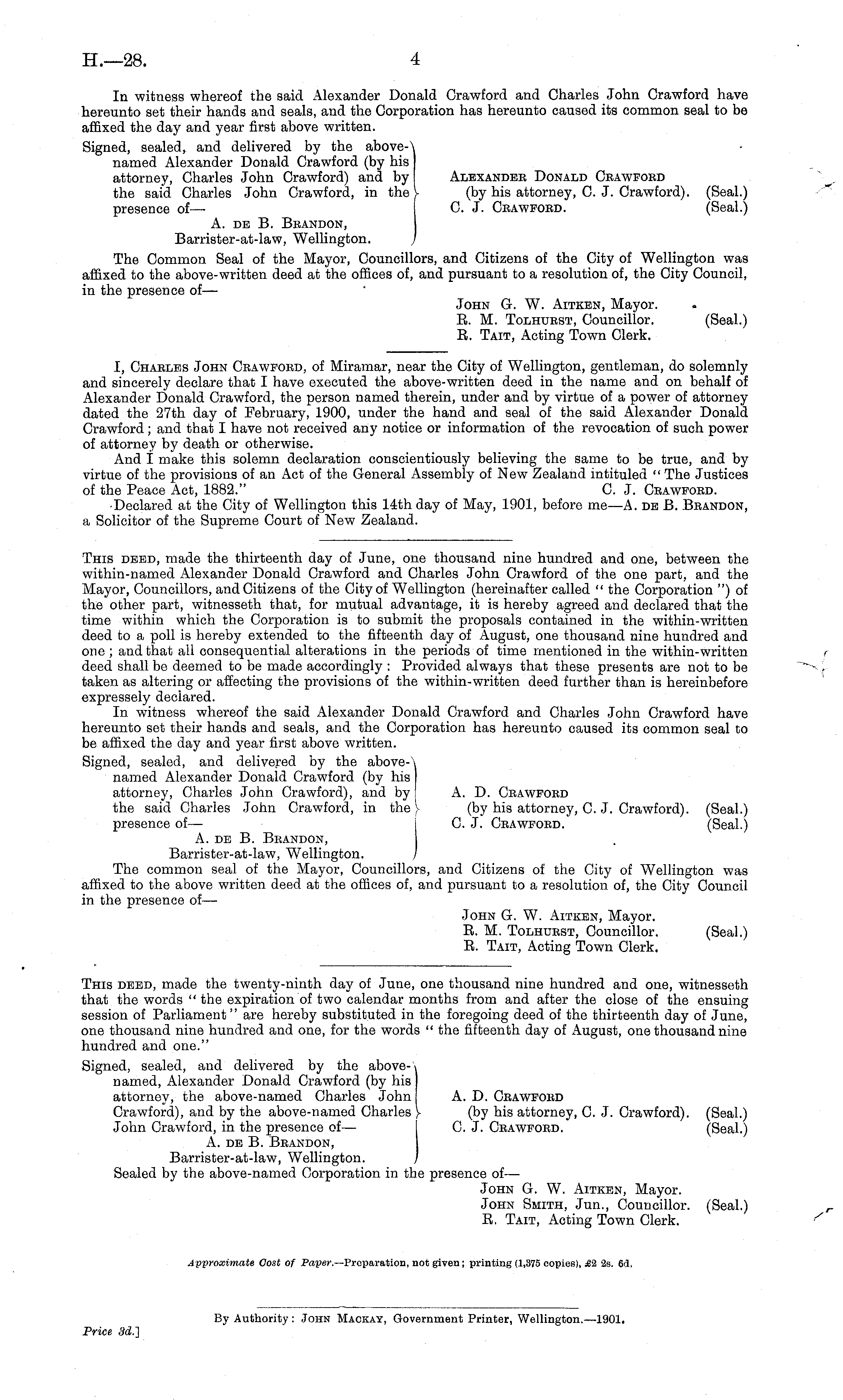 In witness whereof the said Alexander Donald Crawford and Charles John Crawford have hereunto set their hands and seals, and the Corporation has hereunto caused its common seal to be affixed the day and year first above written. Signed, sealed, and delivered by the named Alexander Donald Crawford (by his attorney, Charles John Crawford) and by Alexandee Donald Ceawfobd the said Charles John Crawford, in the V (by his attorney, C. J. Crawford). (Seal.) presence of — C. J. Ceawfobd. (Seal.) A. de B. Beandon, Barrister-at-law, Wellington. J The Common Seal of the Mayor, Councillors, and Citizens of the City of Wellington was affixed to the above-written deed at the offices of, and pursuant to a resolution of, the City Council, in the presence of — John G. W. Aitken, Mayor. B. M. Tolhuest, Councillor. (Seal.) B. Tait, Acting Town Clerk.