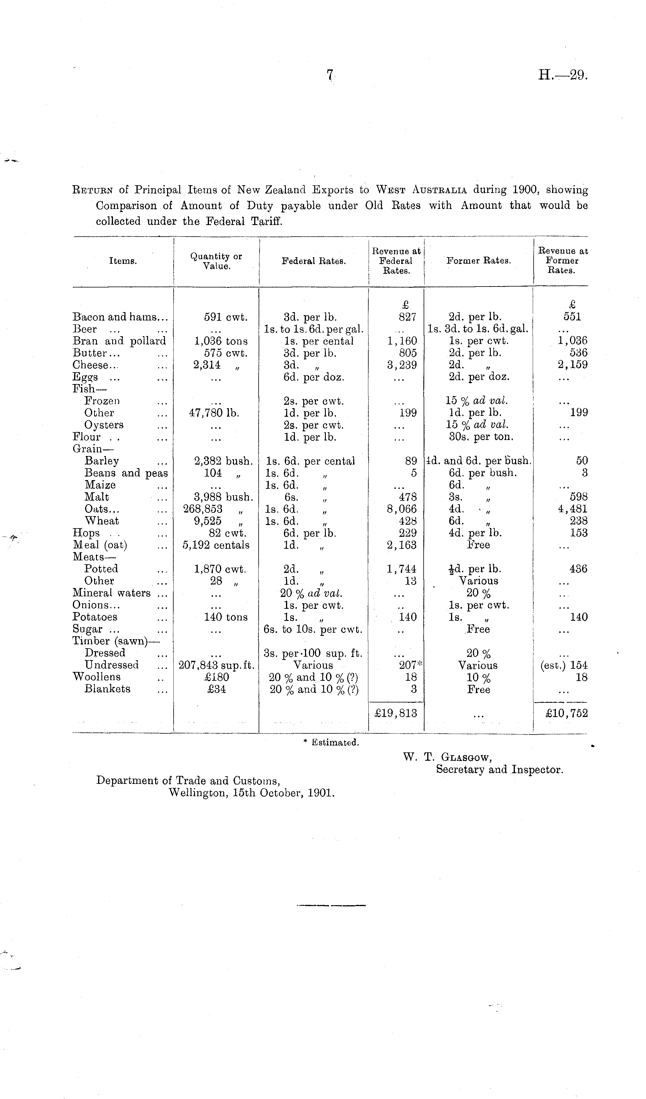 W. T. Glasgow, Secretary and Inspector. Department of Trade and Customs, Wellington, 15th October, 1901.