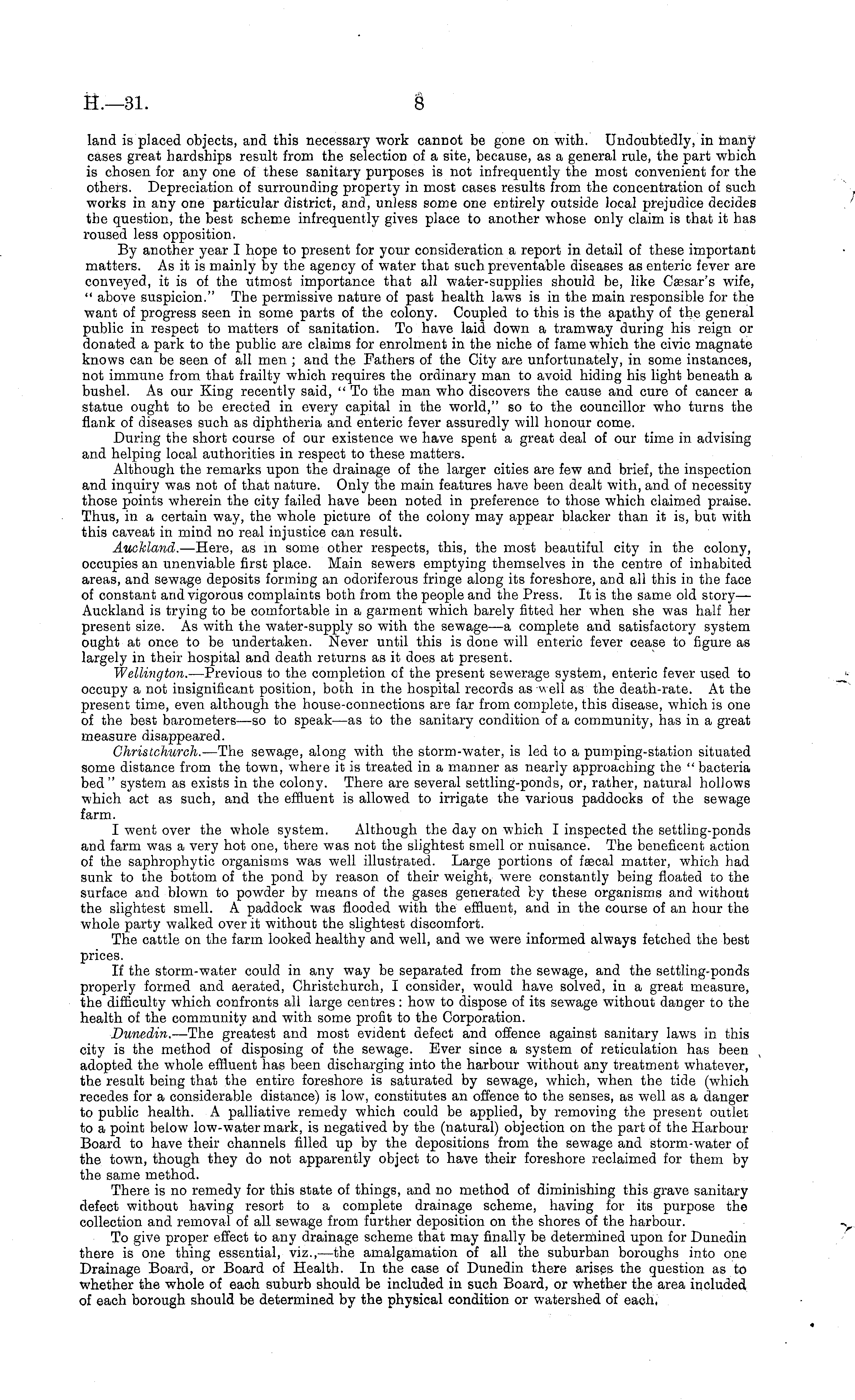 land is placed objects, and this necessary work cannot be gone on with. Undoubtedly, in many cases great hardships result from the selection of a site, because, as a general rule, the part which is chosen for any one of these sanitary purposes is not infrequently the most convenient for the others. Depreciation of surrounding property in most cases results from the concentration of such works in any one particular district, and, unless some one entirely outside local prejudice decides the question, the best scheme infrequently gives place to another whose only claim is that it has roused less opposition. By another year I hope to present for your consideration a report in detail of these important matters. As it is mainly by the agency of water that such preventable diseases as enteric fever are conveyed, it is of the utmost importance that all water-supplies should be, like Caesar's wife, " above suspicion." The permissive nature of past health laws is in the main responsible for the want of progress seen in some parts of the colony. Coupled to this is the apathy of the general public in respect to matters of sanitation. To have laid down a tramway during his reign or donated a park to the public are claims for enrolment in the niche of fame which the civic magnate knows can be seen of all men ; and the Fathers of the City are unfortunately, in some instances, not immune from that frailty which requires the ordinary man to avoid hiding his light beneath a bushel. As our King recently said, "To the man who discovers the cause and cure of cancer a statue ought to be erected in every capital in the world," so to the councillor who turns the flank of diseases such as diphtheria and enteric fever assuredly will honour come. During the short course of our existence we have spent a great deal of our time in advising and helping local authorities in respect to these matters. Although the remarks upon the drainage of the larger cities are few and brief, the inspection and inquiry was not of that nature. Only the main features have been dealt with, and of necessity those points wherein the city failed have been noted in preference to those which claimed praise. Thus, in a certain way, the whole picture of the colony may appear blacker than it is, but with this caveat in mind no real injustice can result. Auckland. —Here, as in some other respects, this, the most beautiful city in the colony, occupies an unenviable first place. Main sewers emptying themselves in the centre of inhabited areas, and sewage deposits forming an odoriferous fringe along its foreshore, and all this in the face of constant and vigorous complaints both from the people and the Press. It is the same old story — Auckland is trying to be comfortable in a garment which barely fitted her when she was half her present size. As with the water-supply so with the sewage—a complete and satisfactory system ought at once to be undertaken. Never until this is done will enteric fever cease to figure as largely in their hospital and death returns as it does at present. Wellington. —Previous to the completion of the present sewerage system, enteric fever used to occupy a not insignificant position, both in the hospital records as well as the death-rate. At the present time, even although the house-connections are far from complete, this disease, which is one of the best barometers—so to speak—as to the sanitary condition of a community, has in a great measure disappeared. Christchurch. —The sewage, along with the storm-water, is led to a pumping-station situated some distance from the town, where it is treated in a manner as nearly approaching the " bacteria bed" system as exists in the colony. There are several settling-ponds, or, rather, natural hollows which act as such, and the effluent is allowed to irrigate the various paddocks of the sewage farm. I went over the whole system. Although the day on which I inspected the settling-ponds and farm was a very hot one, there was not the slightest smell or nuisance. The beneficent action of the saphrophytic organisms was well illustrated. Large portions of faecal matter, which had sunk to the bottom of the pond by reason of their weight, were constantly being floated to the surface and blown to powder by means of the gases generated by these organisms and without the slightest smell. A paddock was flooded with the effluent, and in the course of an hour the whole party walked over it without the slightest discomfort. The cattle on the farm looked healthy and well, and we were informed always fetched the best prices. If the storm-water could in any way be separated from the sewage, and the settling-ponds properly formed and aerated, Christchurch, I consider, would have solved, in a great measure, the difficulty which confronts all large centres: how to dispose of its sewage without danger to the health of the community and with some profit to the Corporation. Dunedin. —The greatest and most evident defect and offence against sanitary laws in this city is the method of disposing of the sewage. Ever since a system of reticulation has been adopted the whole effluent has been discharging into the harbour without any treatment whatever, the result being that the entire foreshore is saturated by sewage, which, when the tide (which recedes for a considerable distance) is low, constitutes an offence to the senses, as well as a danger to public health. A palliative remedy which could be applied, by removing the present outlet to a point below low-watermark, is negatived by the (natural) objection on the part of the Harbour Board to have their channels filled up by the depositions from the sewage and storm-water of the town, though they do not apparently object to have their foreshore reclaimed for them by the same method. There is no remedy for this state of things, and no method of diminishing this grave sanitary defect without having resort to a complete drainage scheme, having for its