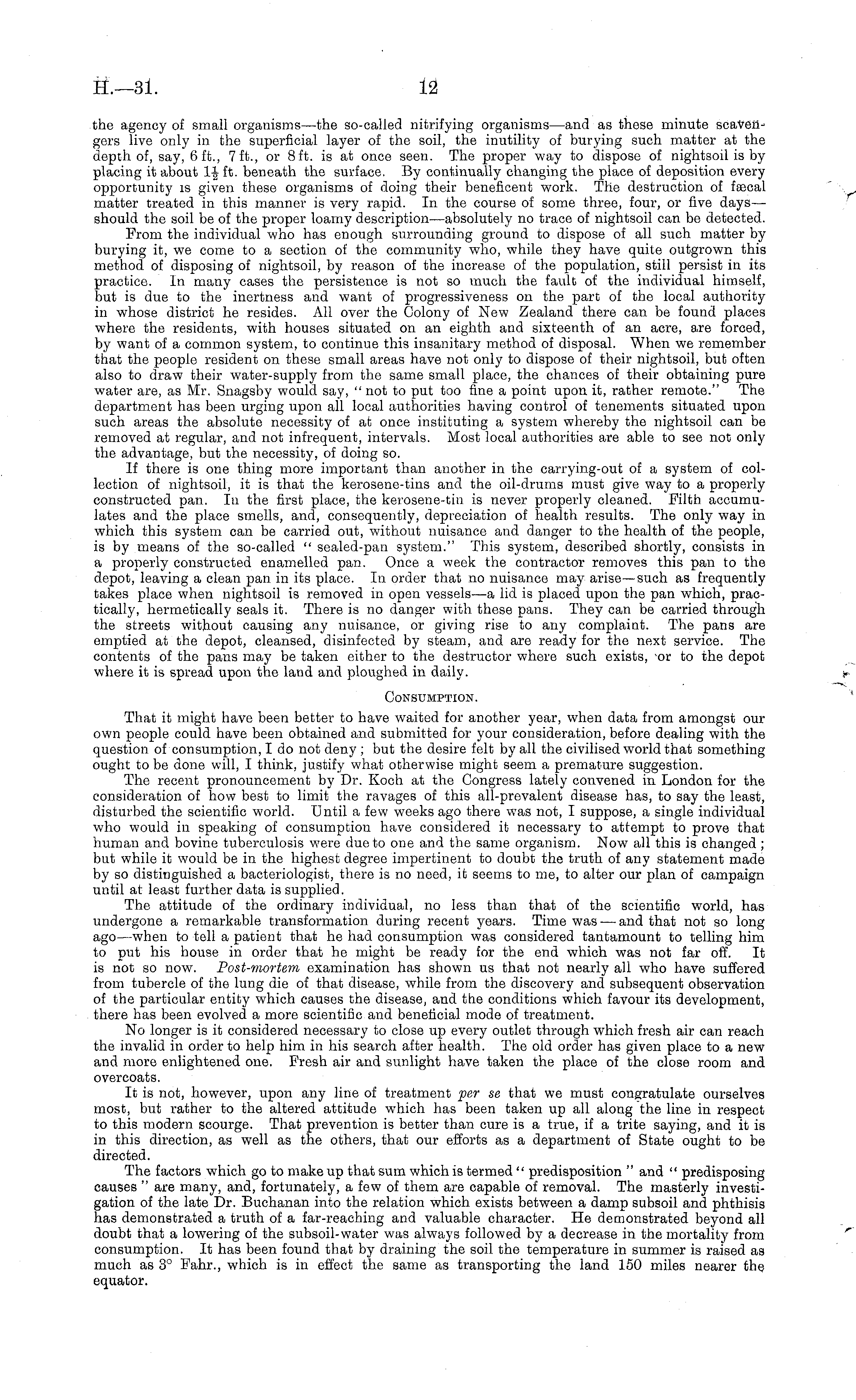 the agency of small organisms—the so-called nitrifying organisms—and as these minute scavengers live only in the superficial layer of the soil, the inutility of burying such matter at the depth of, say, 6 ft., 7 ft., or 8 ft. is at once seen. The proper way to dispose of nightsoil is by placing it about If it. beneath the surface. By continually changing the place of deposition every opportunity is given these organisms of doing their beneficent work. The destruction of faacal matter treated in this manner is very rapid. In the course of some three, four, or five days— should the soil be of the proper loamy description —absolutely no trace of nightsoil can be detected. From the individual who has enough surrounding ground to dispose of all such matter by burying it, we come to a section of the community who, while they have quite outgrown this method of disposing of nightsoil, by reason of the increase of the population, still persist in its practice. In many cases the persistence is not so much the fault of the individual himself, But is due to the inertness and want of progressiveness on the part of the local authority in whose district he resides. All over the Colony of New Zealand there can be found places where the residents, with houses situated on an eighth and sixteenth of an acre, are forced, by want of a common system, to continue this insanitary method of disposal. When we remember that the people resident on these small areas have not only to dispose of their nightsoil, but often also to draw their water-supply from the same small place, the chances of their obtaining pure water are, as Mr. Snagsby would say, " not to put too fine a point upon it, rather remote." The department has been urging upon all local authorities having control of tenements situated upon such areas the absolute necessity of at once instituting a system whereby the nightsoil can be removed at regular, and not infrequent, intervals. Most local authorities are able to see not only the advantage, but the necessity, of doing so. If there is one thing more important than another in the carrying-out of a system of collection of nightsoil, it is that the kerosene-tins and the oil-drums must give way to a properly constructed pan. In the first place, the kerosene-tin is never properly cleaned. Filth accumulates and the place smells, and, consequently, depreciation of health results. The only way in which this system can be carried out, without nuisance and danger to the health of the people, is by means of the so-called " sealed-pan system." This system, described shortly, consists in a properly constructed enamelled pan. Once a week the contractor removes this pan to the depot, leaving a clean pan in its place. In order that no nuisance may arise—such as frequently takes place when nightsoil is removed in open vessels—a lid is placed upon the pan which, practically, hermetically seals it. There is no danger with these pans. They can be carried through the streets without causing any nuisance, or giving rise to any complaint. The pans are emptied at the depot, cleansed, disinfected by steam, and are ready for the next service. The contents of the pans may be taken either to the destructor where such exists, or to the depot where it is spread upon the land and ploughed in daily. Consumption. That it might have been better to have waited for another year, when data from amongst our own people could have been obtained and submitted for your consideration, before dealing with the question of consumption, I do not deny ; but the desire felt by all the civilised world that something ought to be done will, I think, justify what otherwise might seem a premature suggestion. The recent pronouncement by Dr. Koch at the Congress lately convened in London for the consideration of how best to limit the ravages of this all-prevalent disease has, to say the least, disturbed the scientific world. Until a few weeks ago there was not, I suppose, a single individual who would in speaking of consumption have considered it necessary to attempt to prove that human and bovine tuberculosis were due to one and the same organism. Now all this is changed ; but while it would be in the highest degree impertinent to doubt the truth of any statement made by so distinguished a bacteriologist, there is no need, it seems to me, to alter our plan of campaign until at least further data is supplied. The attitude of the ordinary individual, no less than that of the scientific world, has undergone a remarkable transformation during recent years. Time was — and that not so long ago —when to tell a patient that he had consumption was considered tantamount to telling him to put his house in order that he might be ready for the end which was not far off. It is not so now. Post-mortem examination has shown us that not nearly all who have suffered from tubercle of the lung die of that disease, while from the discovery and subsequent observation of the particular entity which causes the disease, and the conditions which favour its development, there has been evolved a more scientific and beneficial mode of treatment. No longer is it considered necessary to close up every outlet through which fresh air can reach the invalid in order to help him in his search after health. The old order has given place to a new and more enlightened one. Fresh air and sunlight have taken the place of the close room and overcoats. It is not, however, upon any line of treatment per se that we must congratulate ourselves most, but rather to the altered attitude which has been taken up all along the line in respect to this modern scourge. That prevention is better than cure is a true, if a trite saying, and it is in this direction, as well as the others, that our efforts as a department of State ought to be directed. The factors which go to make up that sum which is termed " predisposition " and " predisposing causes " are many, and, fortunately, a few of them ar
