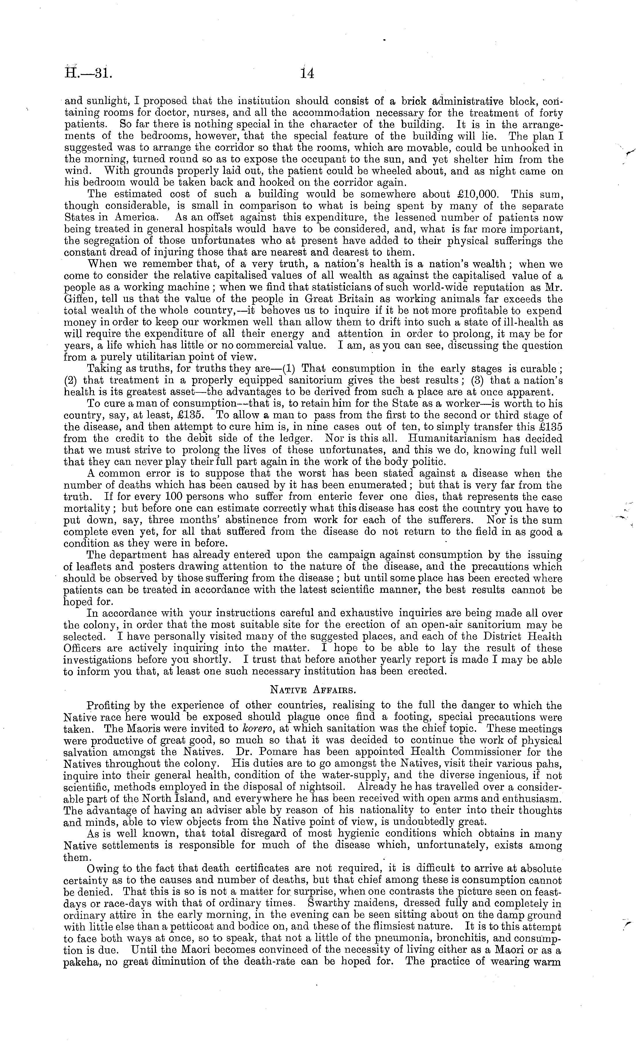 and sunlight, I proposed that the institution should consist of a brick administrative block, taining rooms for doctor, nurses, and all the accommodation necessary for the treatment of forty patients. So far there is nothing special in the character of the building. It is in the arrangements of the bedrooms, however, that the special feature of the building will lie. The plan I suggested was to arrange the corridor so that the rooms, which are movable, could be unhooked in the morning, turned round so as to expose the occupant to the sun, and yet shelter him from the wind. With grounds properly laid out, the patient could be wheeled about, and as night came on his bedroom would be taken back and hooked on the corridor again. The estimated cost of such a building would be somewhere about £10,000. This sum, though considerable, is small in comparison to what is being spent by many of the separate States in America. As an offset against this expenditure, the lessened number of patients now being treated in general hospitals would have to be considered, and, what is far more important, the segregation of those unfortunates who at present have added to their physical sufferings the constant dread of injuring those that are nearest and dearest to them. When we remember that, of a very truth, a nation's health is a nation's wealth ; when we come to consider the relative capitalised values of all wealth as against the capitalised value of a people as a working machine ; when we find that statisticians of such world-wide reputation as Mr. Giffen, tell us that the value of the people in Great Britain as working animals far exceeds the total wealth of the whole country,—it behoves us to inquire if it be not more profitable to expend money in order to keep our workmen well than allow them to drift into such a state of ill-health as will require the expenditure of all their energy and attention in order to prolong, it may be for years, a life which has little or no commercial value. I am, as you can see, discussing the question from a purely utilitarian point of view. Taking as truths, for truths they are —(1) That consumption in the early stages is curable ; (2) that treatment in a properly equipped sanitorium gives the best results; (3) that a nation's health is its greatest asset—the advantages to be derived from such a place are at once apparent. To cure a man of consumption—that is, to retain him for the State as a worker—is worth to his country, say, at least, £135. To allow a man to pass from the first to the second or third stage of the disease, and then attempt to cure him is, in nine cases out of ten, to simply transfer this £135 from the credit to the debit side of the ledger. Nor is this all. Humanitarianism has decided that we must strive to prolong the lives of these unfortunates, and this we do, knowing full well that they can never play their full part again in the work of the body politic. A common error is to suppose that the worst has been stated against a disease when the number of deaths which has been caused by it has been enumerated; but that is very far from the truth. If for every 100 persons who suffer from enteric fever one dies, that represents the case mortality ; but before one can estimate correctly what this disease has cost the country you have to put down, say, three months' abstinence from work for each of the sufferers. Nor is the sum complete even yet, for all that suffered from the disease do not return to the field in as good a condition as they were in before. The department has already entered upon the campaign against consumption by the issuing of leaflets and posters drawing attention to the nature of the disease, and the precautions which should be observed by those suffering from the disease ; but until some place has been erected where patients can be treated in accordance with the latest scientific manner, the best results cannot be hoped for. In accordance with your instructions careful and exhaustive inquiries are being made all over the colony, in order that the most suitable site for the erection of an open-air sanitorium may be selected. I have personally visited many of the suggested places, and each of the District Health Officers are actively inquiring into the matter. I hope to be able to lay the result of these investigations before you shortly. I trust that before another yearly report is made I may be able to inform you that, at least one such necessary institution has been erected. Native Apfaies. Profiting by the experience of other countries, realising to the full the danger to which the Native race here would be exposed should plague once find a footing, special precautions were taken. The Maoris were invited to korero, at which sanitation was the chief topic. These meetings were productive of great good, so much so that it was decided to continue the work of physical salvation amongst the Natives. Dr. Pomare has been appointed Health Commissioner for the Natives throughout the colony. His duties are to go amongst the Natives, visit their various pahs, inquire into their general health, condition of the water-supply, and the diverse ingenious, if not scientific, methods employed in the disposal of nightsoil. Already he has travelled over a considerable part of the North Island, and everywhere he has been received with open arms and enthusiasm. The advantage of having an adviser able by reason of his nationality to enter into their thoughts and minds, able to view objects from the Native point of view, is undoubtedly great. As is well known, that total disregard of most hygienic conditions which obtains in many Native settlements is responsible for much of the disease which, unfortunately, exists among them. Owing to the fact that death certificates are not required, it is difficult to arrive at absolute certainty as to the causes and number of deaths, but that chief among these is consumption cannot be denied. That this is so
