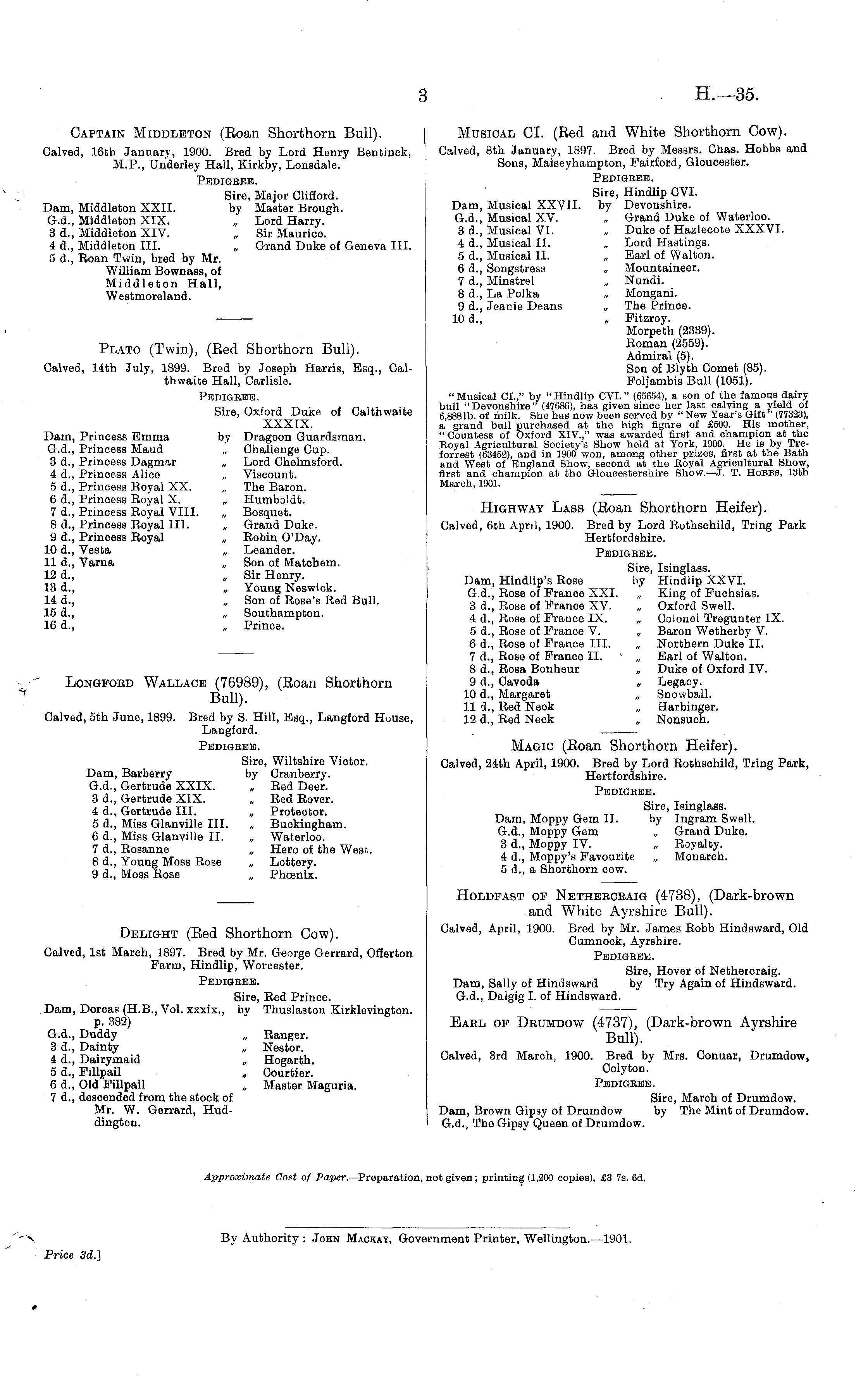 Highway Lass (Boan Shorthorn Heifer). Calved, 6th April, 1900. Bred by Lord Rothschild, Tring Park Hertfordshire. Pedigeee. Sire, Isinglass. Dam, Hindlip's Rose by Hindlip XXVI. G.d., Rose of France XXI. „ King of Fuchsias. 3 d., Rose of France XV. „ Oxford Swell. 4 d., Rose of France IX. „ Colonel Tregunter IX. 5 d., Rose of France V. „ Baron Wetherby V. 6 d., Rose of France 111. „ Northern Duke 11. 7 d., Rose of Prance 11. ' „ Earl of Walton. 8 d., Rosa Bonheur „ Duke of Oxford IV. 9 d., Cavoda ~ Legaoy. 10 d., Margaret „ Snowball. 11 d., Red Neck „ Harbinger. 12 d., Red Neck „ Nonsuoh.